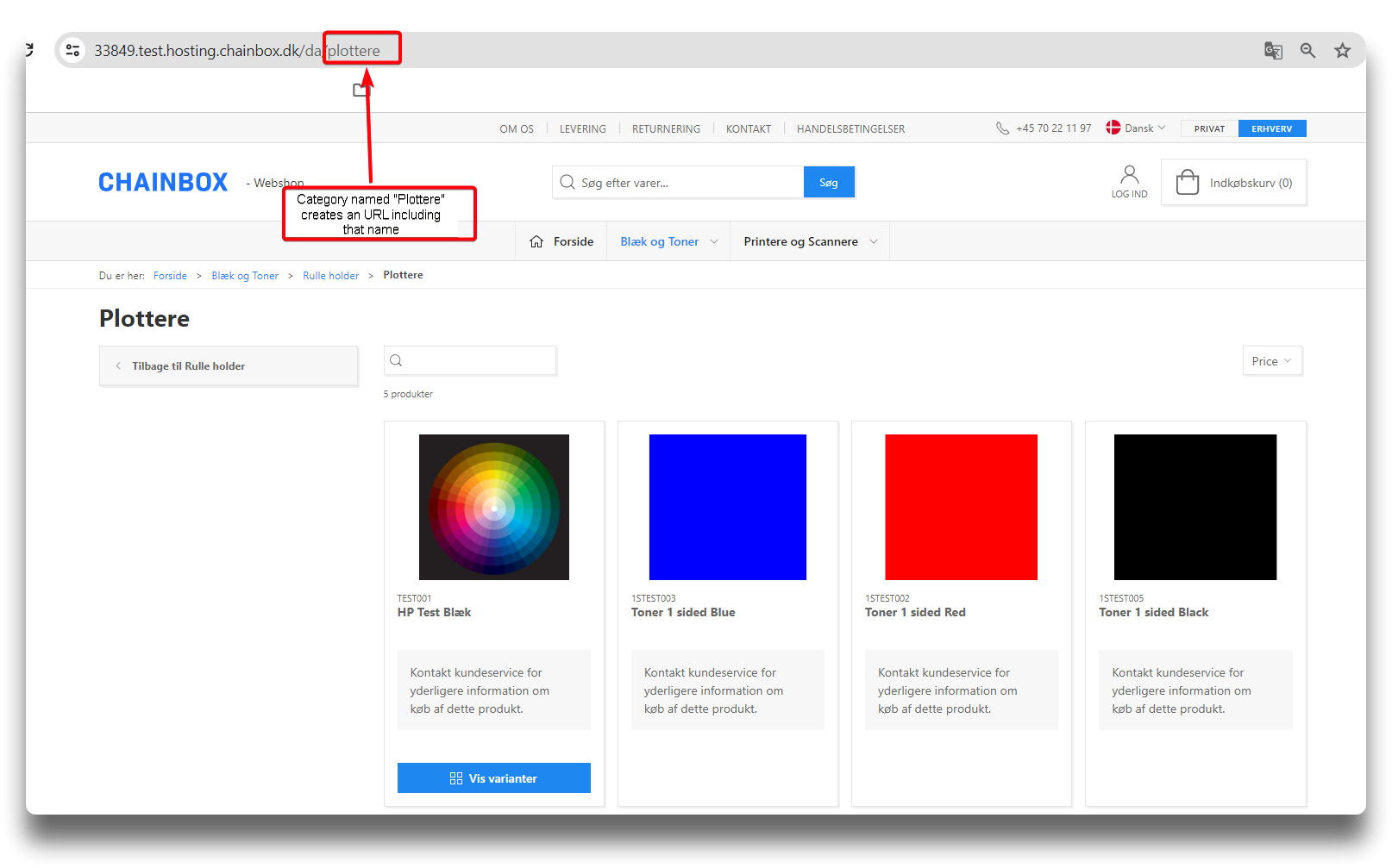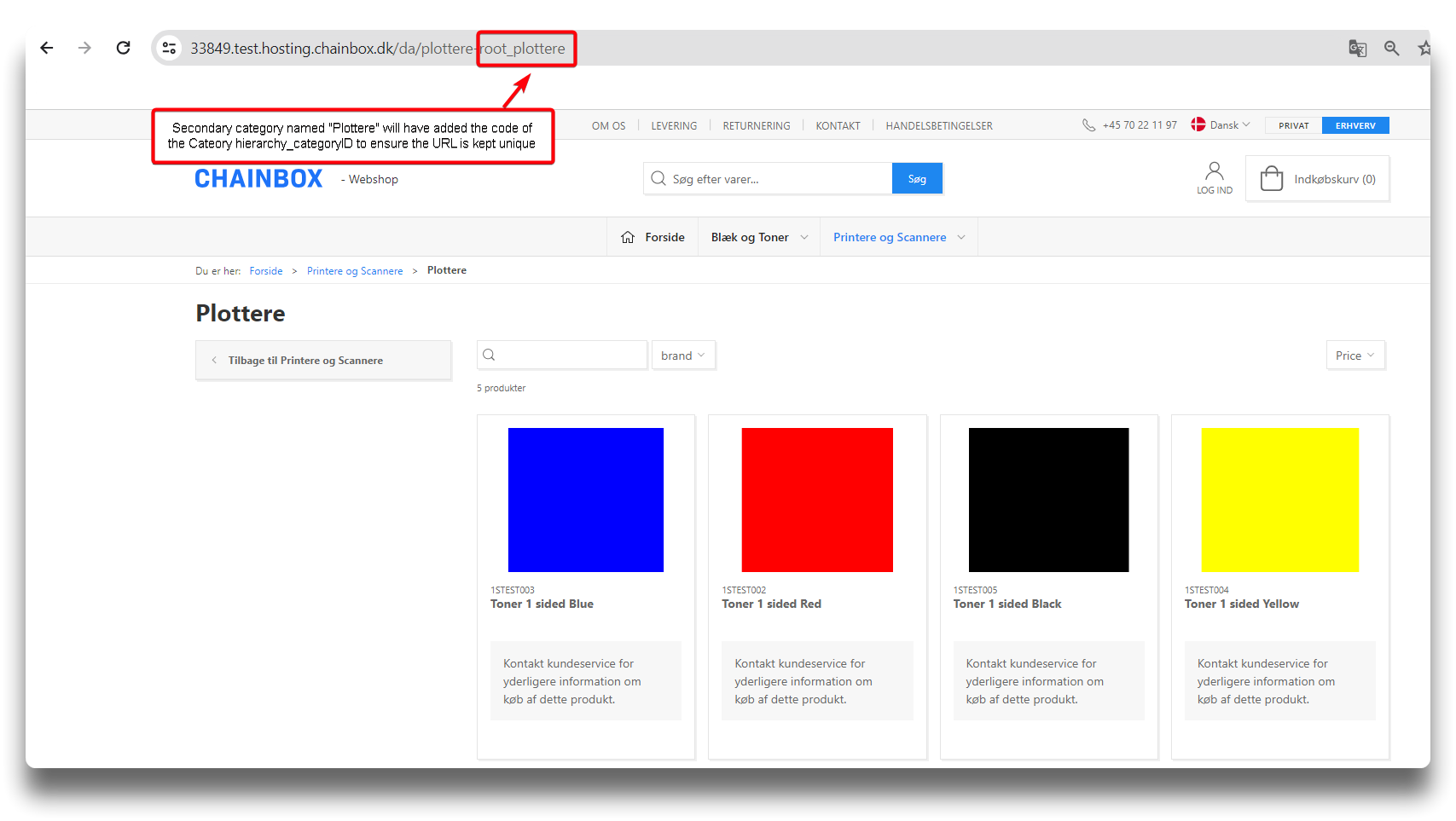 The first time a category is visible in the webshop, the URL is created based on the category name or the localized name in PIM if such exists. Because the category name is not a unique identifier, there is a build-in function to secure, that two identically named categories, will not receive identical URL's.