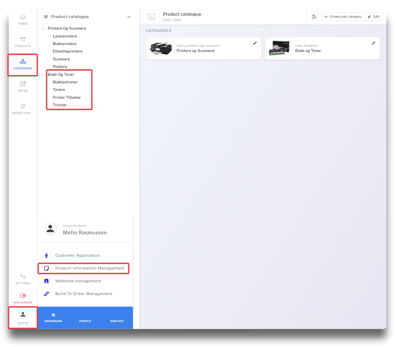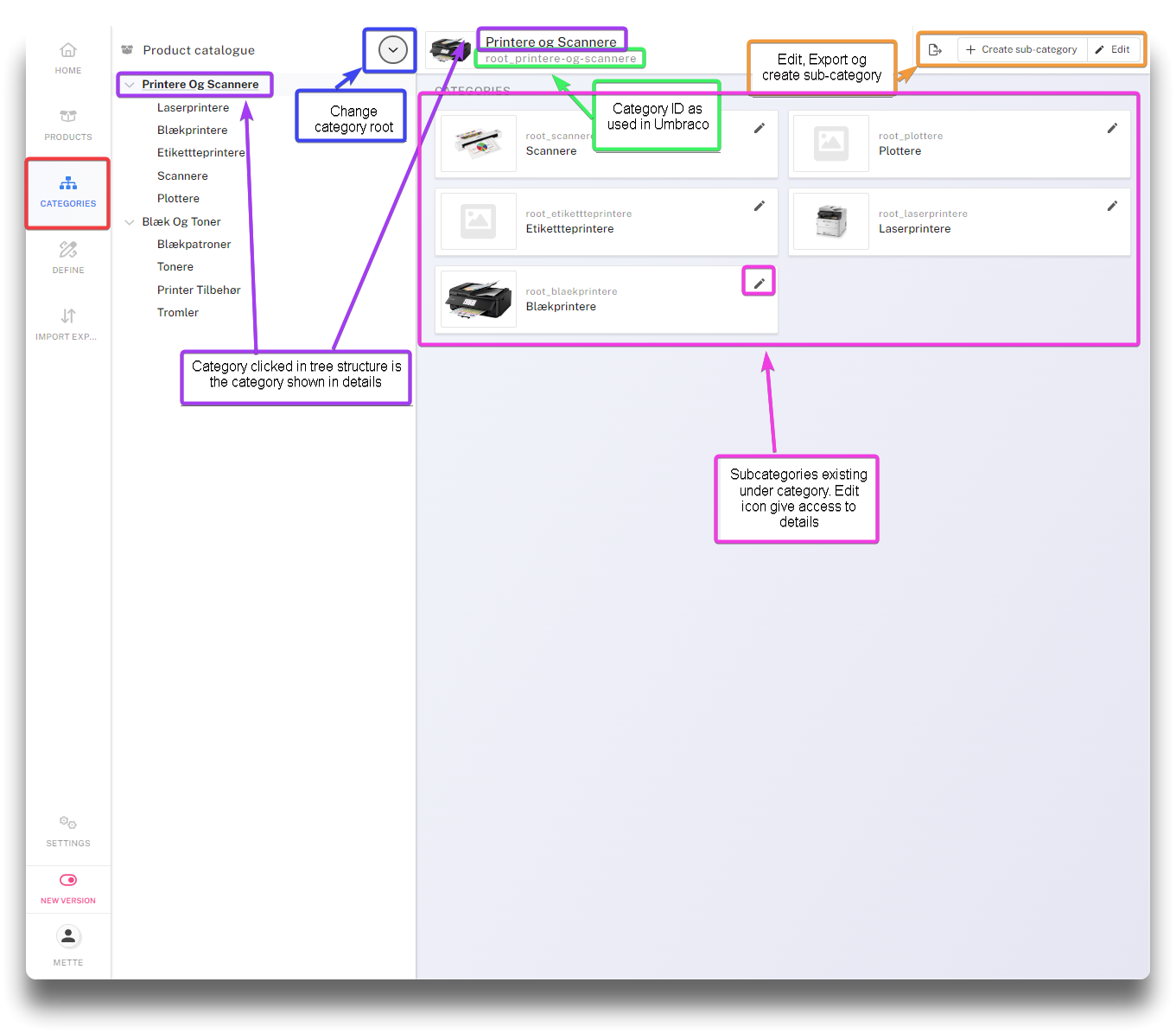 It is an option to have multiple category hierarchies corresponding with multiple webshops. If that is the case, switch between the hierarchies by using the dropdown menu in the top. Only one category hierarchy can be shown at a time.