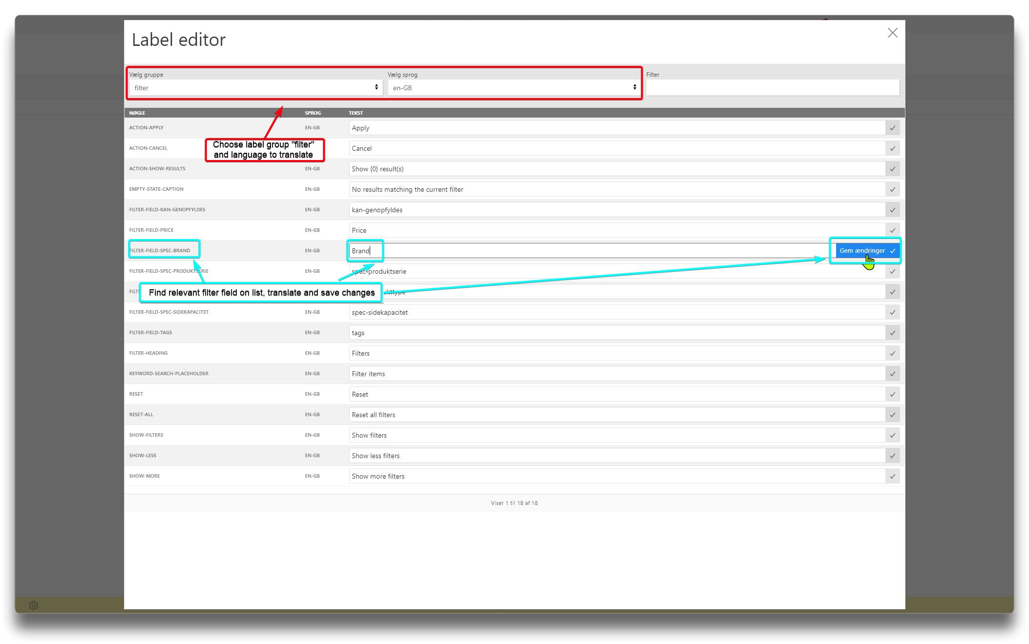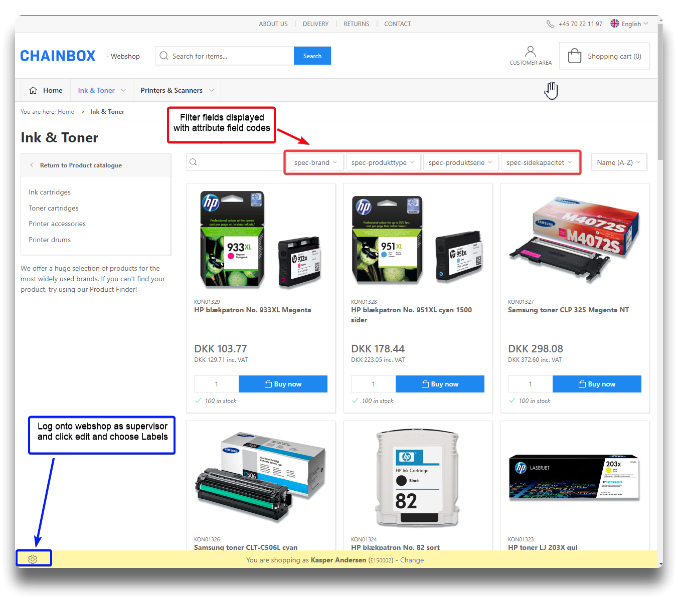 The filter fields will be shown with the attribute field code. To change that to a more customer-friendly filter name, log into the webshop with supervisor-rights and click "Edit" and choose "Labels".