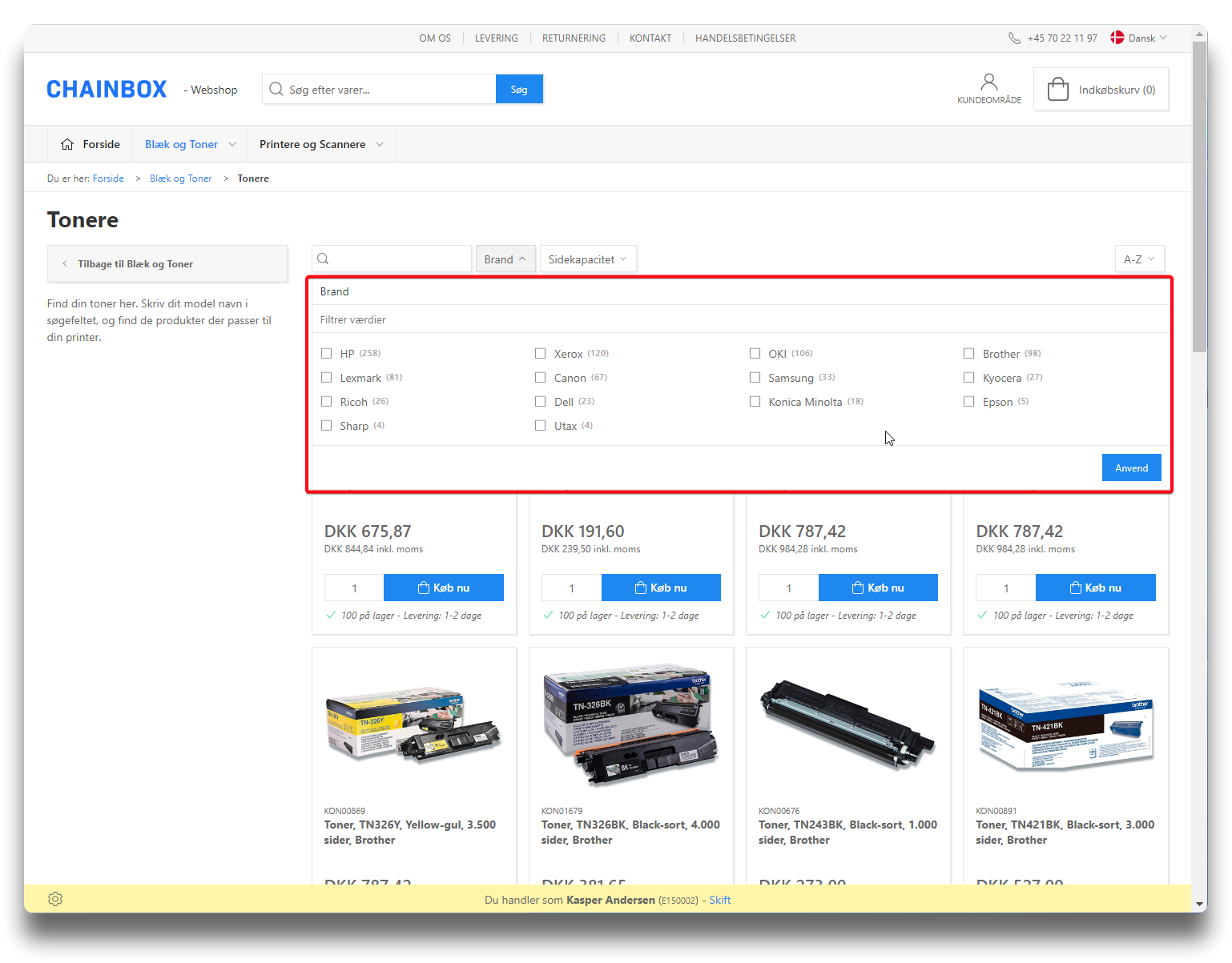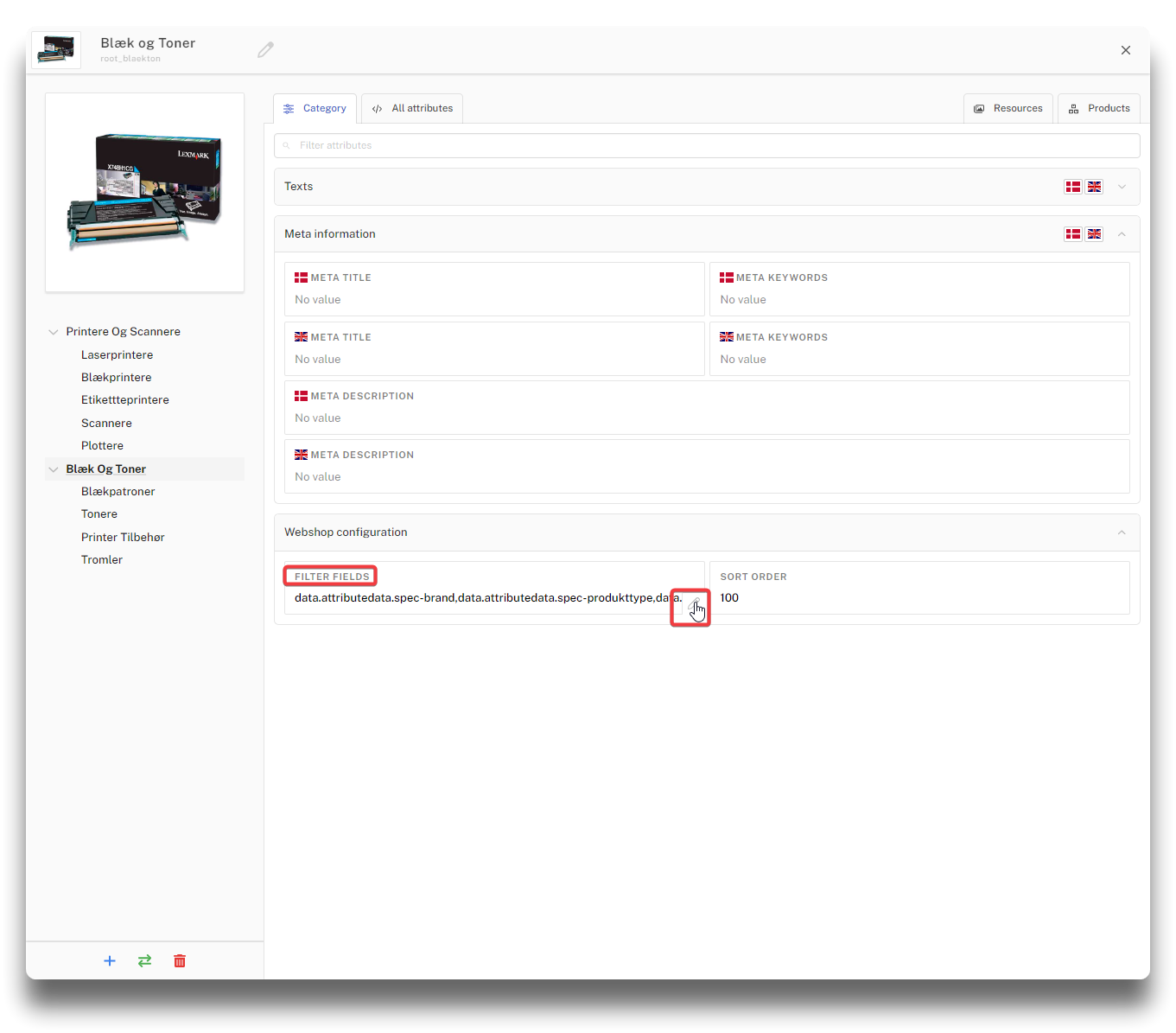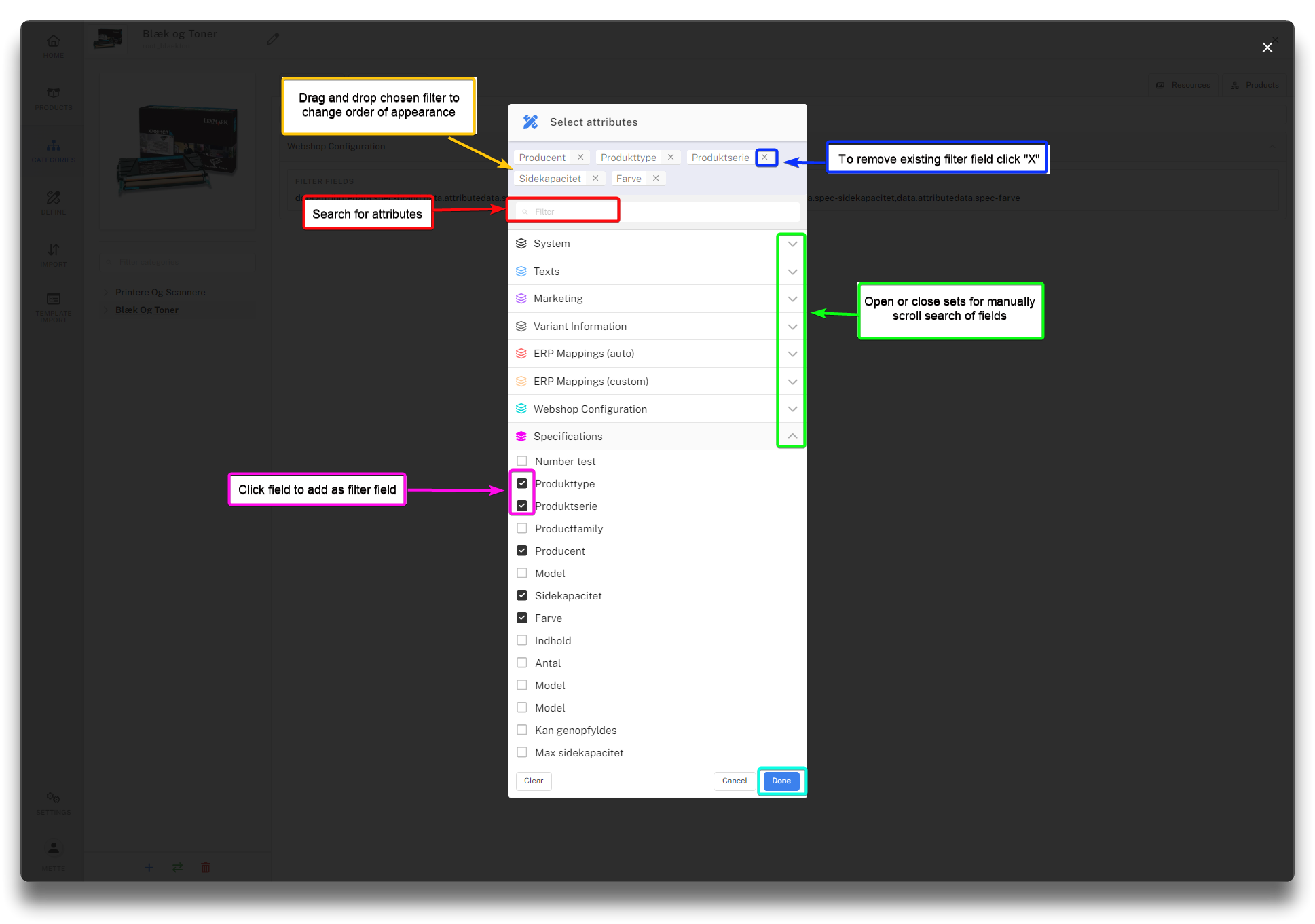 Click the edit icon to add or edit filter fields. Remove or add filter fields to category by ticking/untick. The order the filter fields are shown in on the webshop is the same as the order the fields are shown in in image "Edit filters - setup 2" below. Click "Done", when happy with your selection of filters and their order.