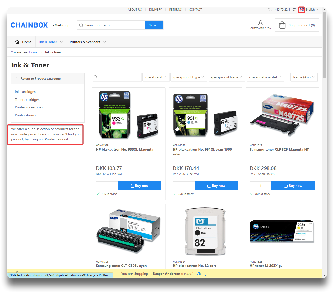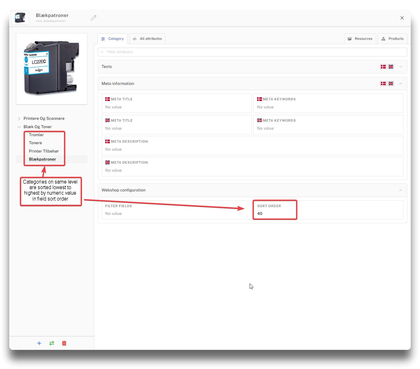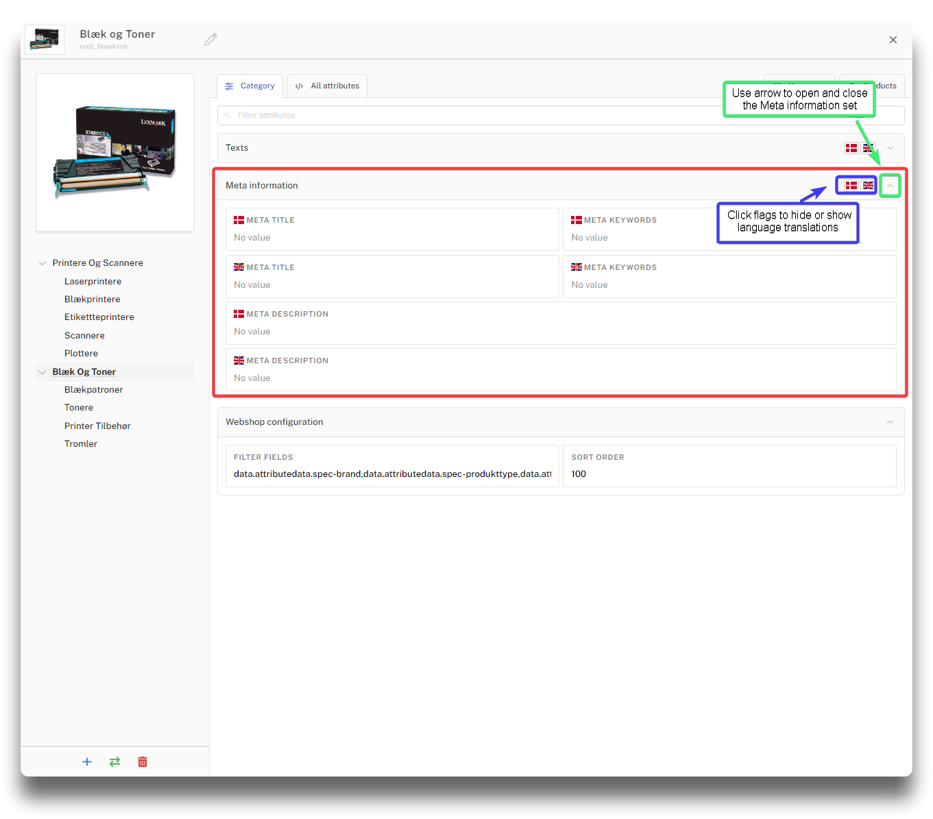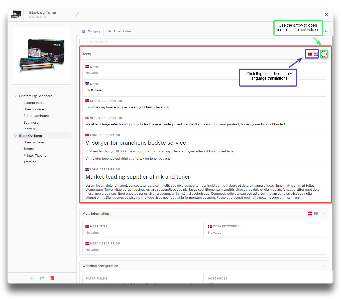 Click the flags to show and hide the language translations of texts. If a translation of name exists it will overrule the Category label on the webshop.