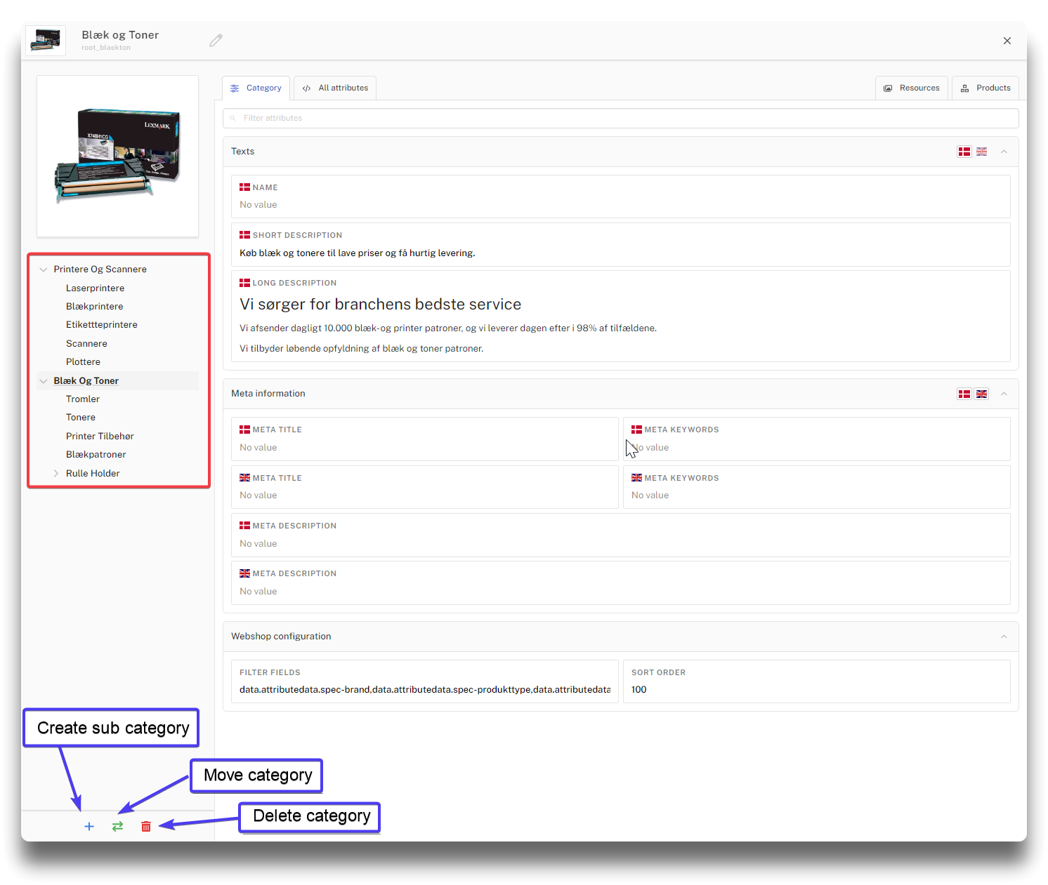 Hierachy Click a category in the tree structure to navigate to other categories detailed view, or use the icons in the bottom to create, move or delete the category. Navigate to other categories detailed view Previous Category details Next Label
