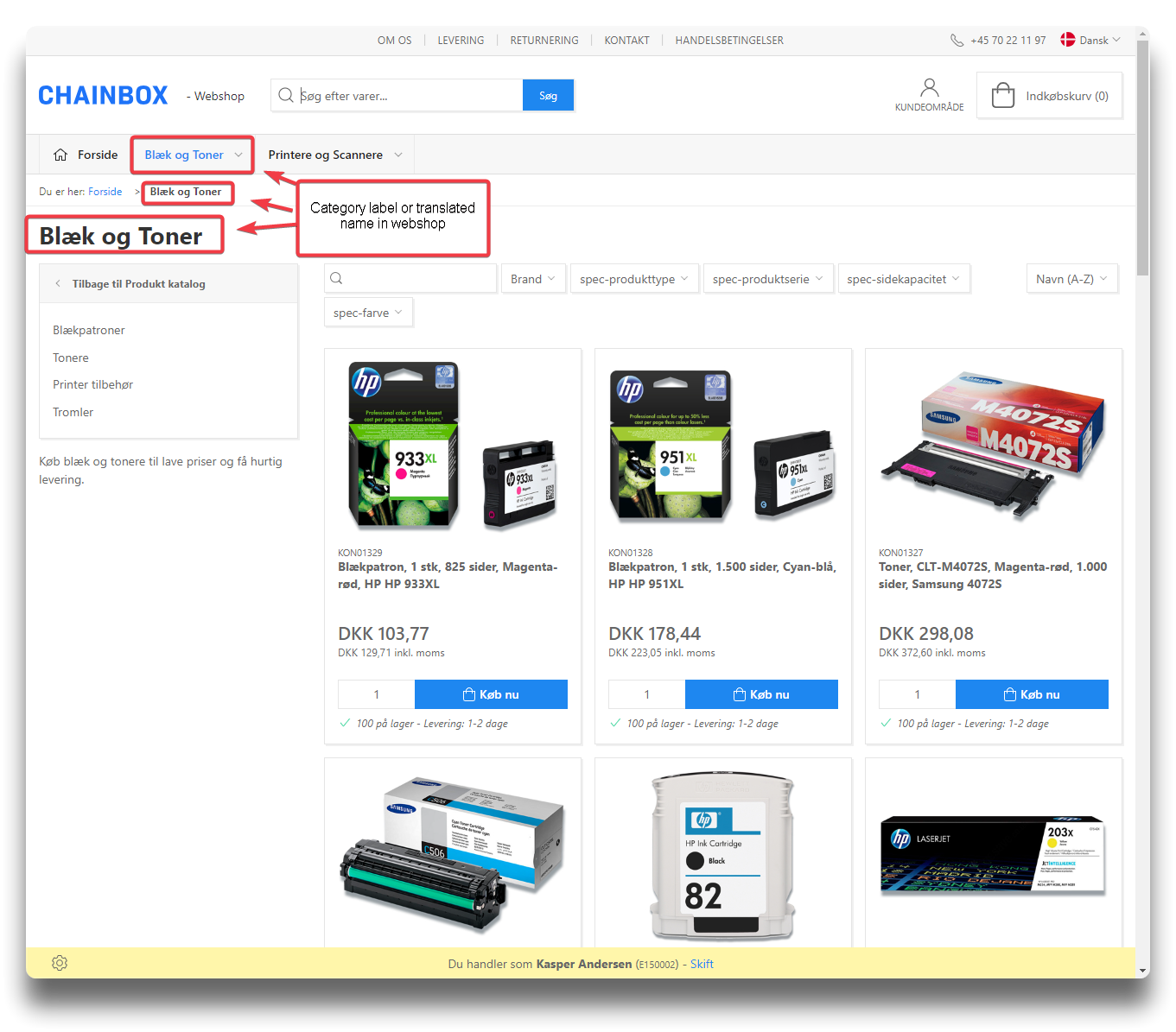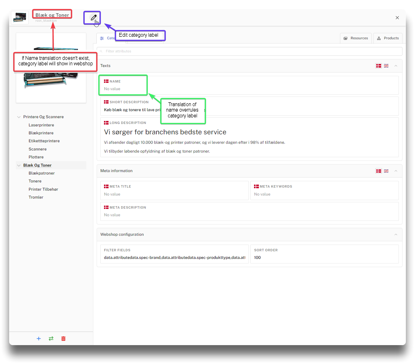 Change category label by clicking the edit icon. If no translation of name exists for a specific language, the webshop will fall back to show category label as category name.