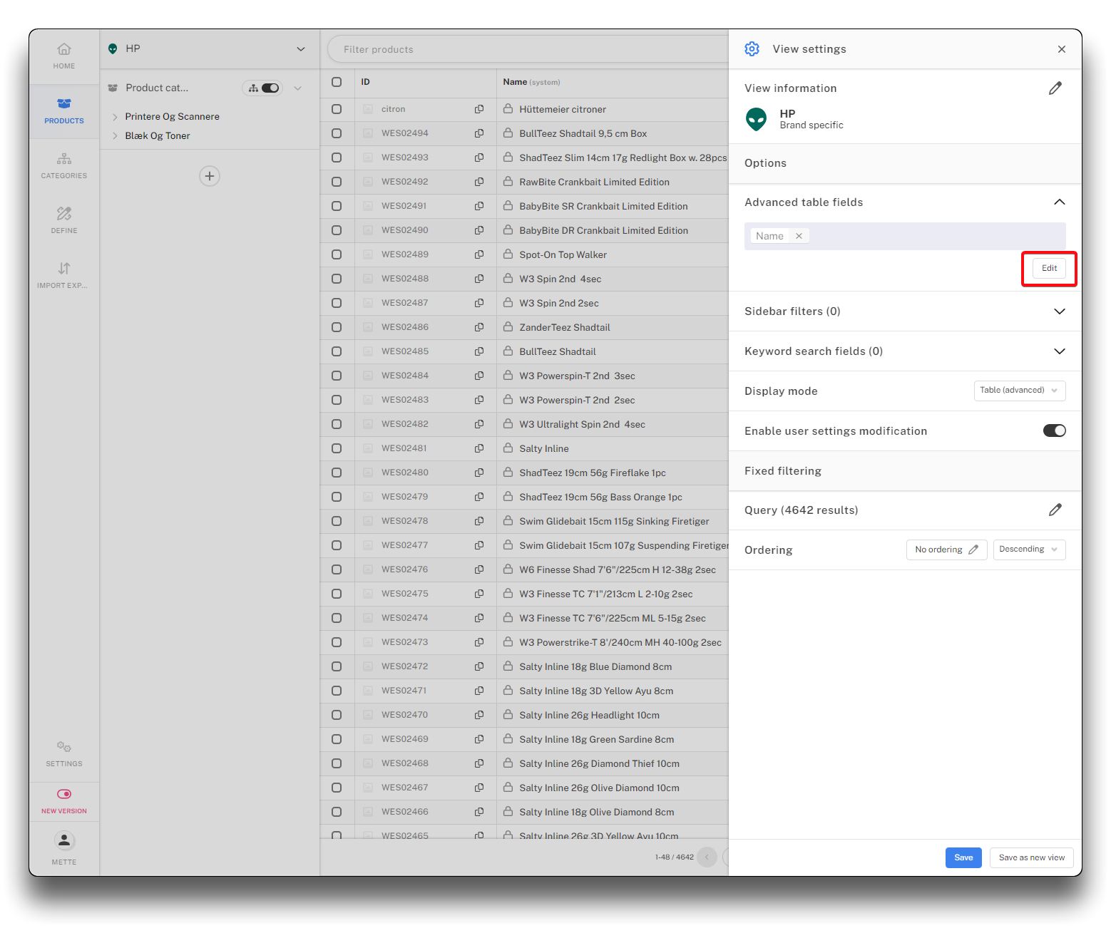 When working with large amounts of products display mode "Table (advanced)" is recommended.