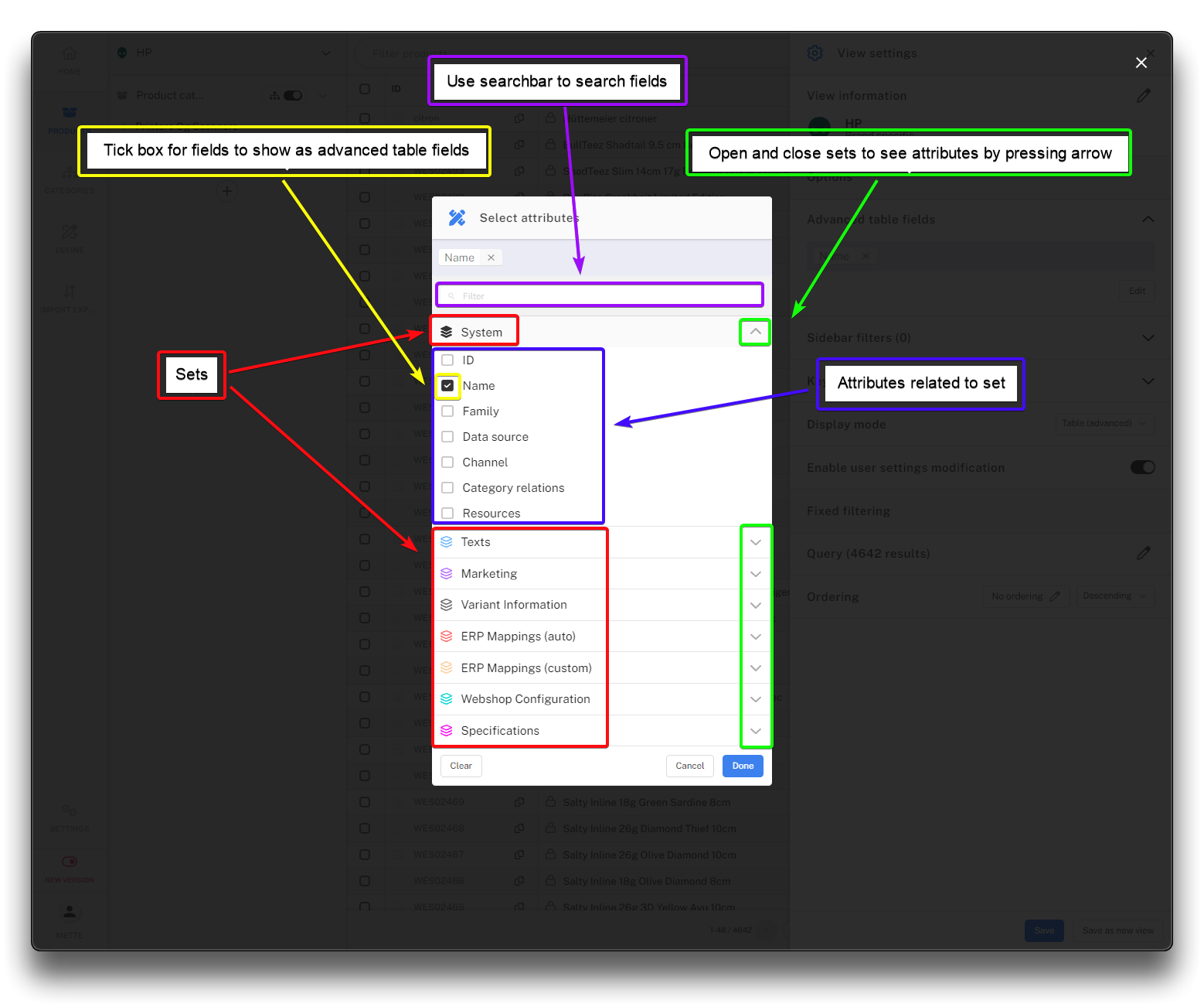 Advanced table fields refers to fields (attributes) shown in your view overview. It will not affect the product detail view when clicking an individual product.