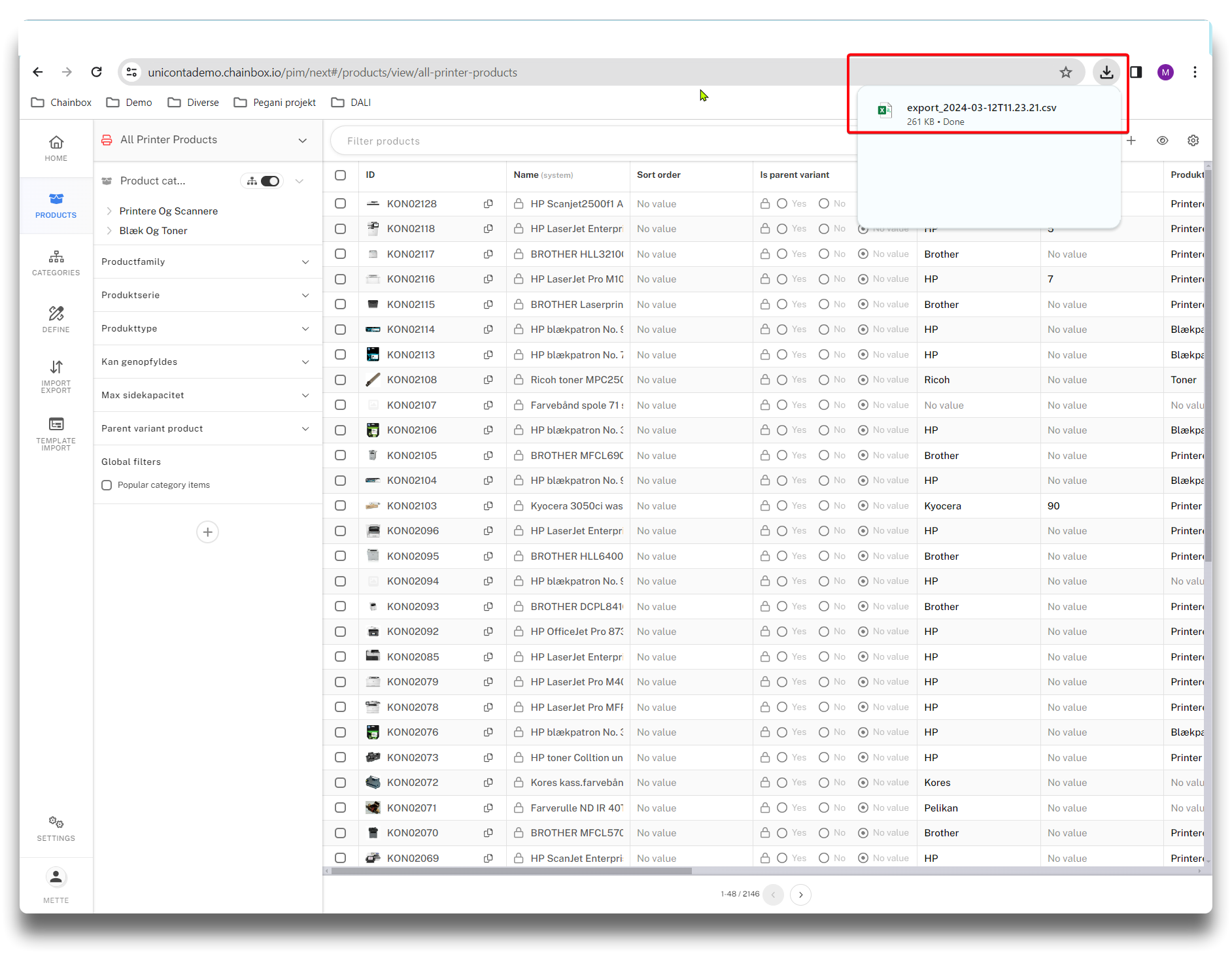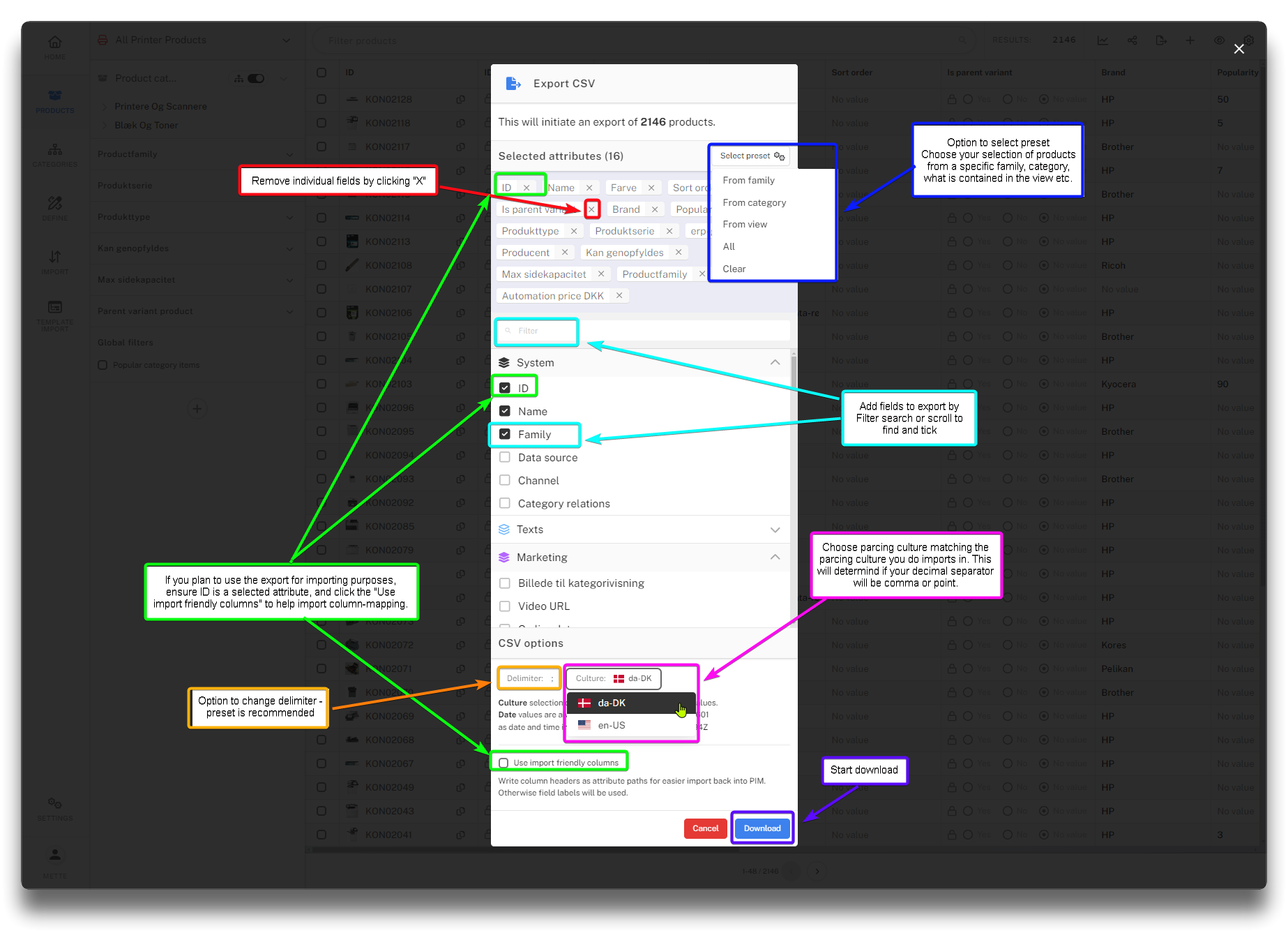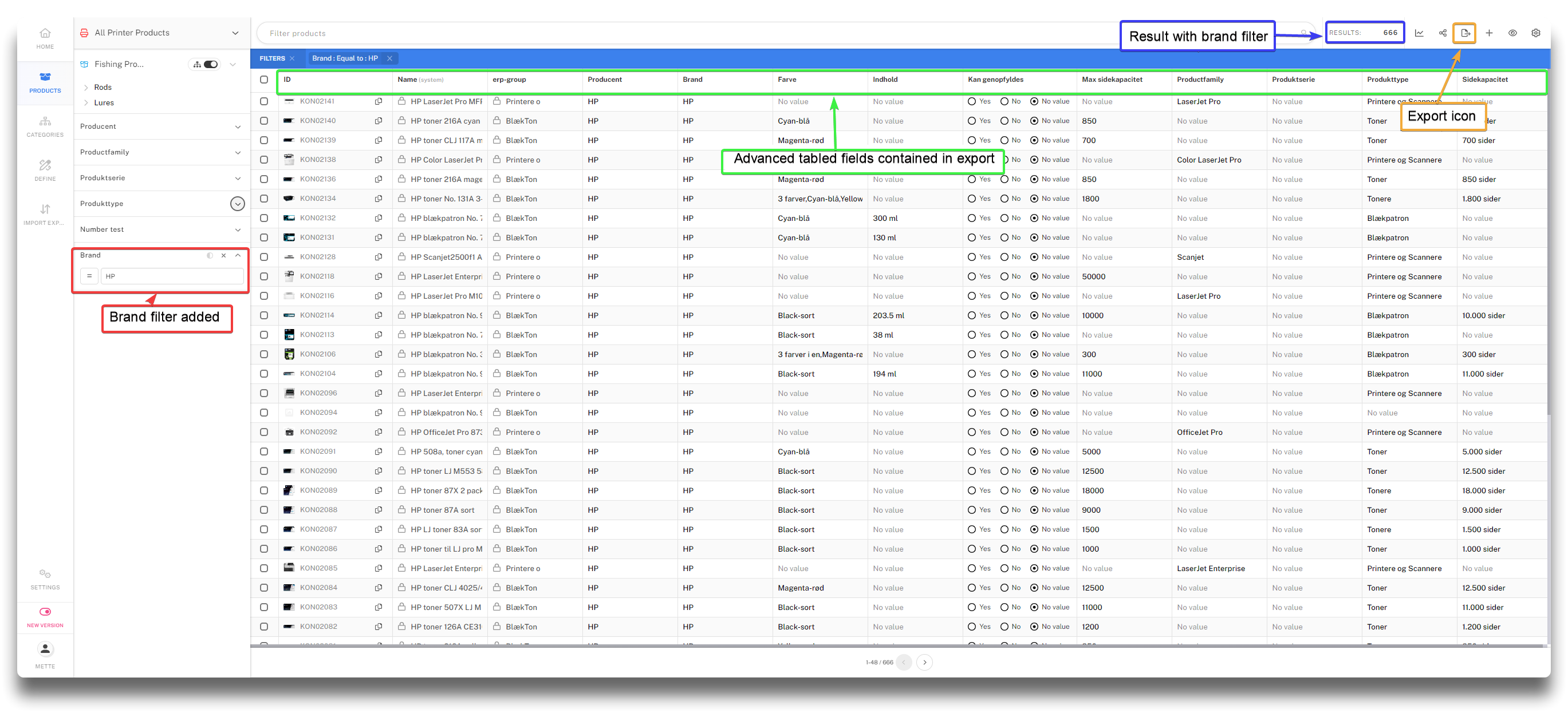 When pressing Export in the product view, the product selection and field selection will be as in the view, with what ever filtering is active when clicking export.