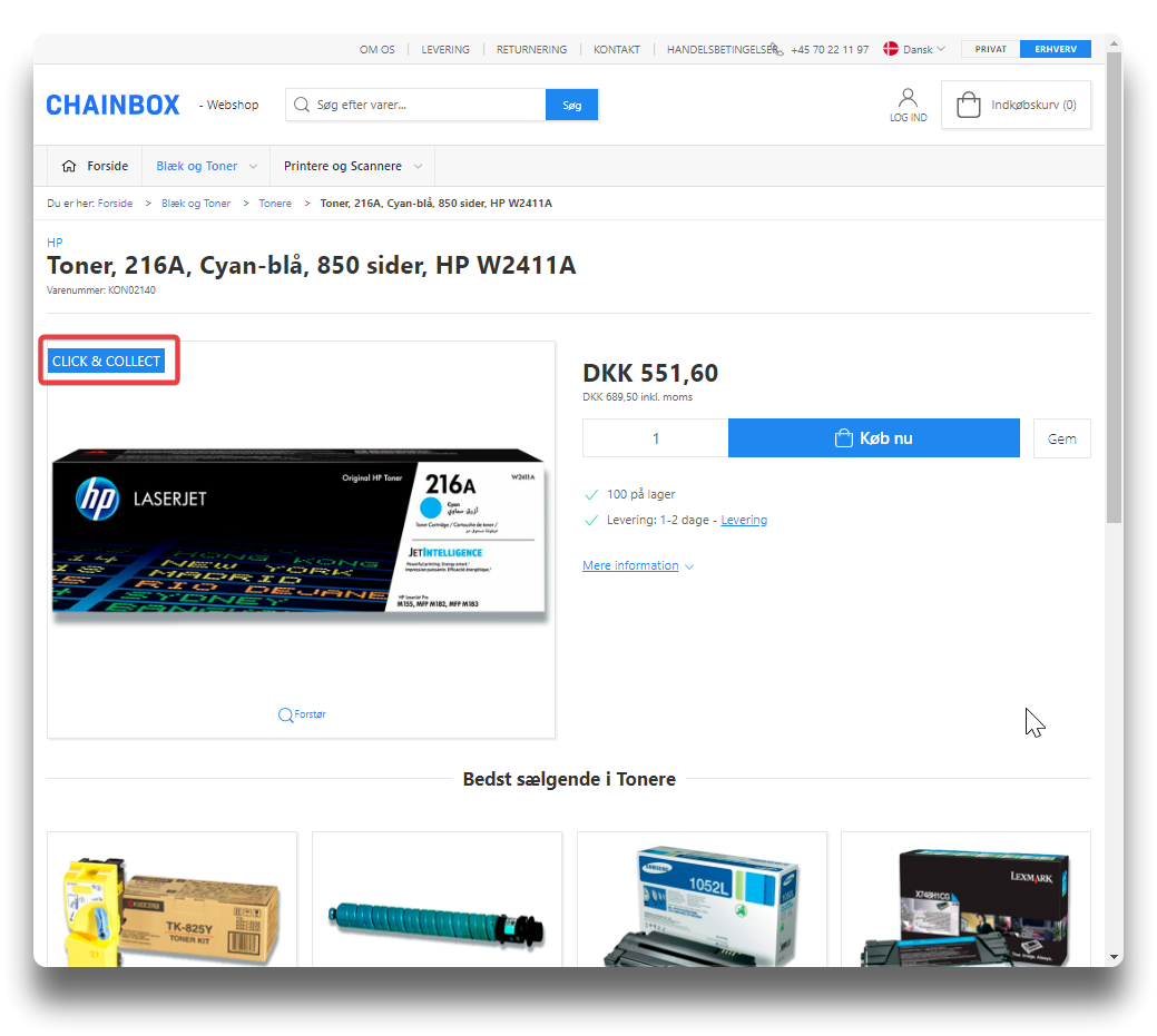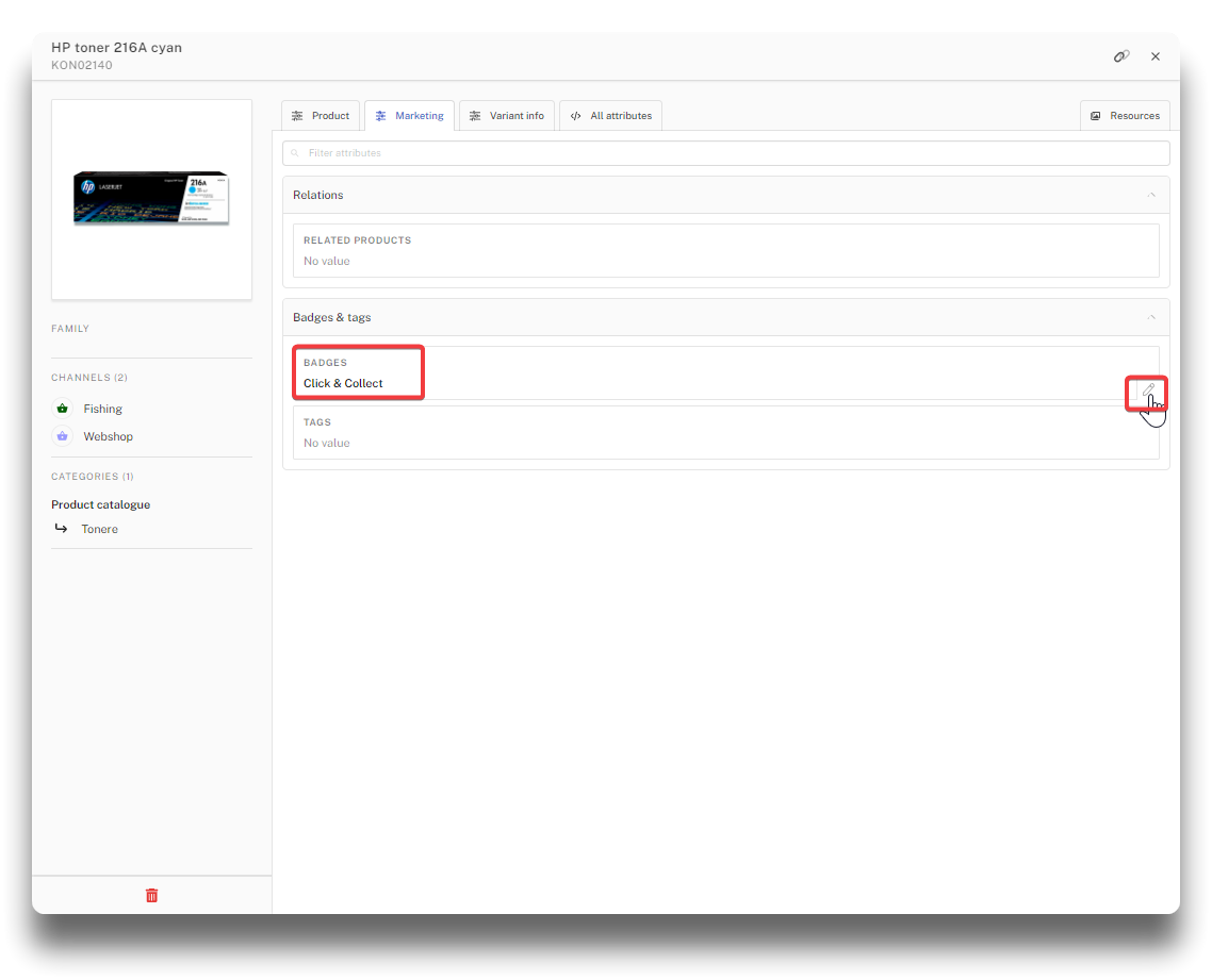 A simple badge is created by typing the badge text in PIM. The badge will be visible on the product list page and the product page on the webshop.