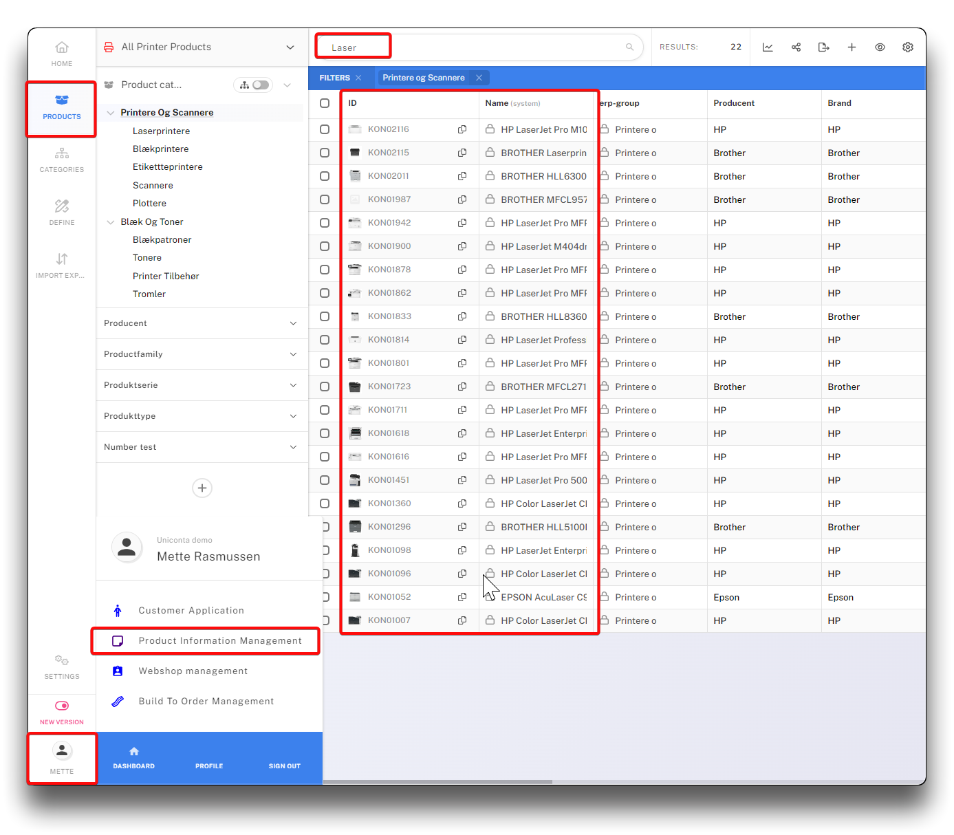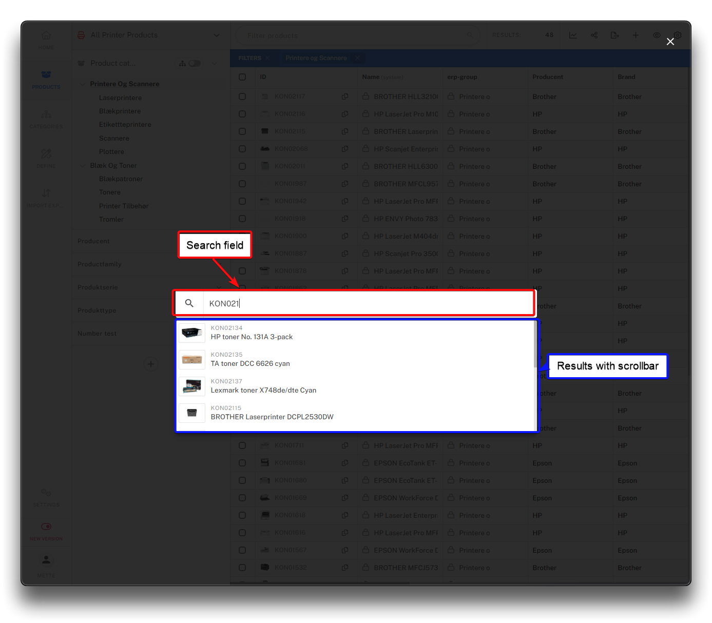 Entering a value in "Filter products" will return result based on values in ID and Name, and in addition any fields defined as Keyword search fields in the setting of the view.
