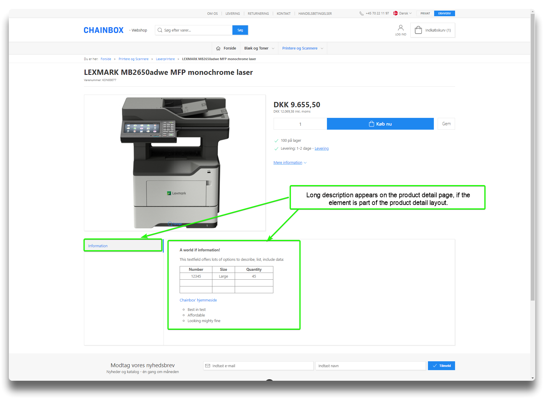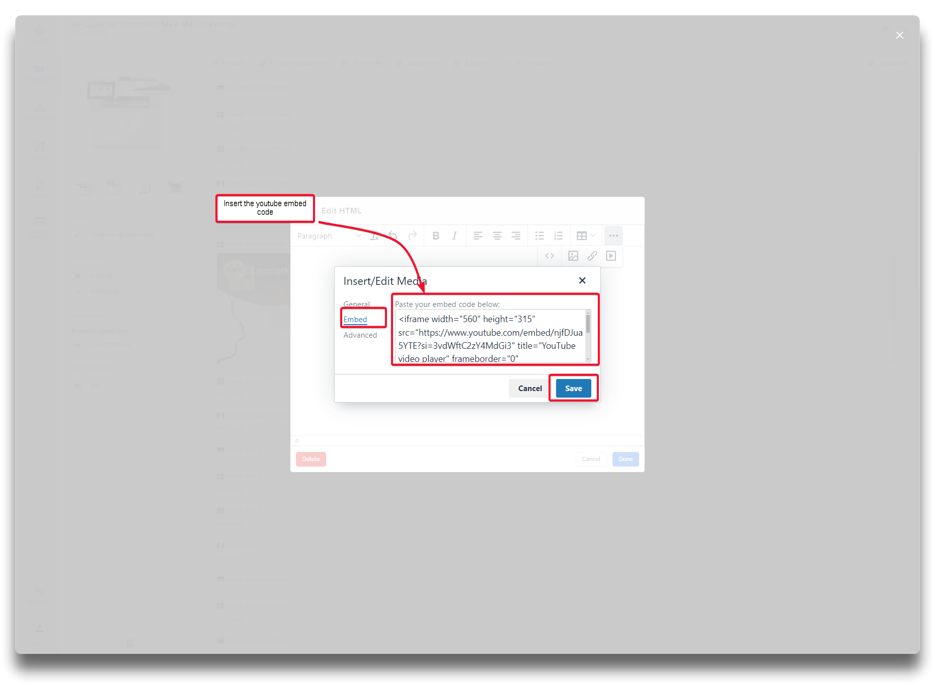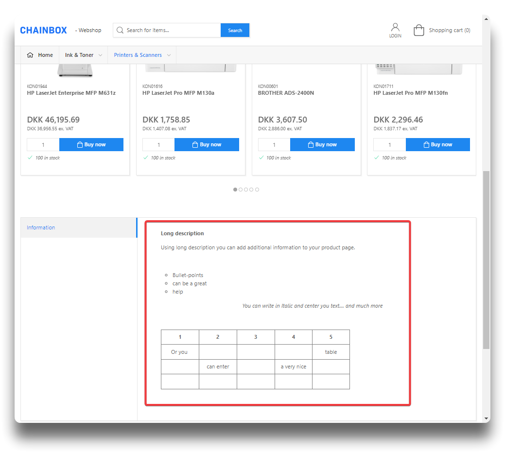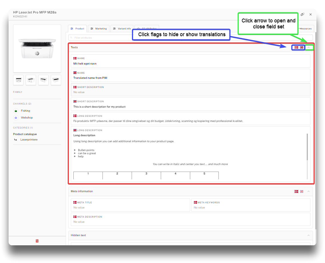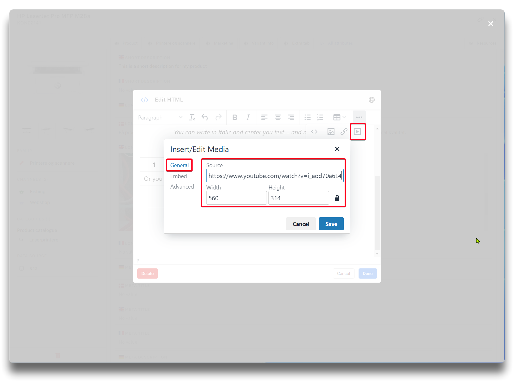 Long description offers the most advanced functionality of the text fields in PIM. Besides text, bullet-points or tables, it is possible to add videos, images, links and change directly in the field source code by using the designated icons.