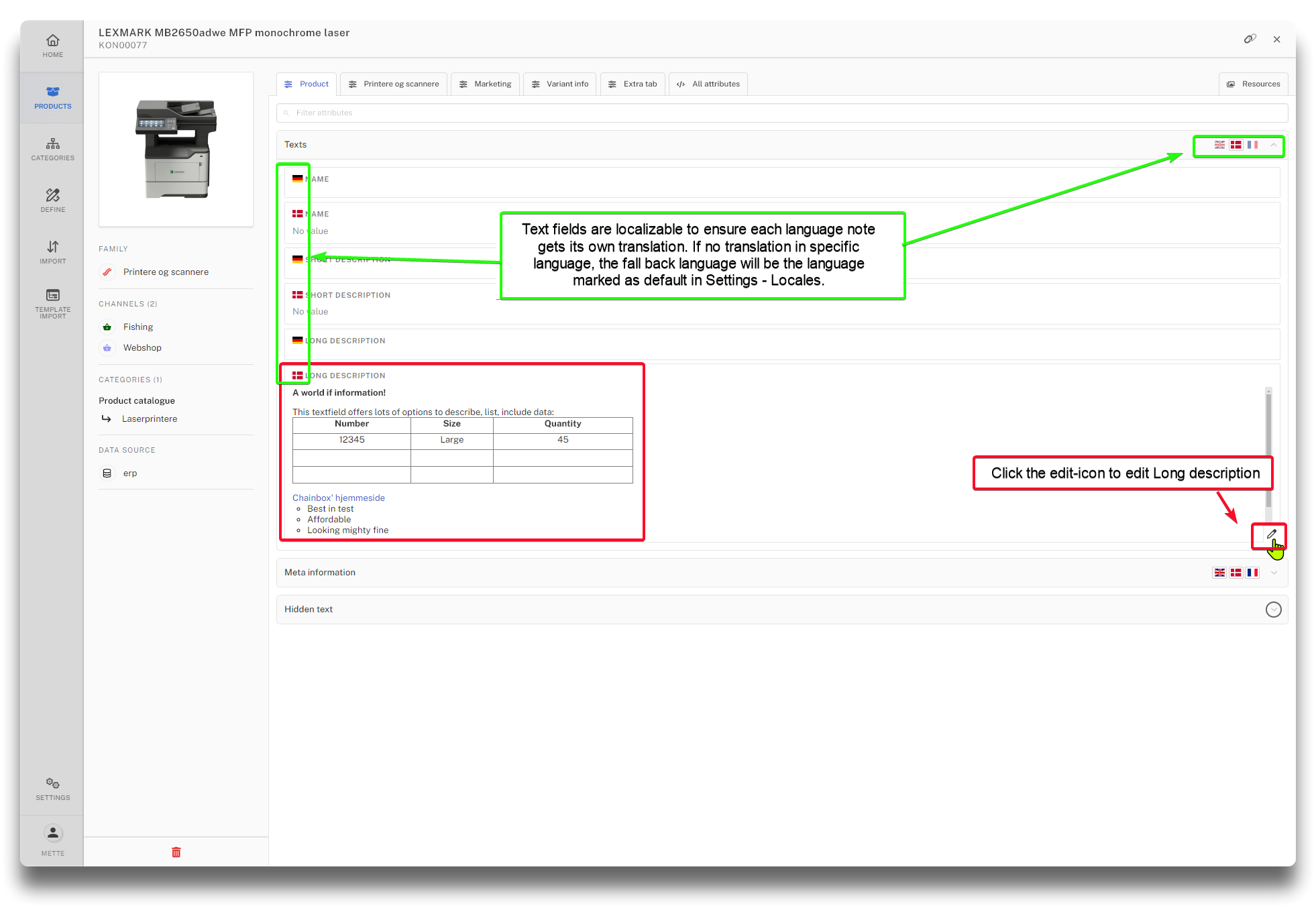 Short and long descriptions can be added per language. Use the edit icon to edit long description.