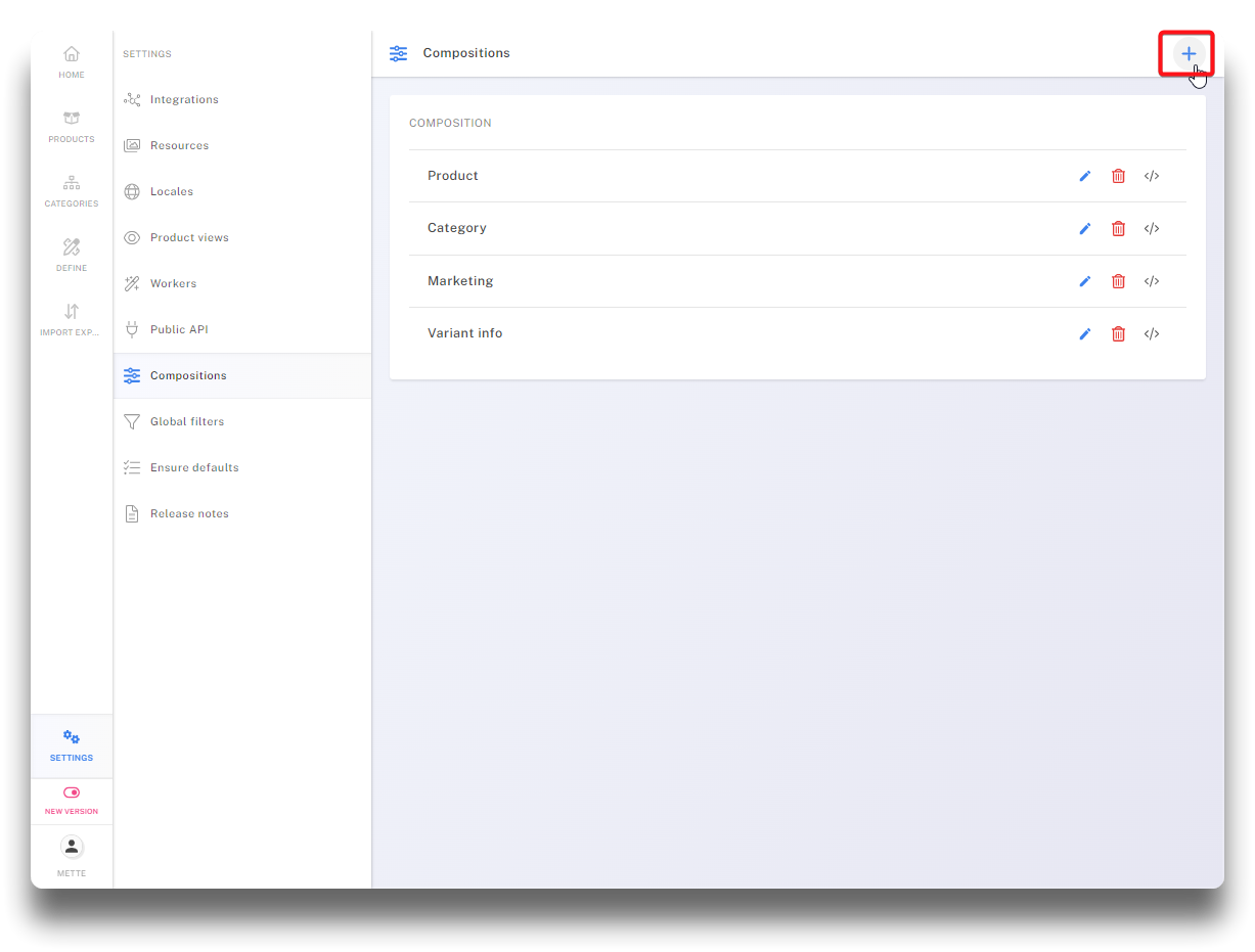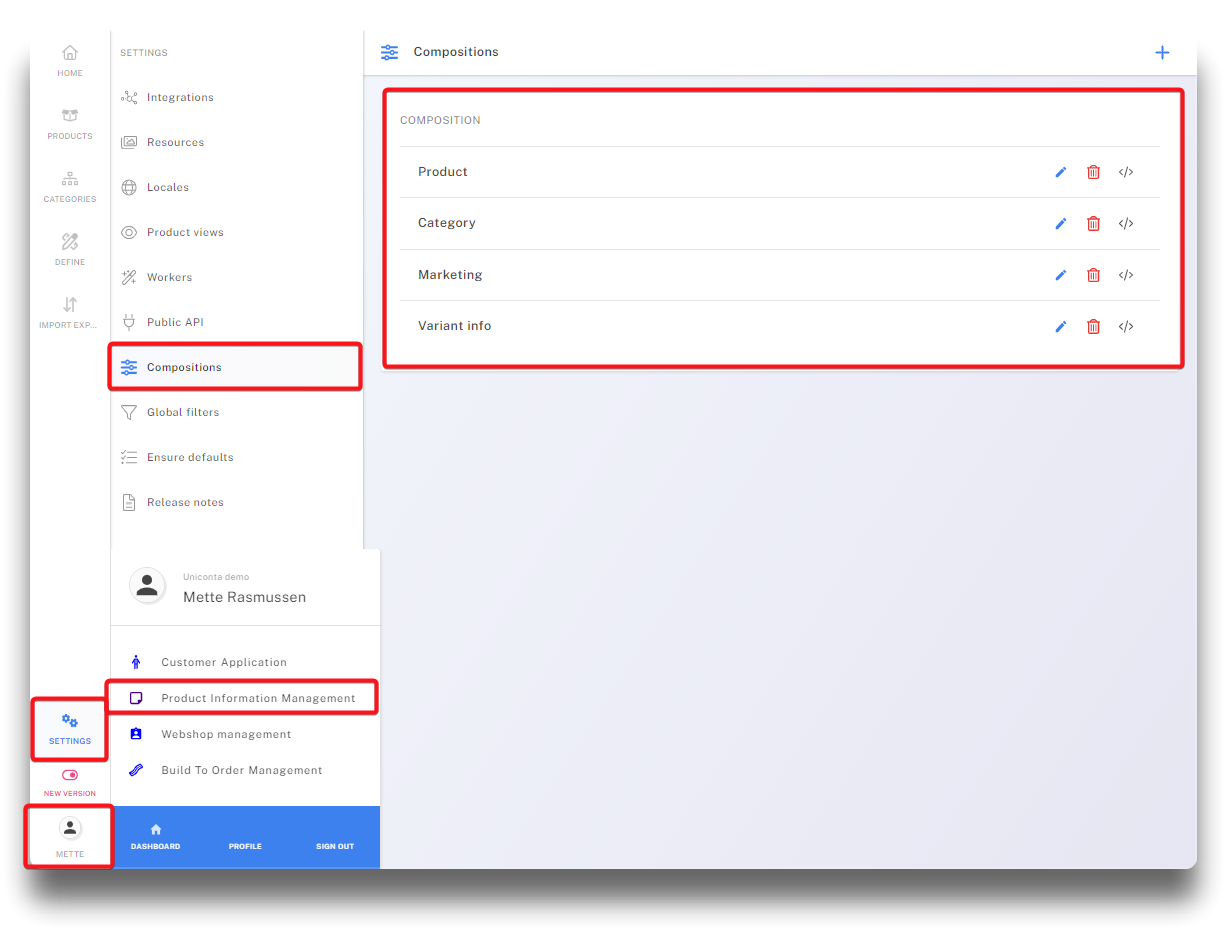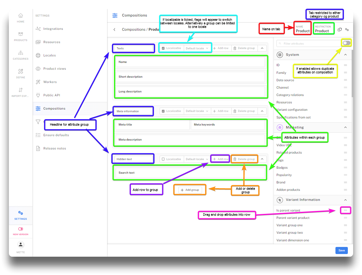 Compositions are the tabs on the product and category detail page, and the sets and attributes each tab consists of.