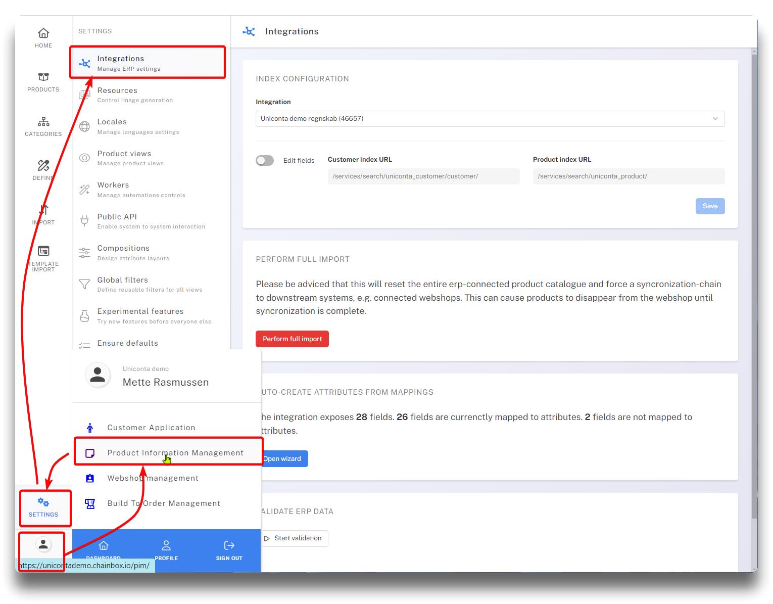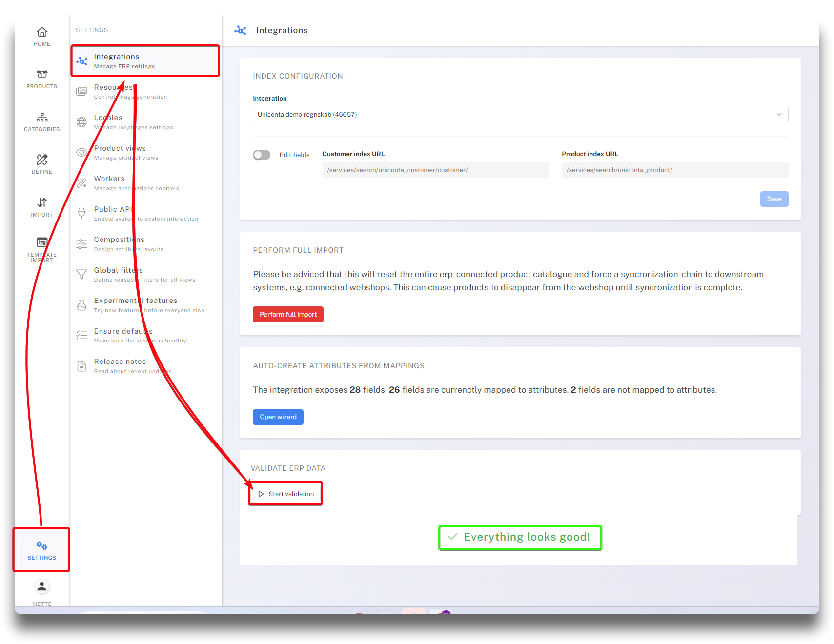 The "Perform full import" button, will offer a full import of all mapped fields from the ERP system. This should be used with outmost caution. If data delays are experienced between ERP and PIM, please contact Chainbox for support first.