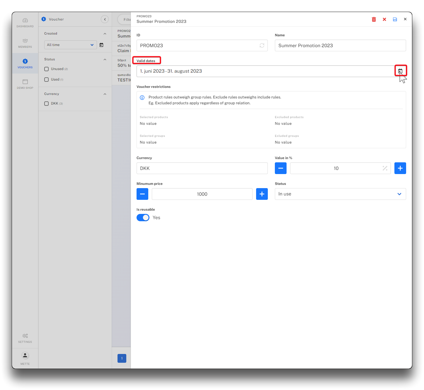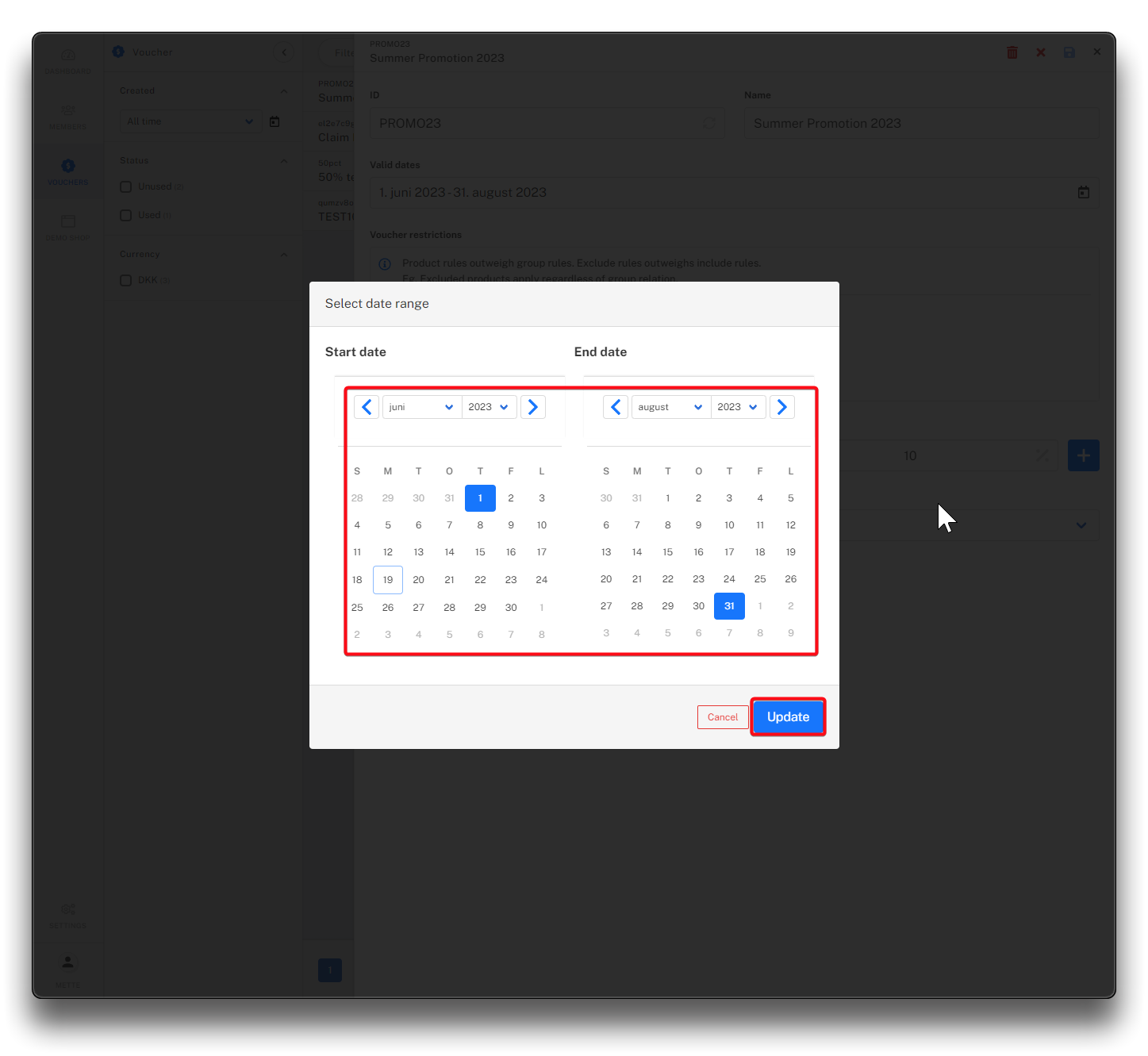 Press the calendar-icon under "Valid dates" to set the period in which the voucher should be valid. Click "Update"