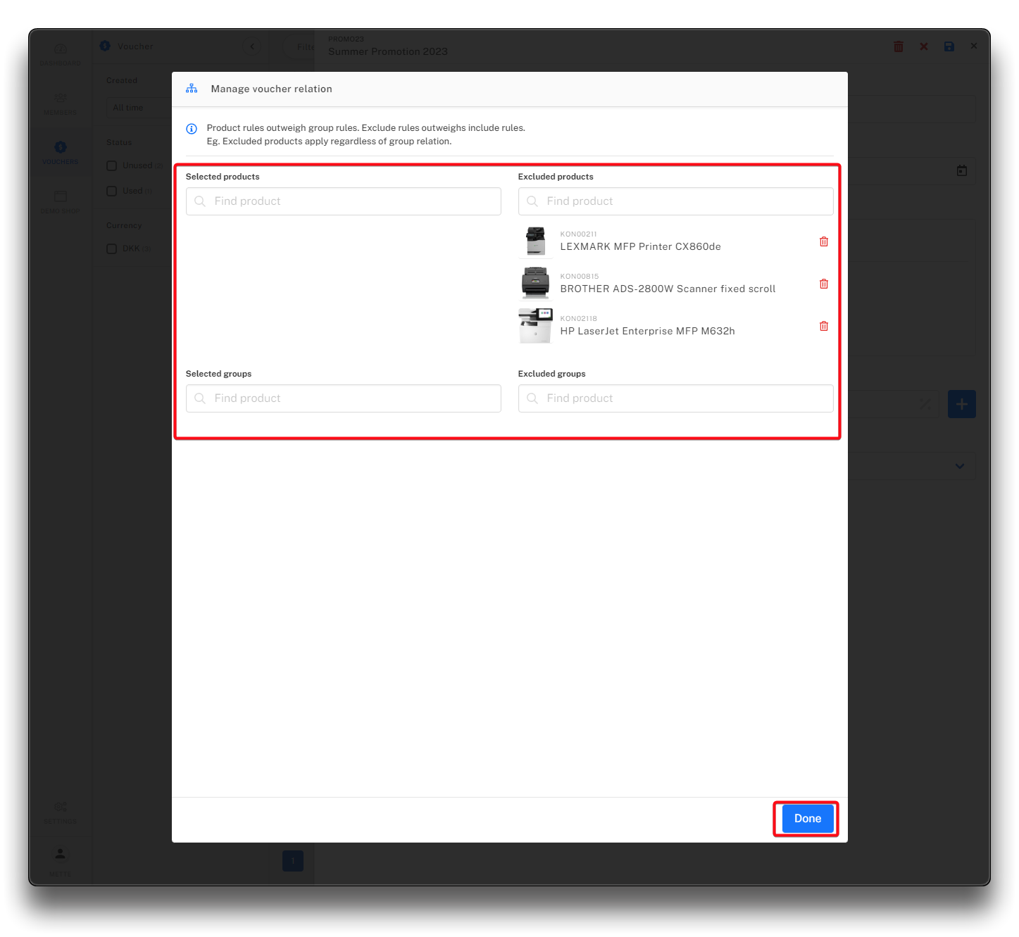 Once you have made your choices, click "Done" to save. If you want the voucher to be applicable to all products and groups, leave the voucher restriction area blank.