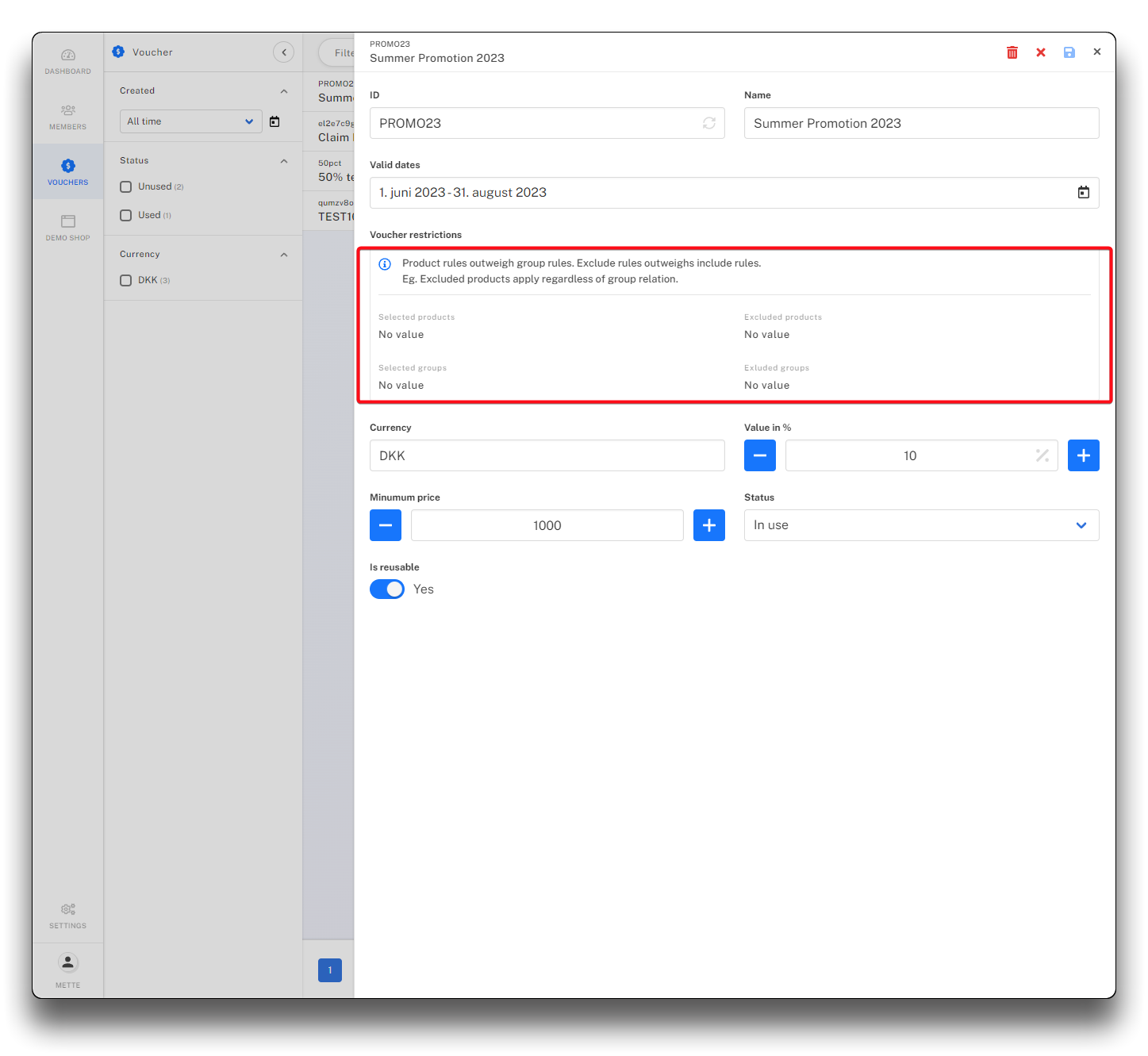 With voucher management you can issue your own vouchers, whether it be reusable vouchers, product-specific vouchers, general vouchers, or vouchers with specific validity periods.