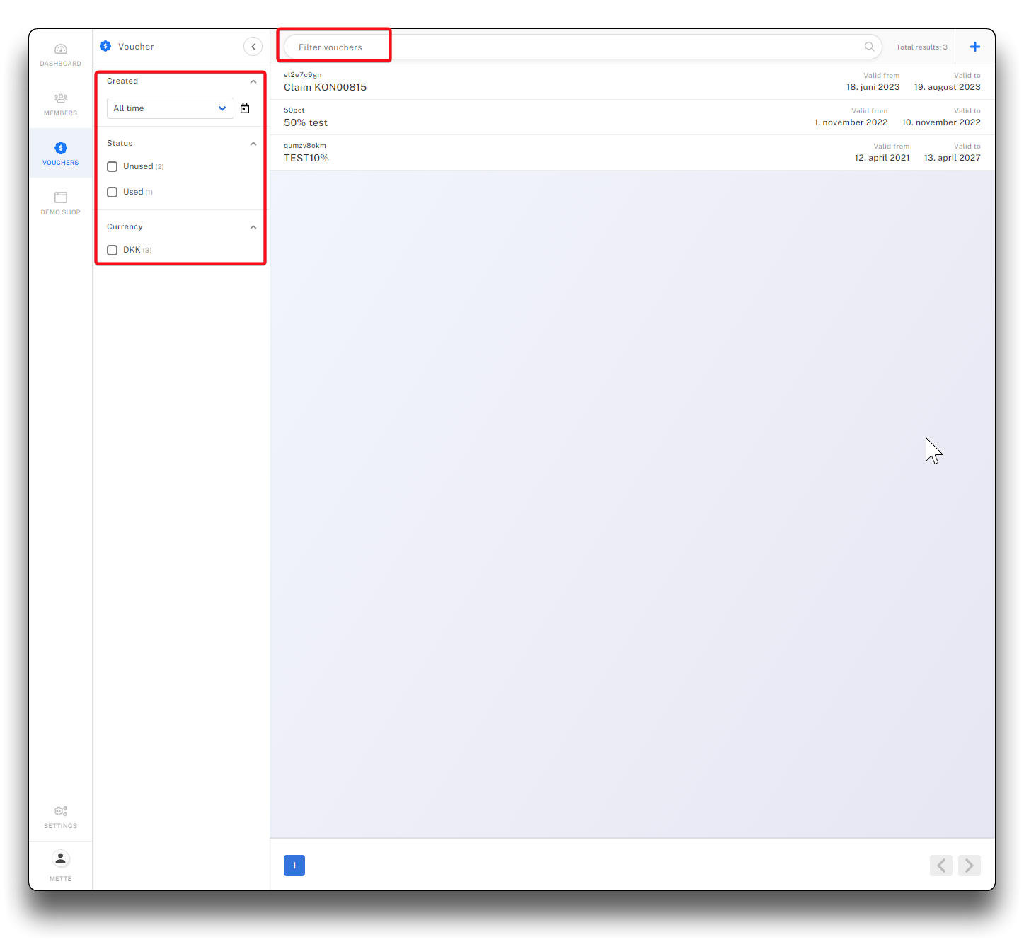 Use the left-side filters to search existing vouchers by filter options available, search by creation date, or search in "Filter vouchers" by Voucher name or ID.
