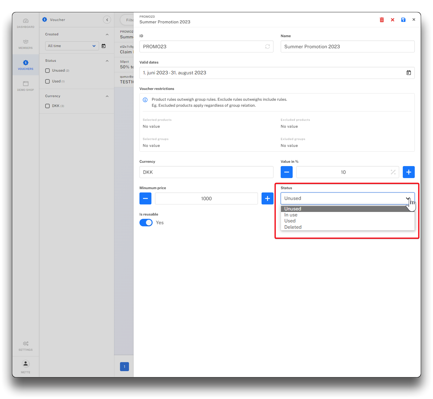 Upon creation, the voucher will be assigned a status of "Unused". If the voucher is reusable, its status will change to "In use" once it has been added to a customer's cart.