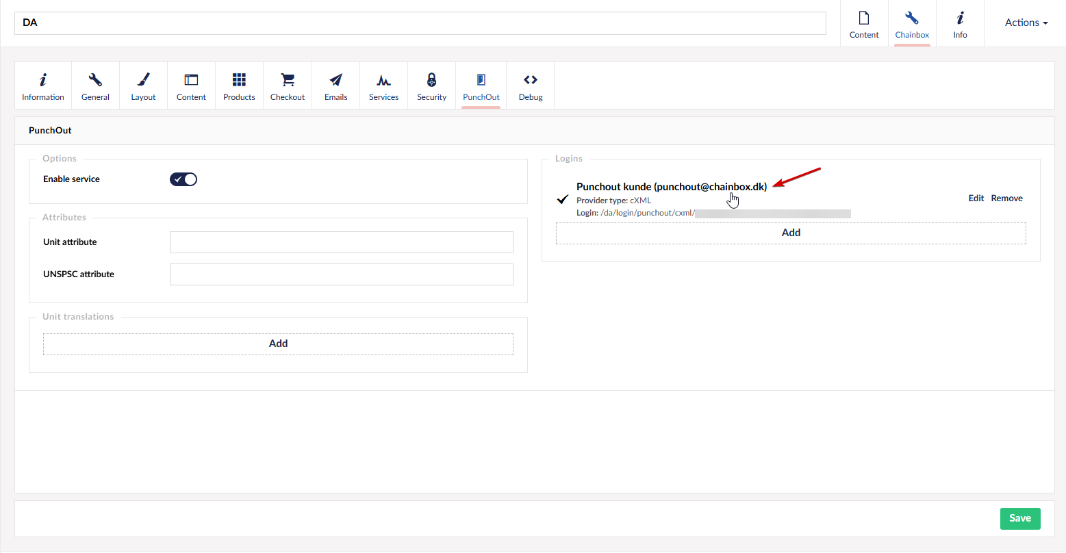 The installed module will appear in Umbraco in your Chainbox Toolbox with its own icon. You have options to define what fields contain the required product attributes, if named differently in PIM, to add fees and to create PunchOut logins based on Members.