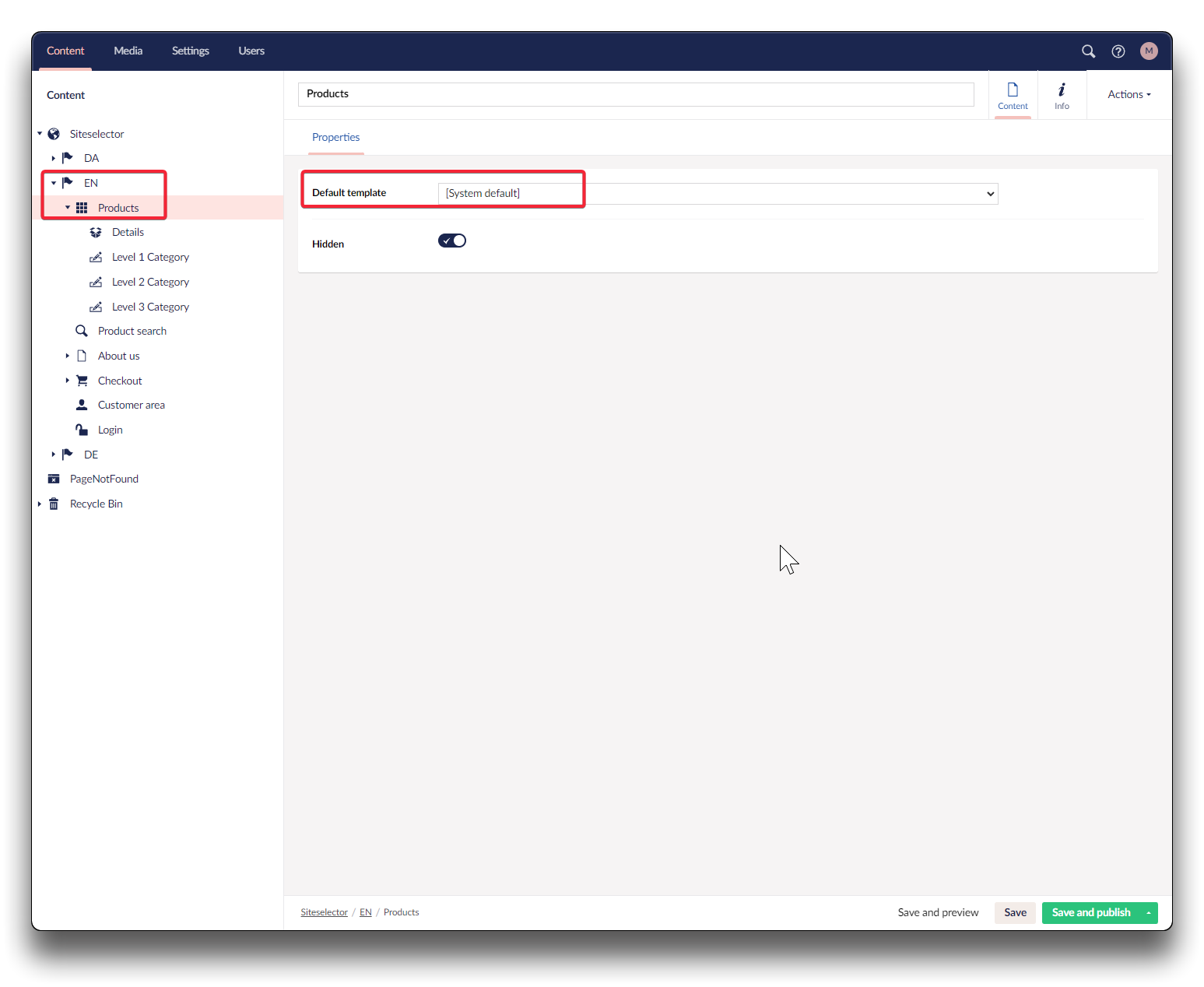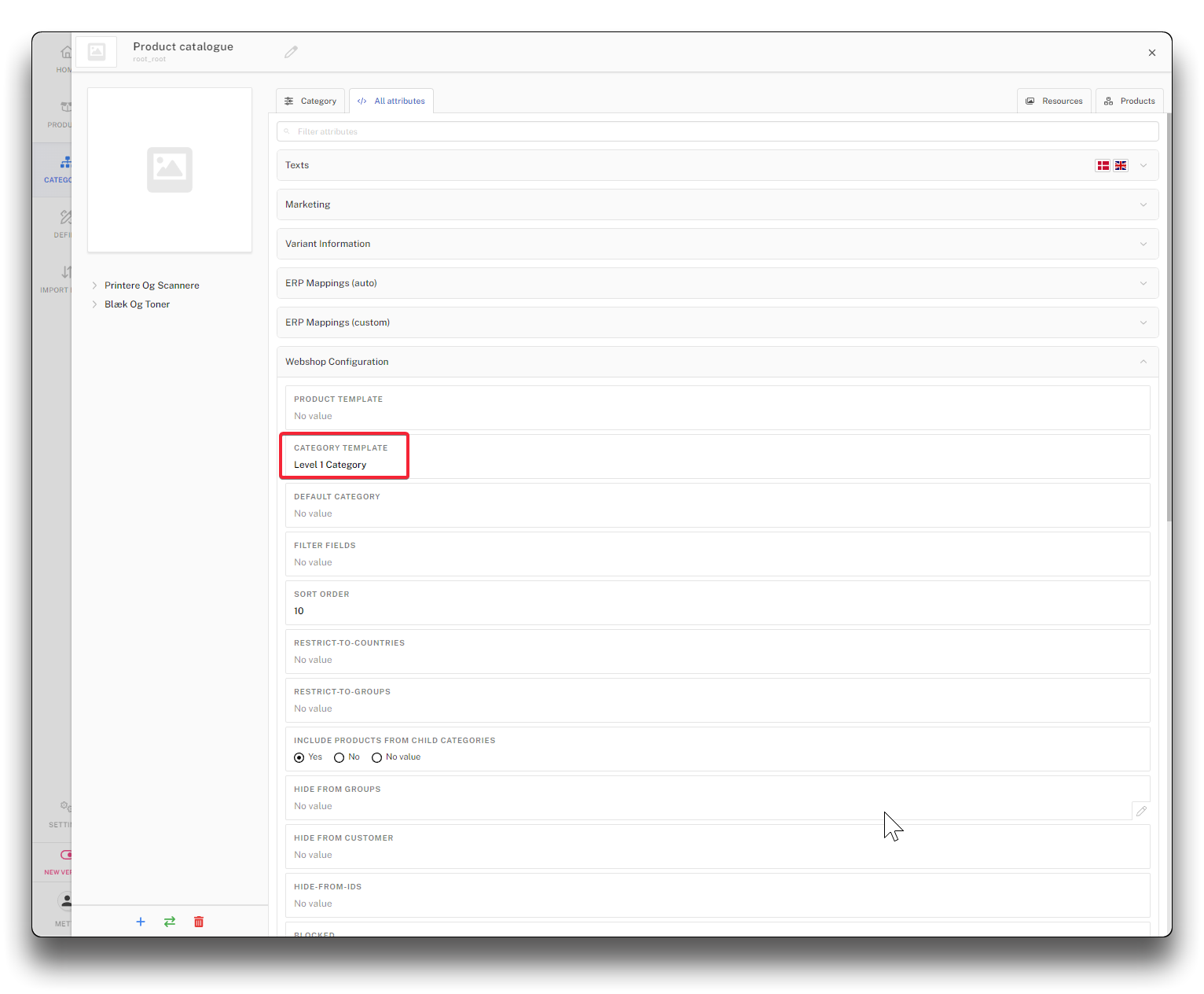 Your choice will now be visible as shown below, and can be edited at any time. Continue with all the categories you wish to attach a specific template to. In Umbraco you will continue to have your Default template defined as "System default". This will mean that any categories that does not have a special template assigned to them in PIM, will use the default template.