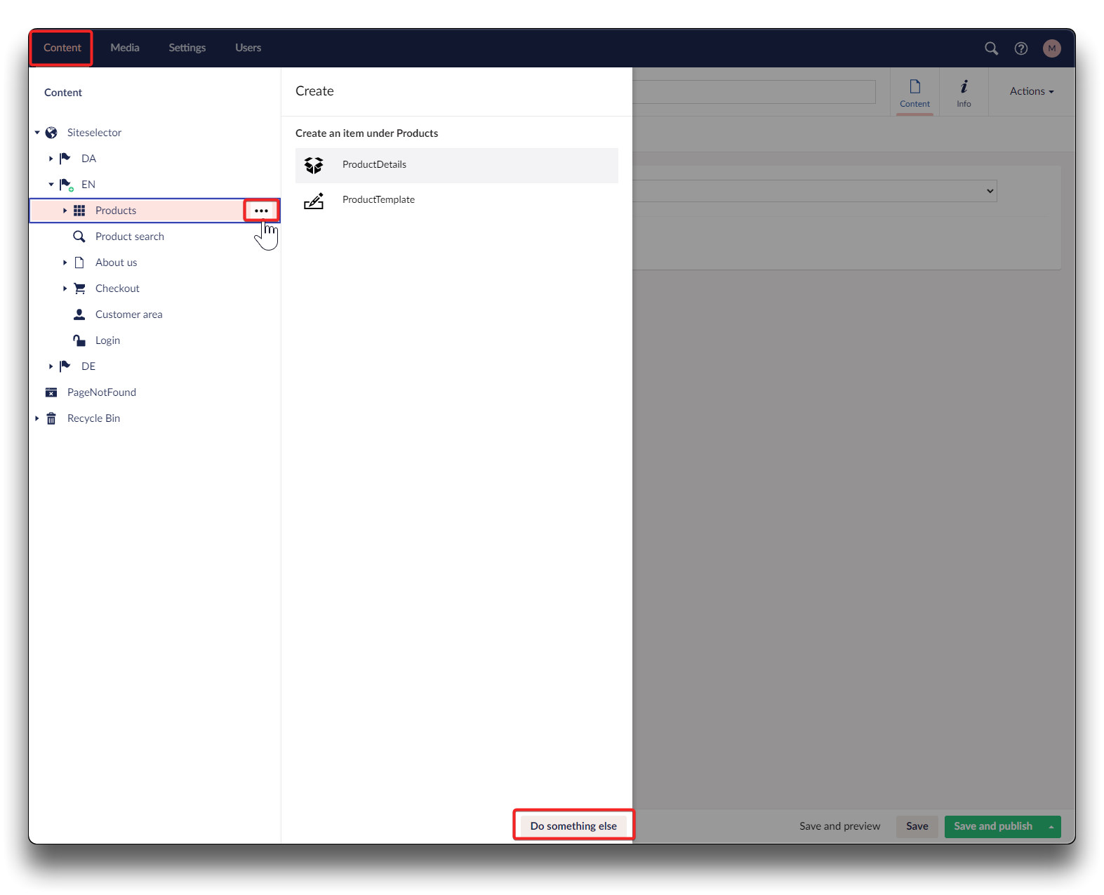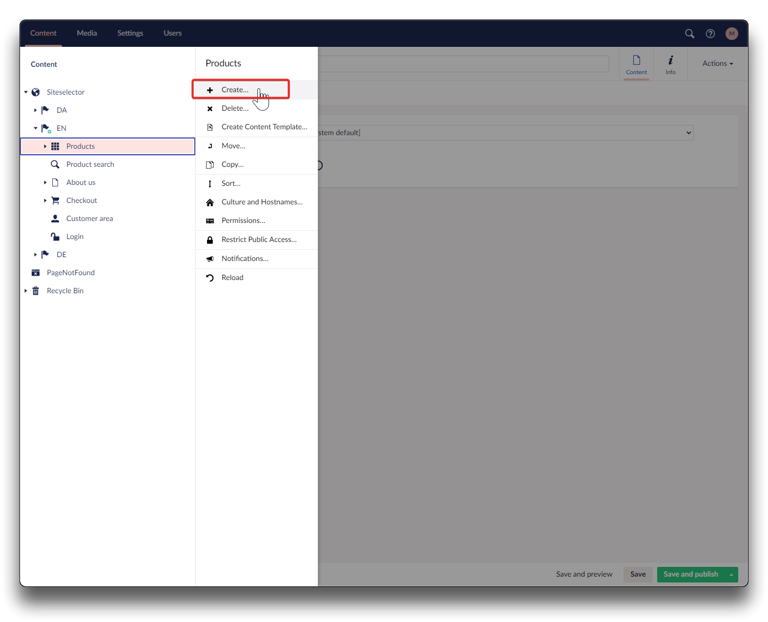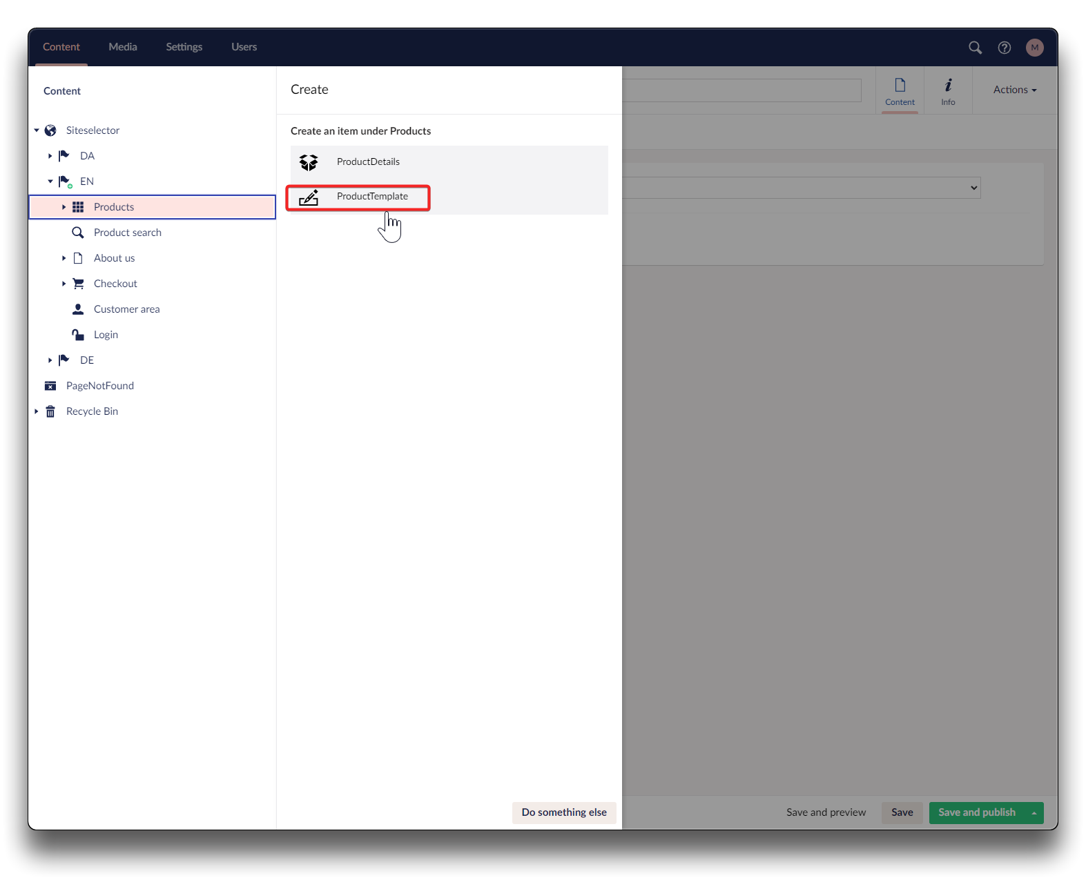 Choose "ProductTemplate", give it a name and click "Save and publish"