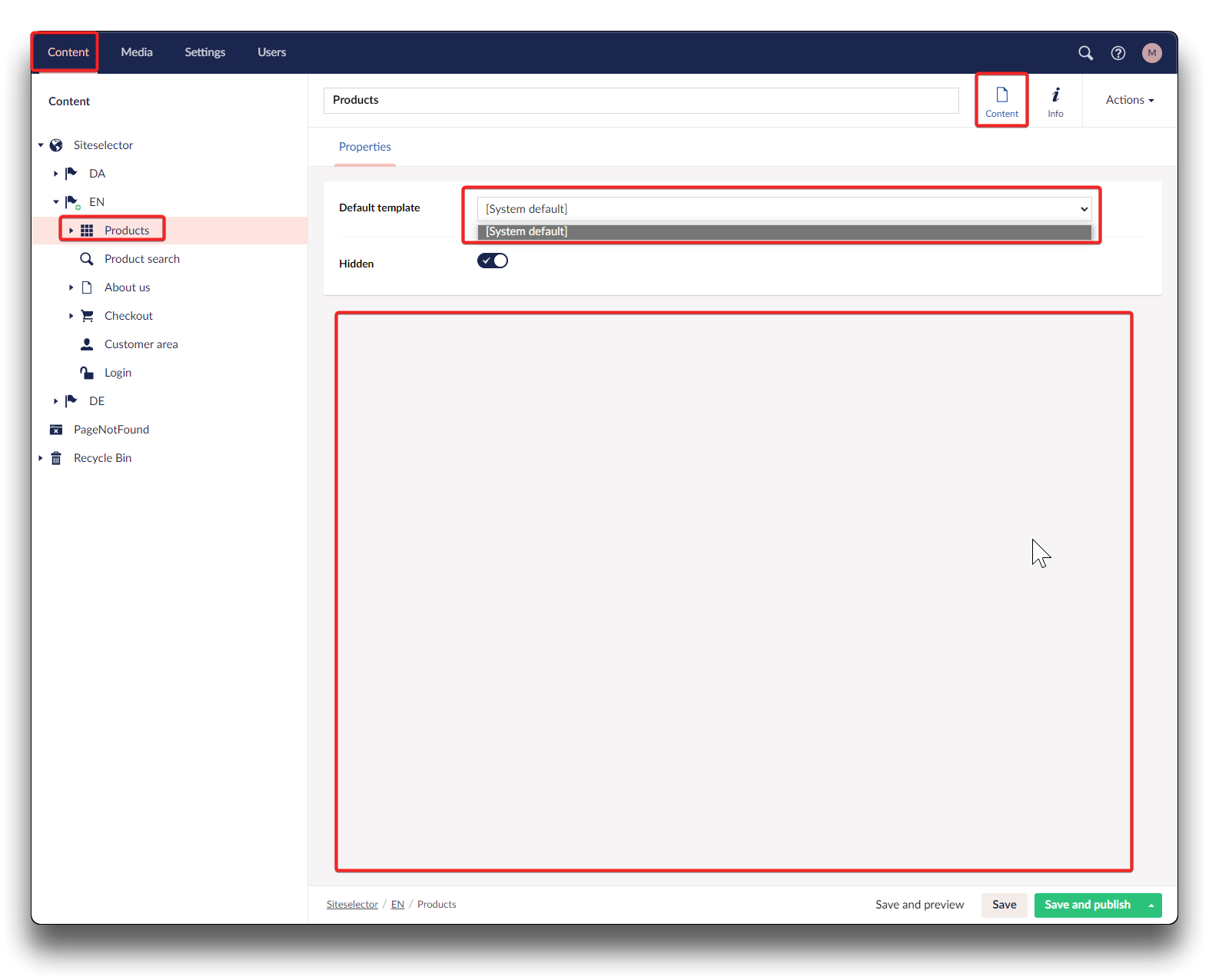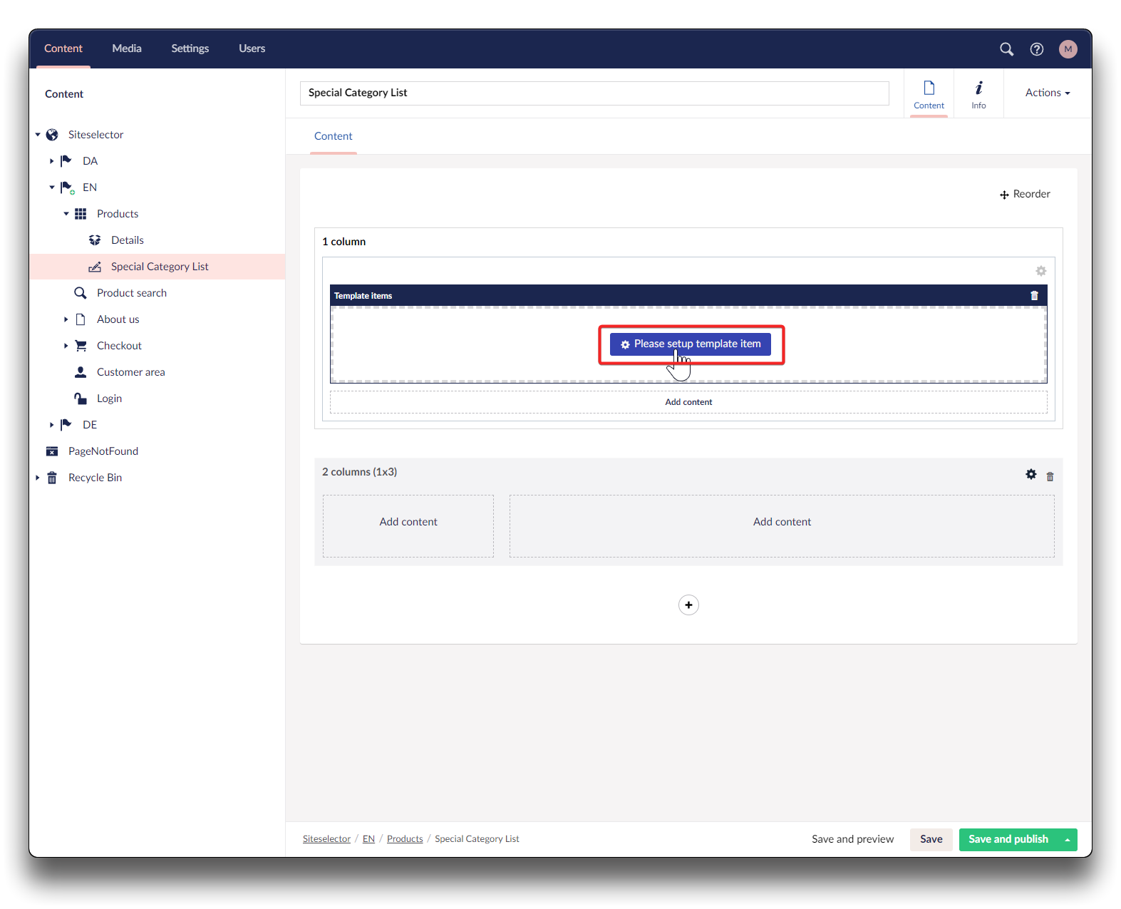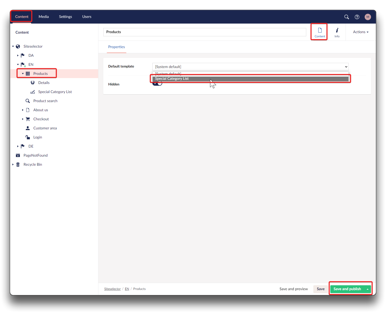 Choose "ProductTemplate", give it a name and click "Save and publish"