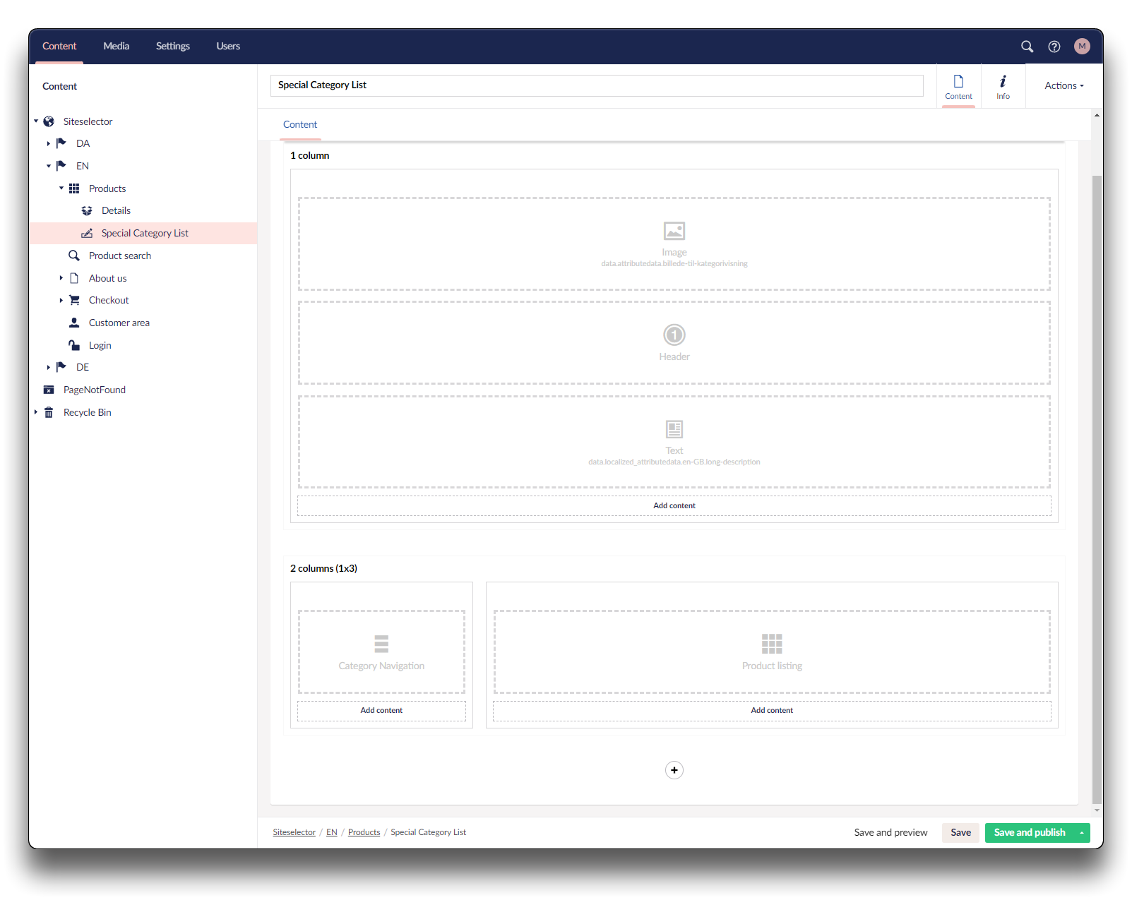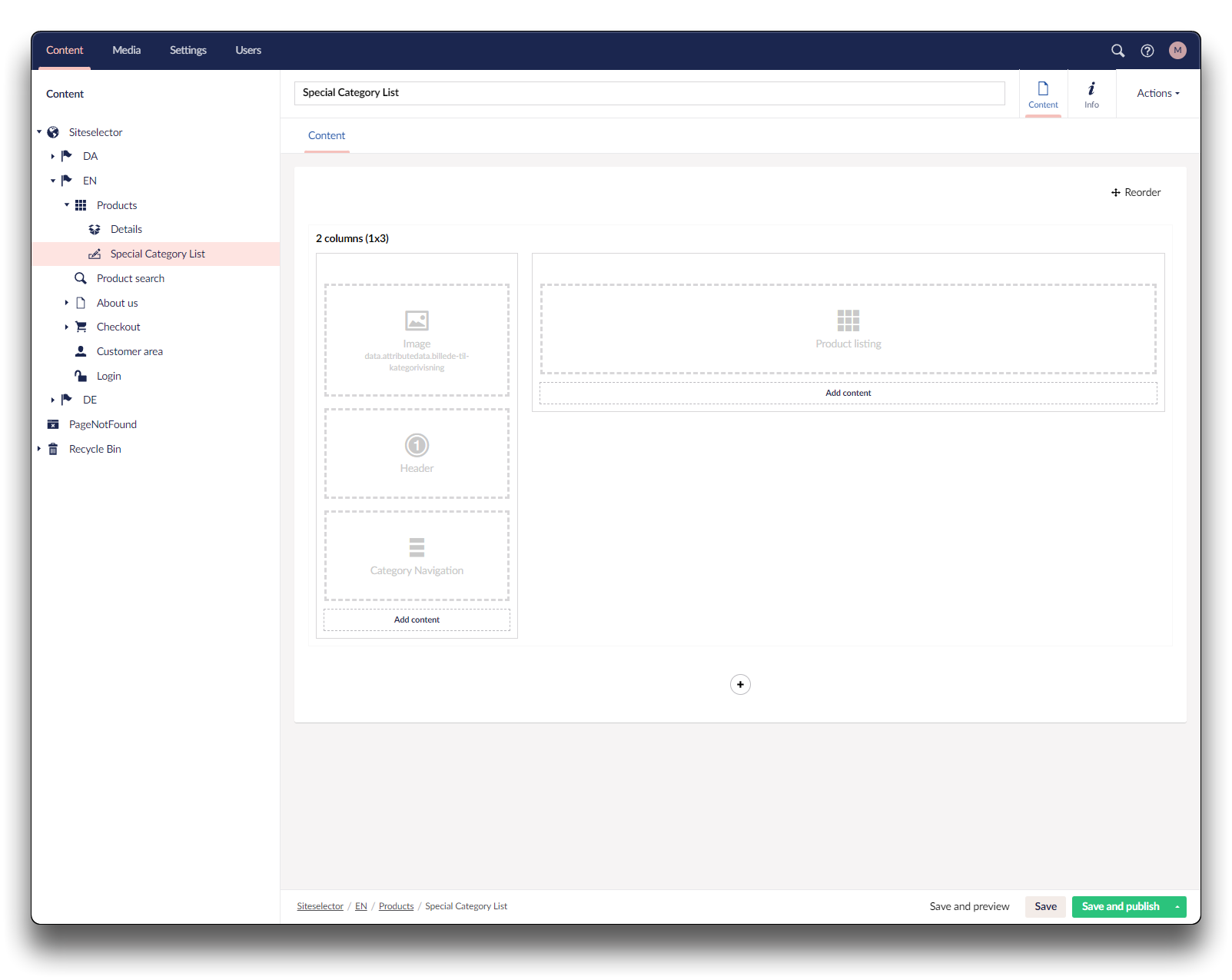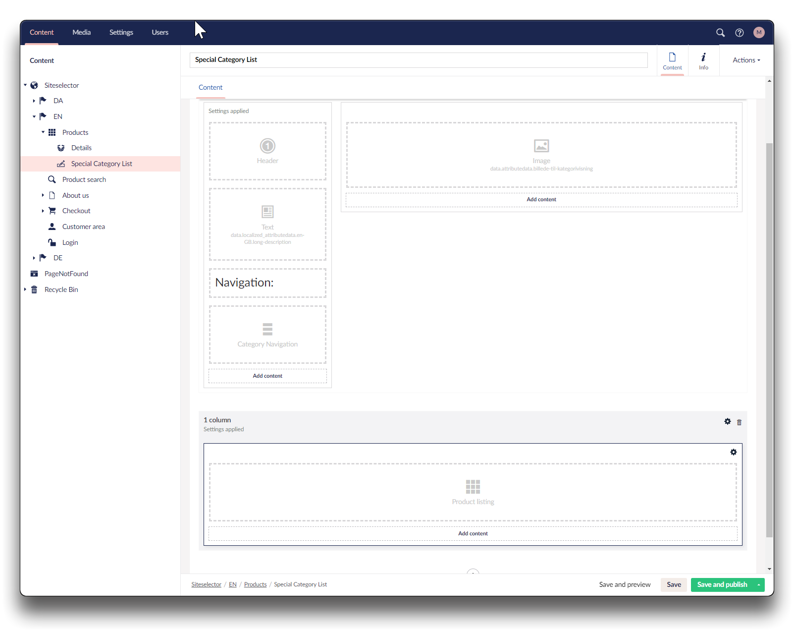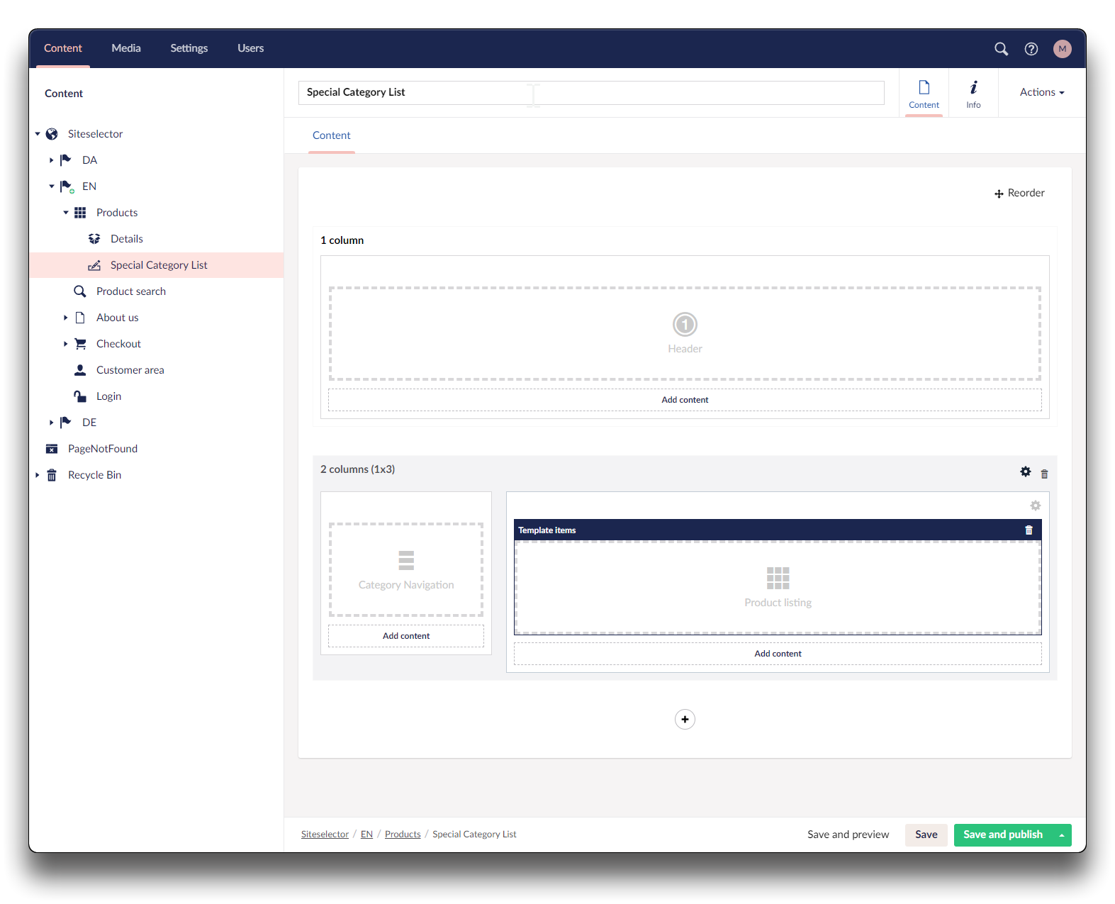 As shown in step 4, the template now contains a headline (name of the category) in the top, and a divided row with Category navigation to the left, and product-listing to the right.