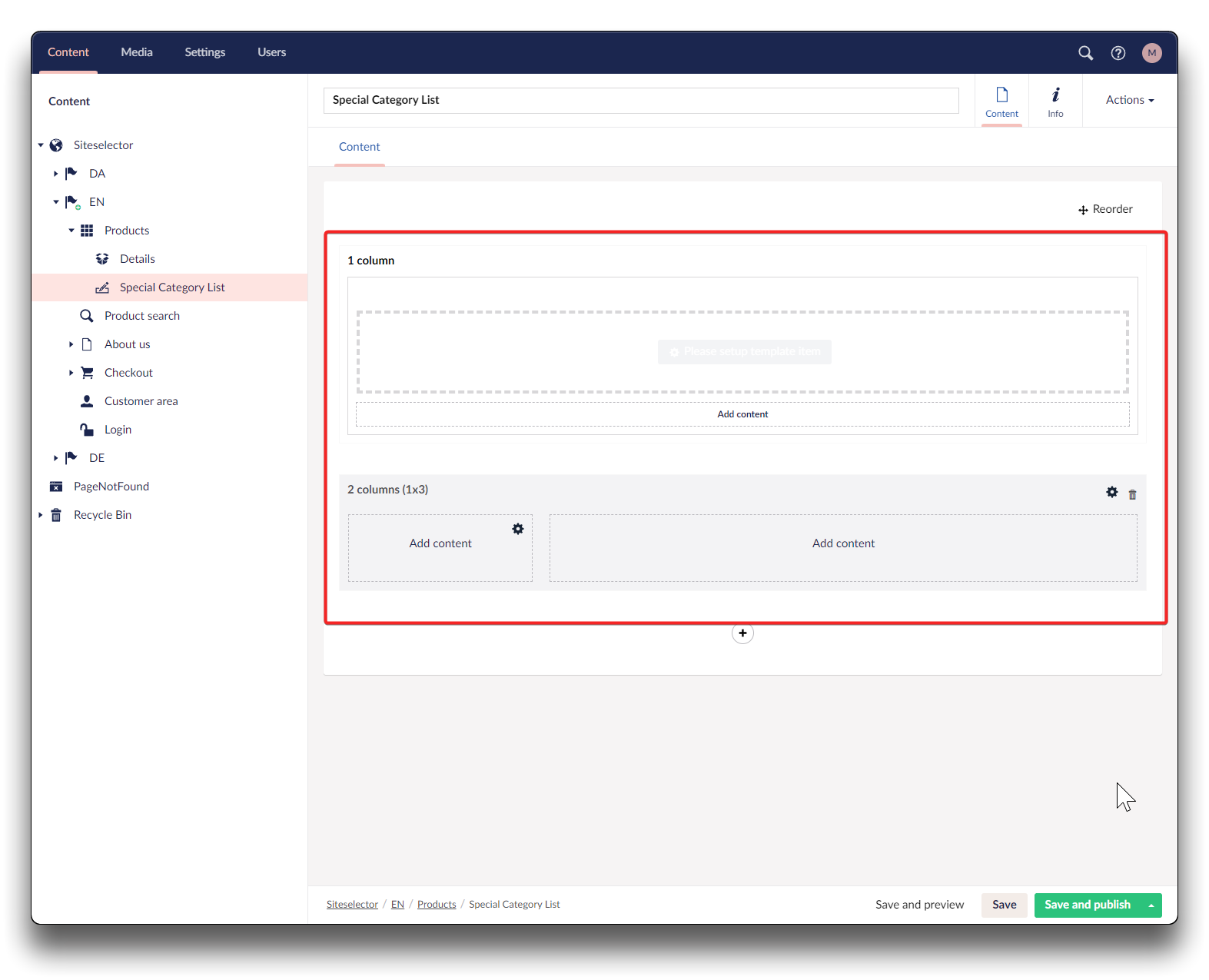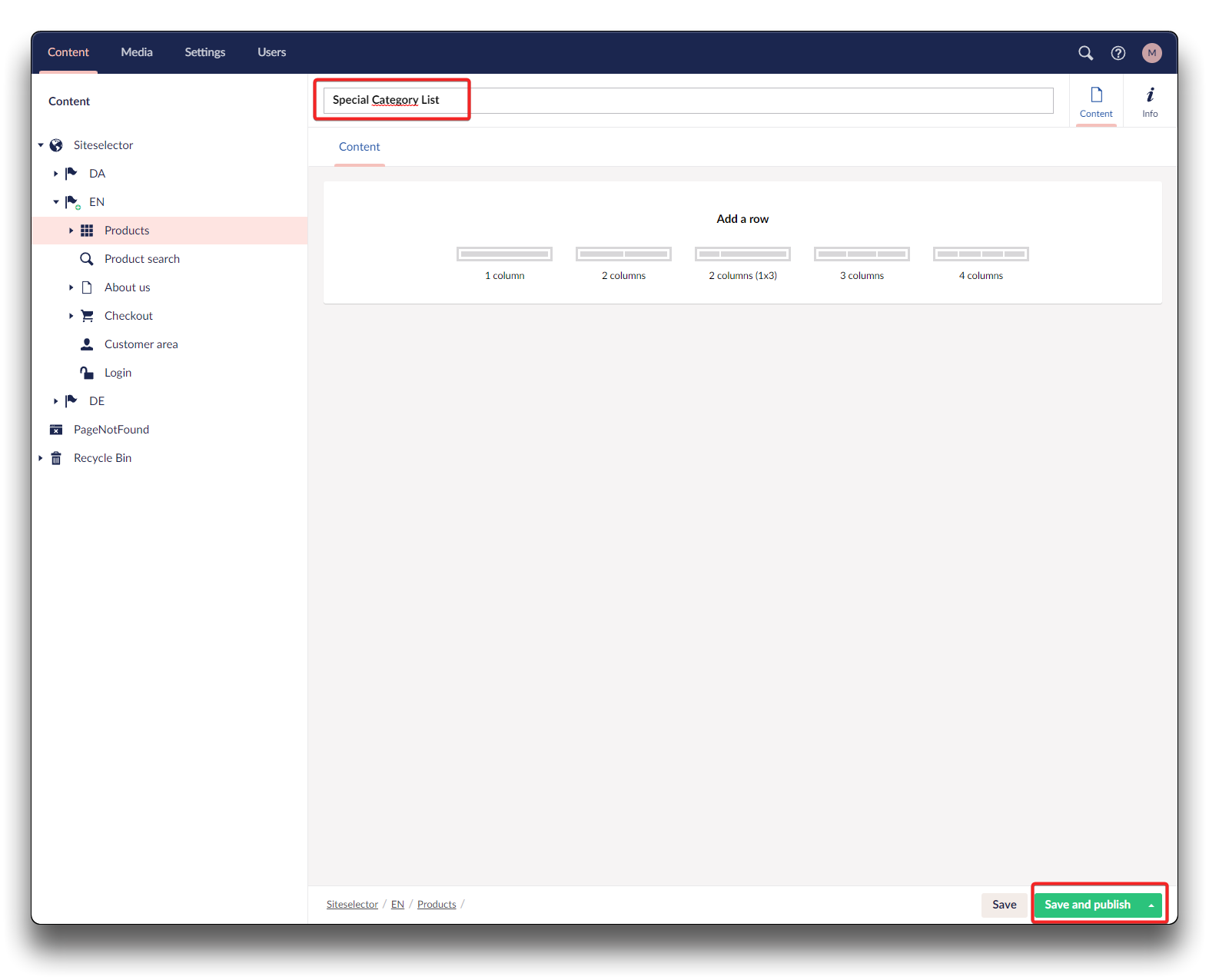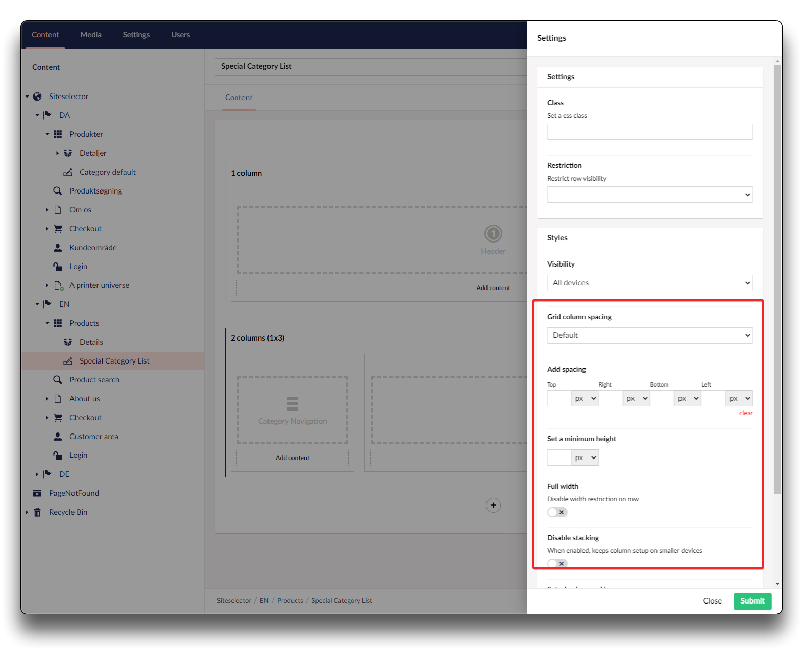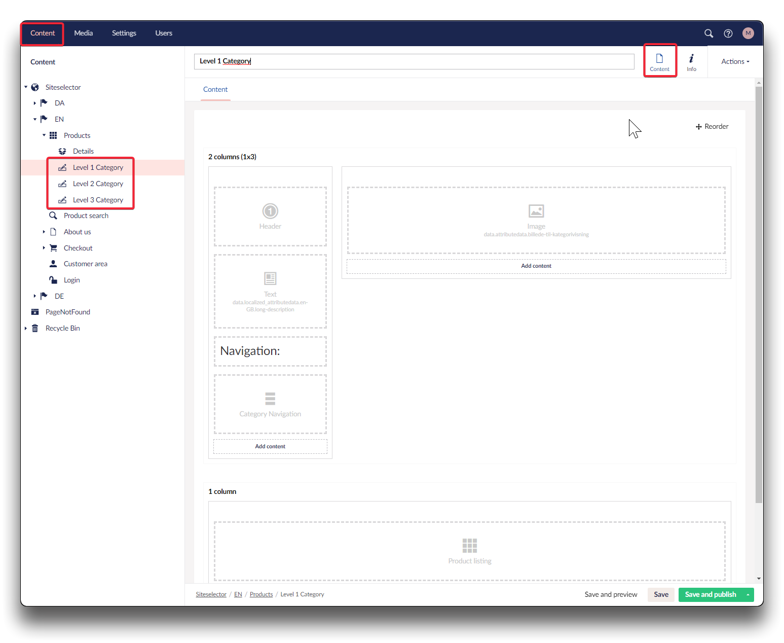 As shown in step 4, the template now contains a headline (name of the category) in the top, and a divided row with Category navigation to the left, and product-listing to the right.