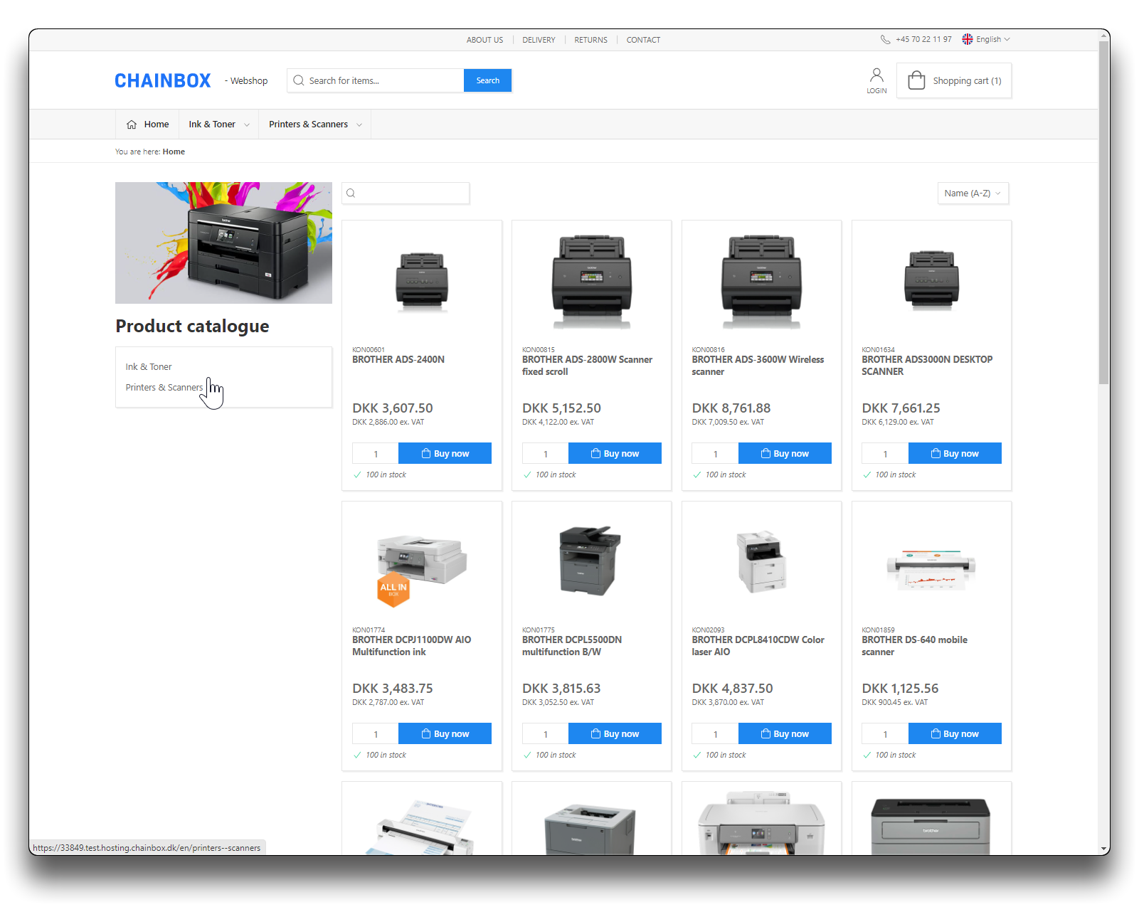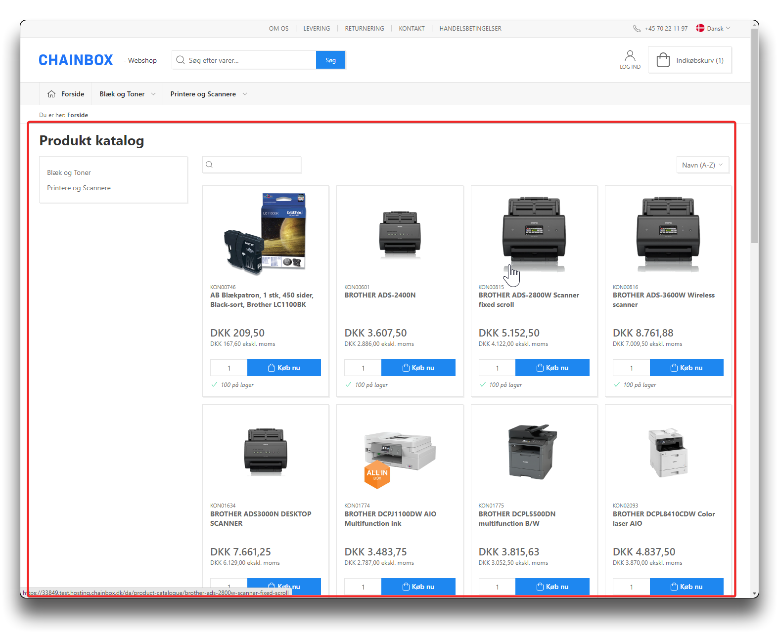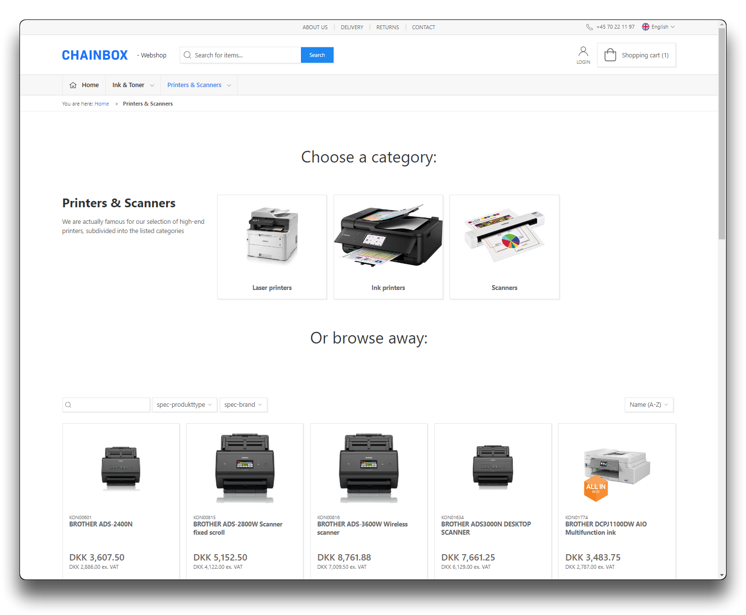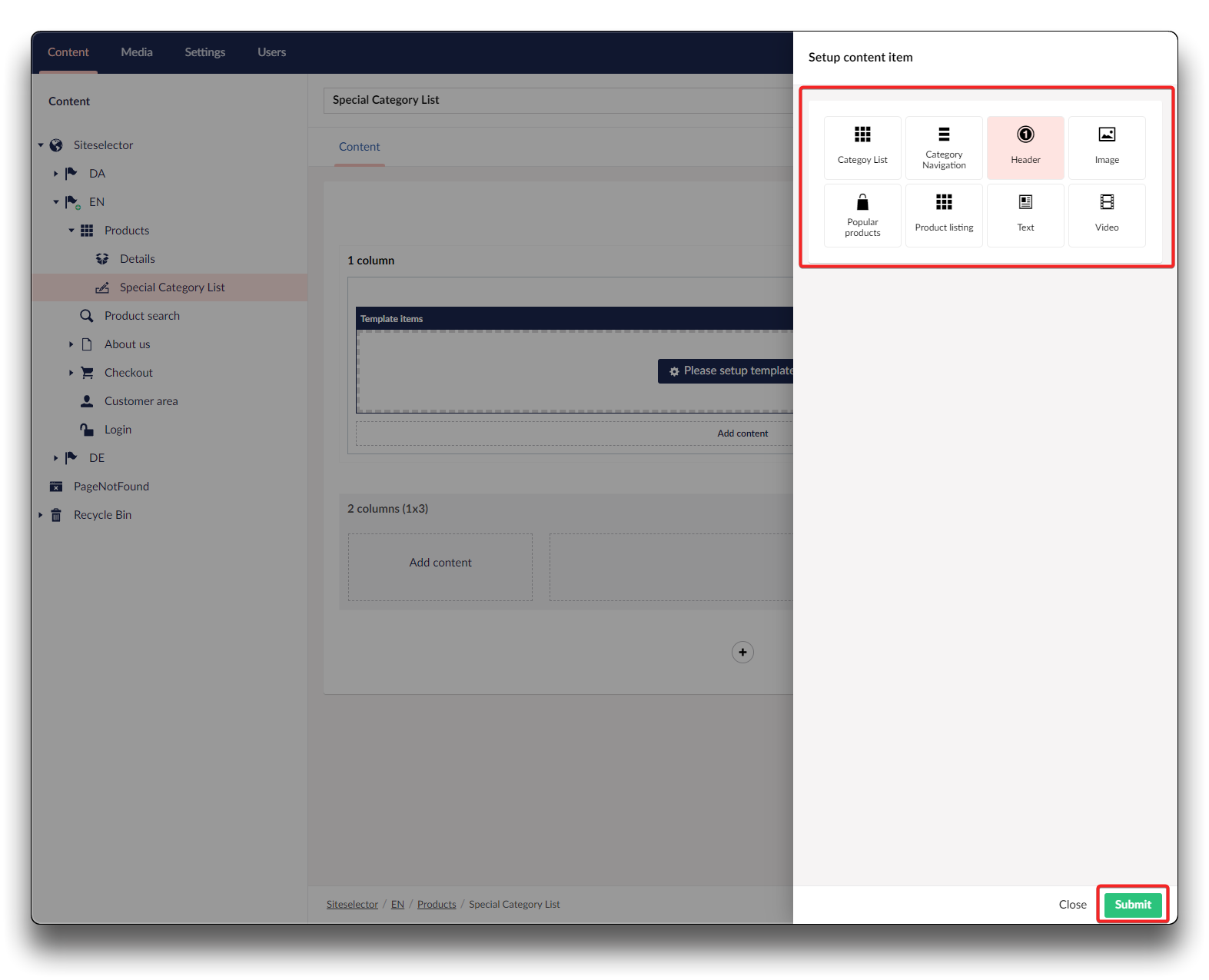 As shown in step 4, the template now contains a headline (name of the category) in the top, and a divided row with Category navigation to the left, and product-listing to the right.
