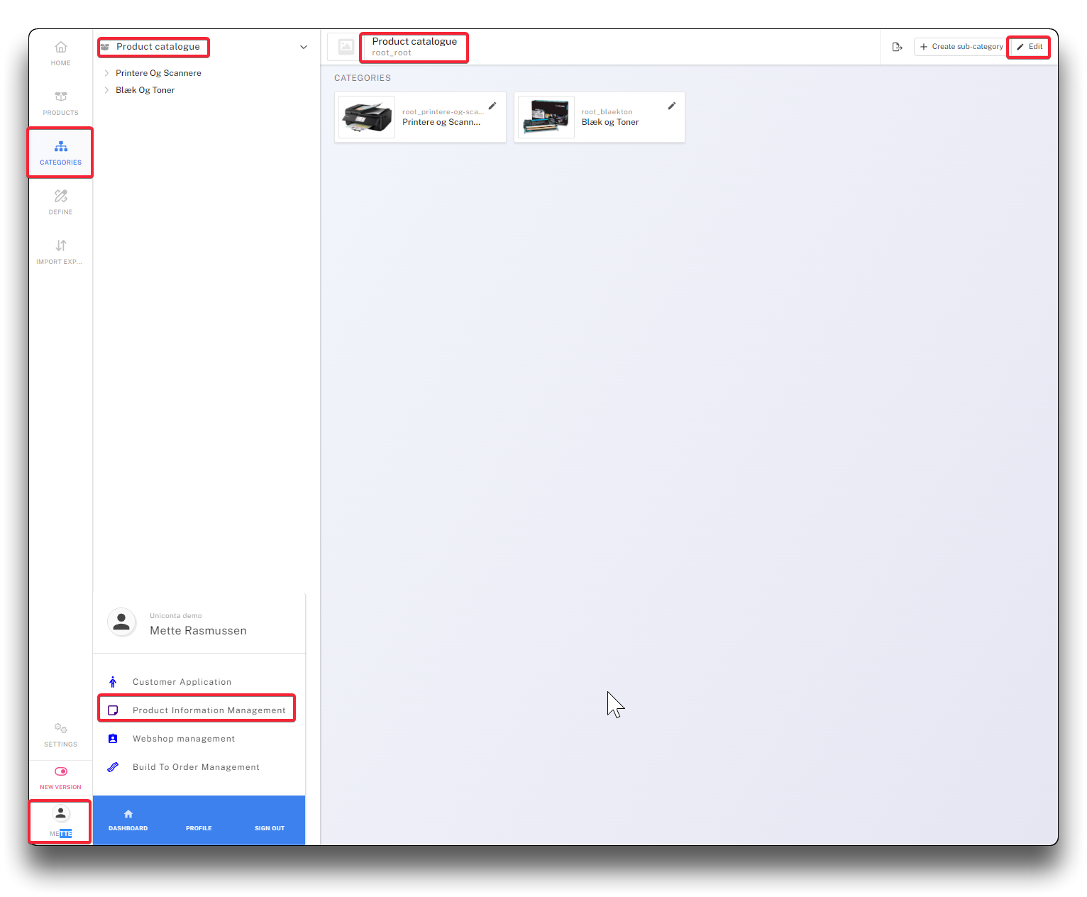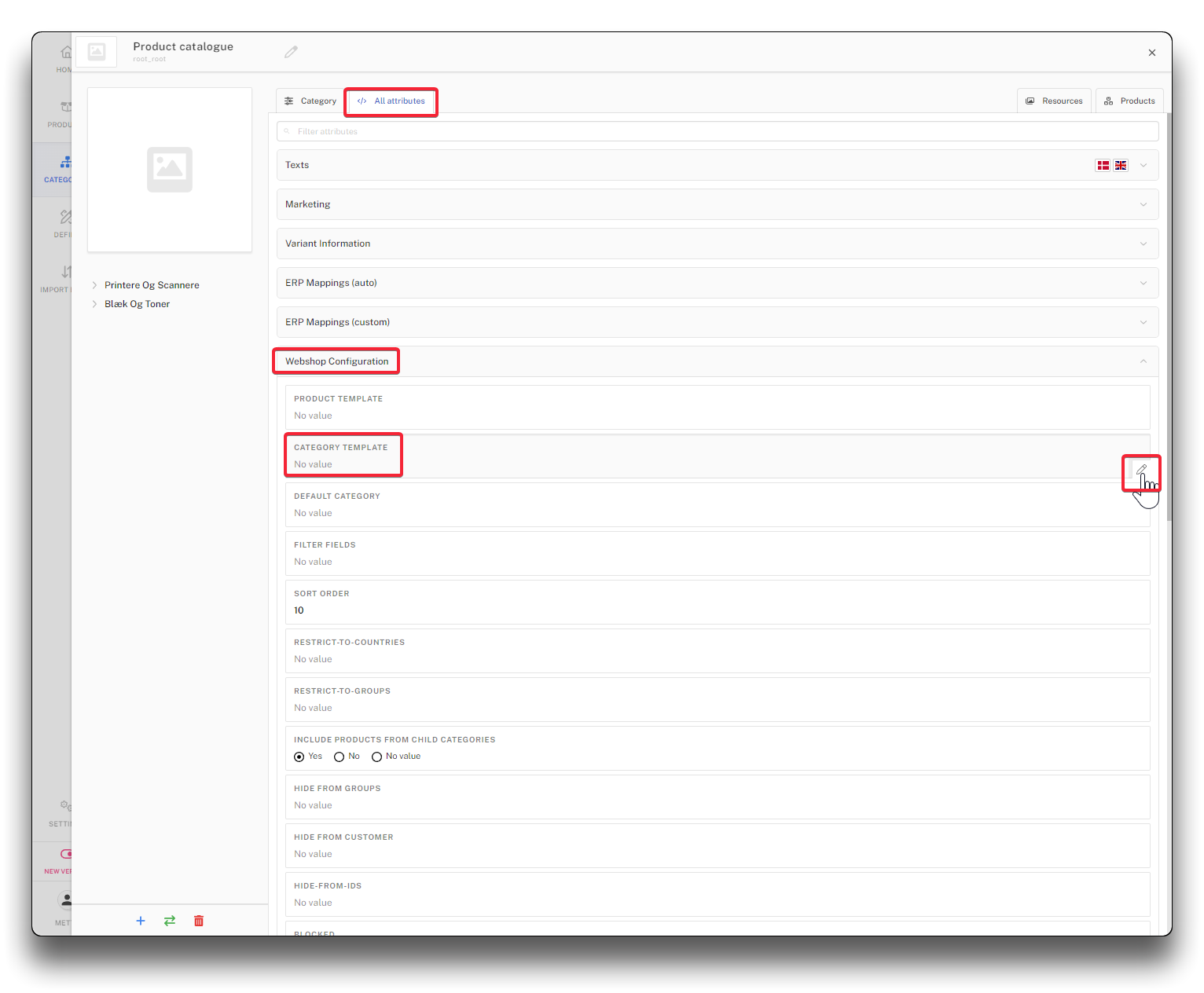 Navigate to your category of choice and click "Edit", find your "Category template" filed under the section "All attributes", "Webshop Configuration", click the edit-icon