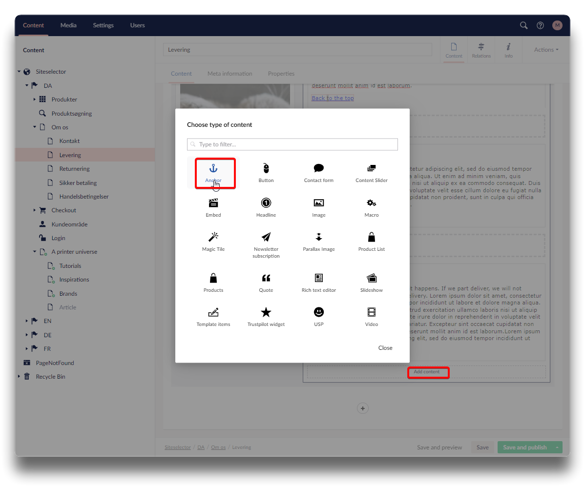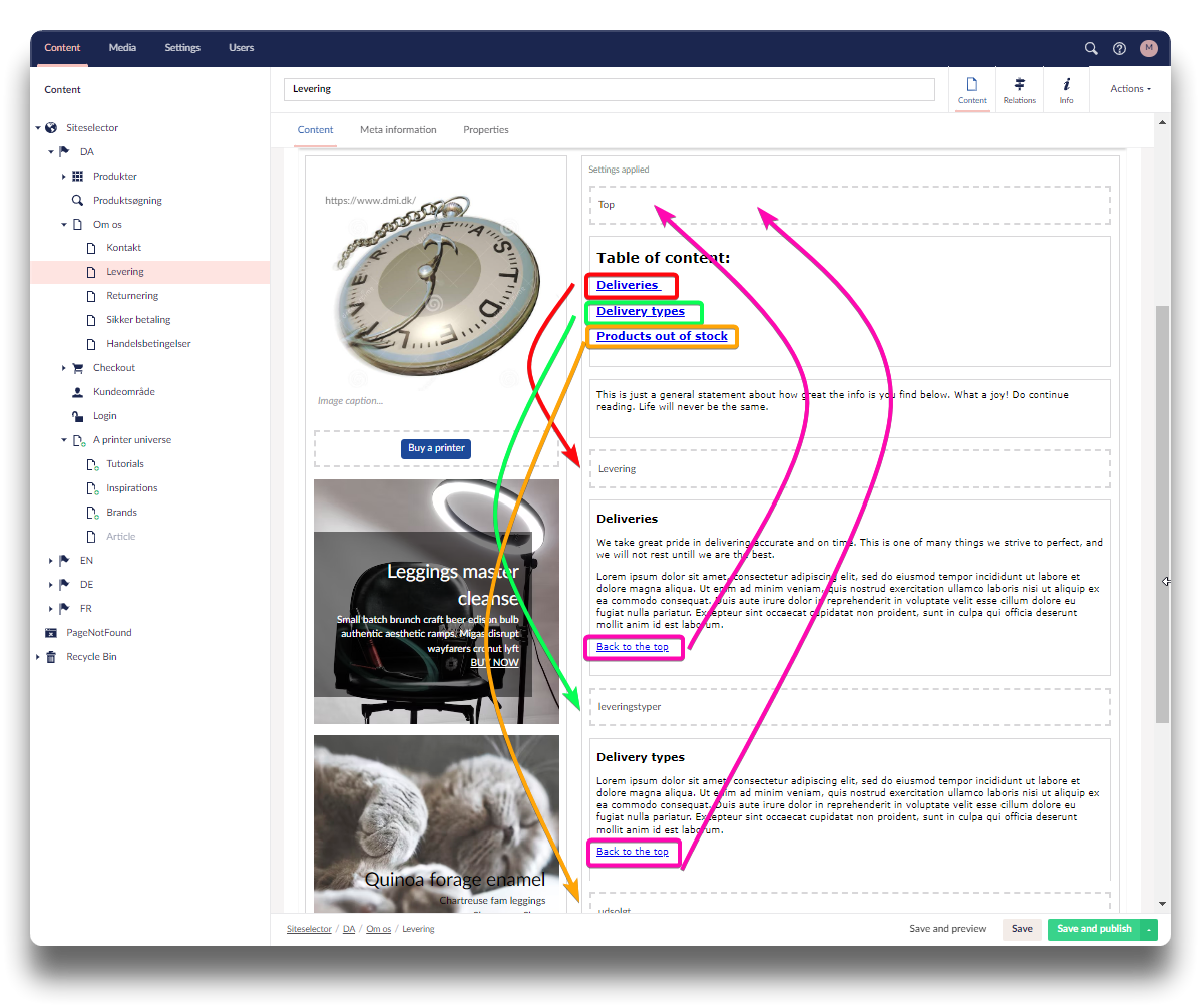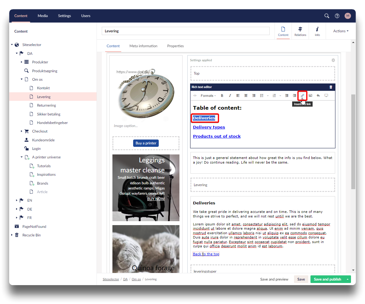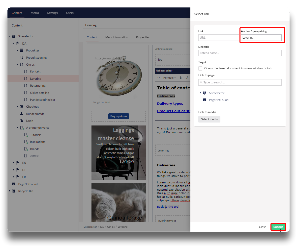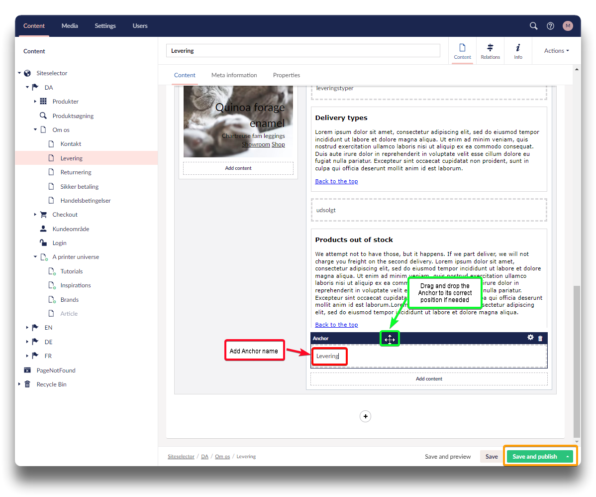 Now click "Add" on the column you wish to be the destination, choose "Anchor" and add same name as above. Click "Save and publish"
