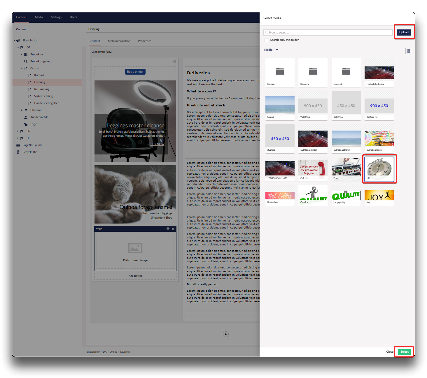 Choose "Click to Insert Image". If your image is not visible here, press Upload to browse and upload you image - then mark and "Select"
