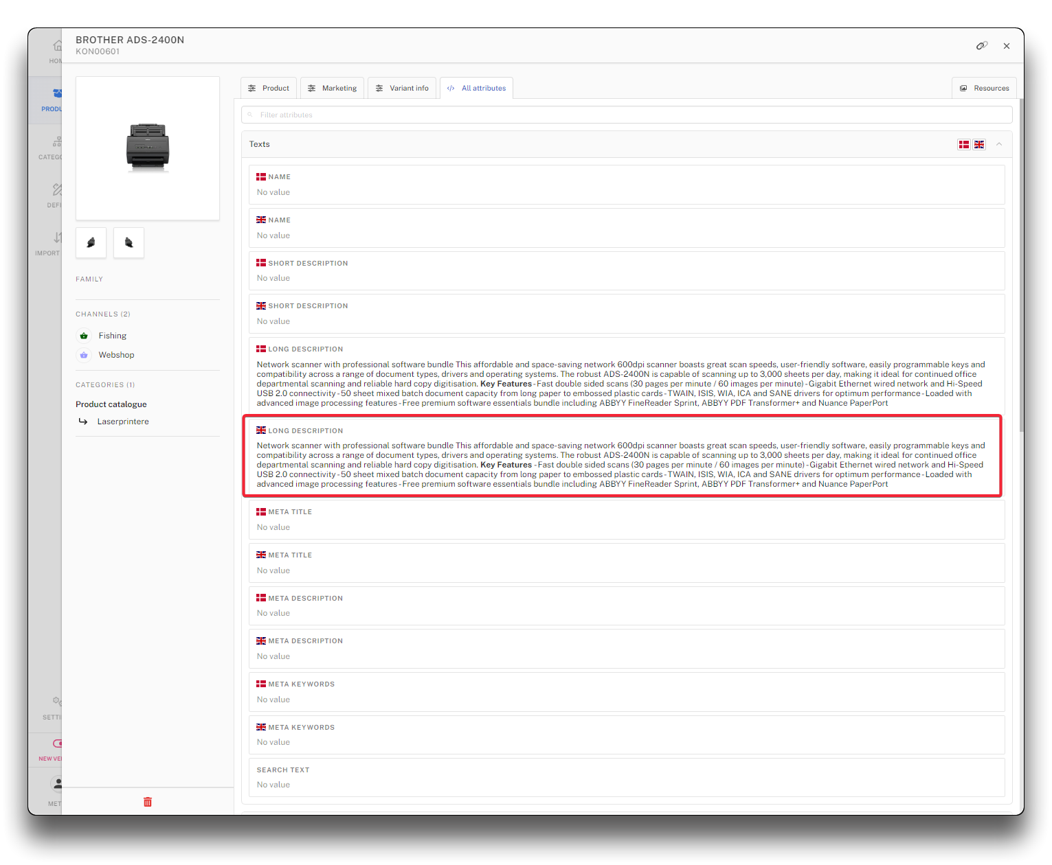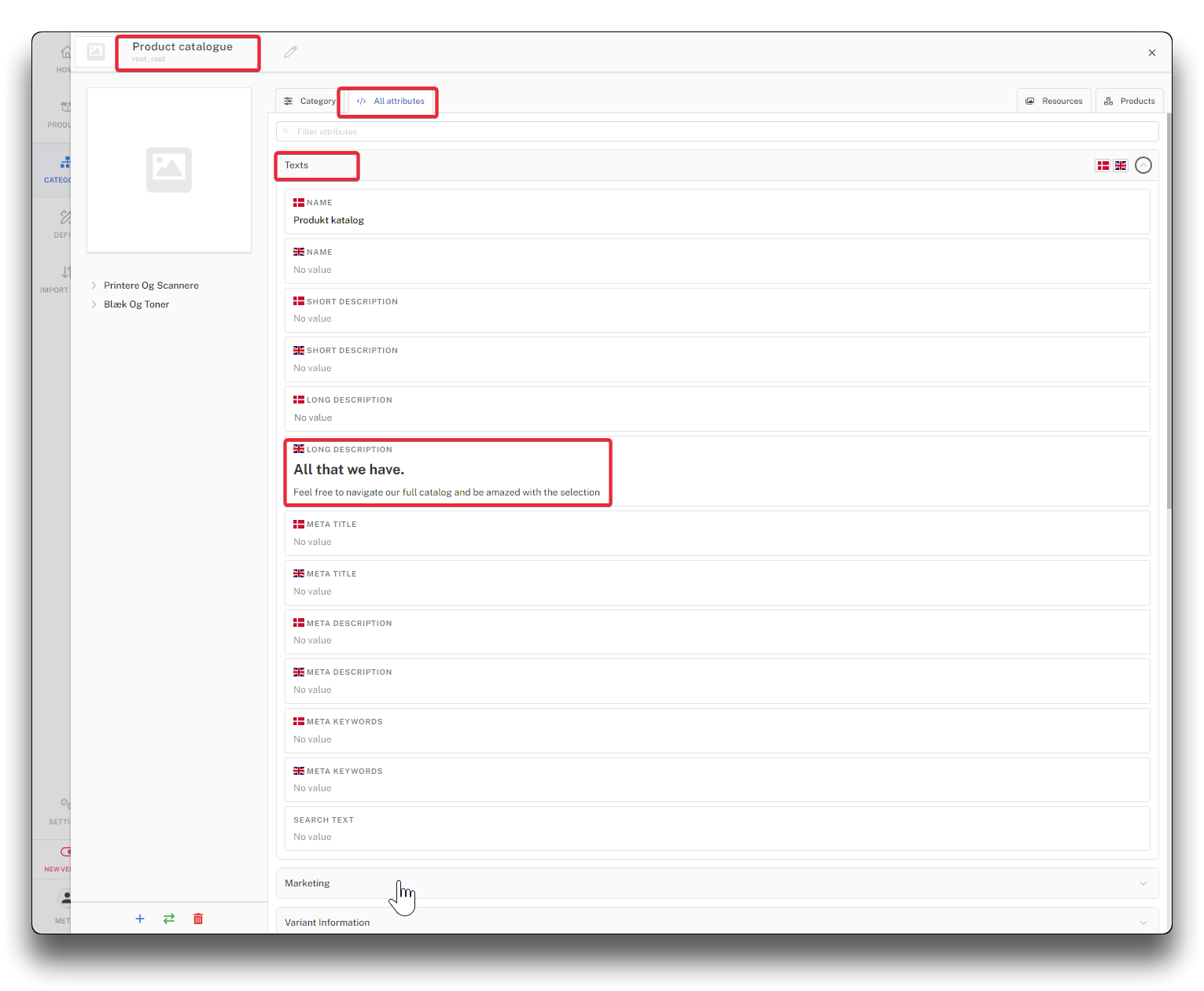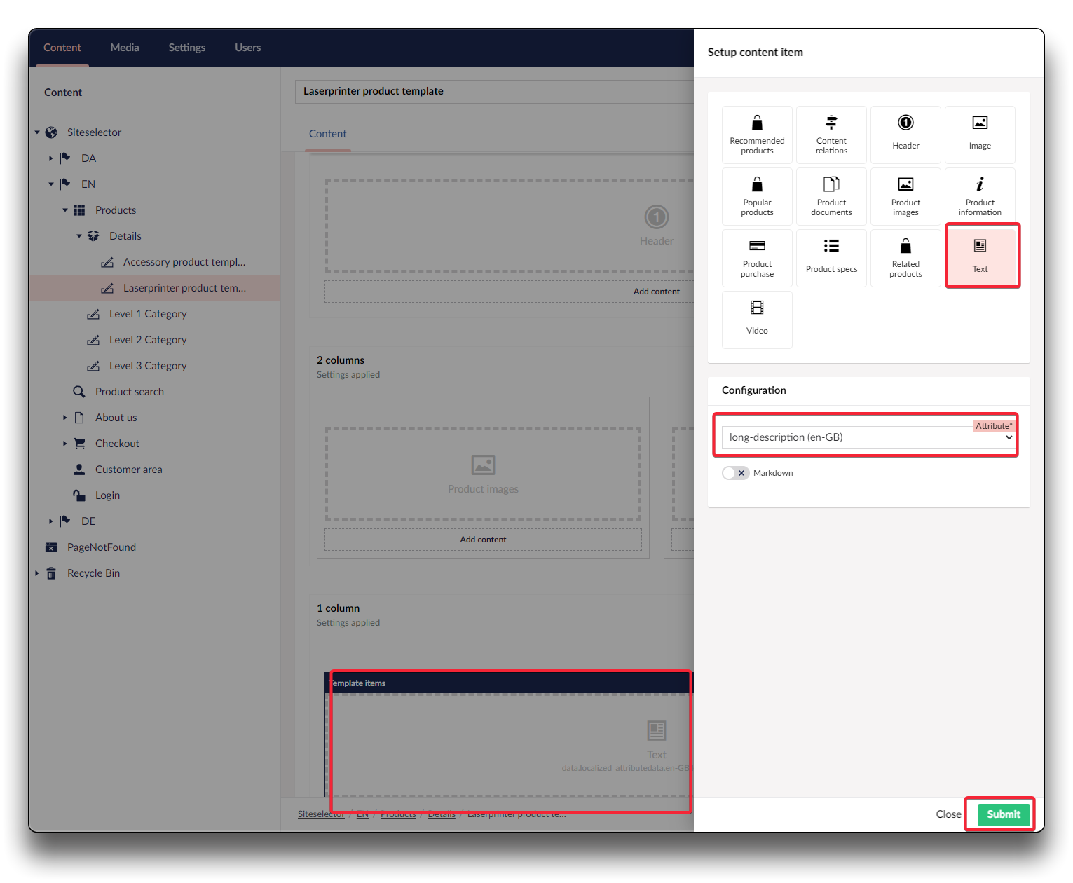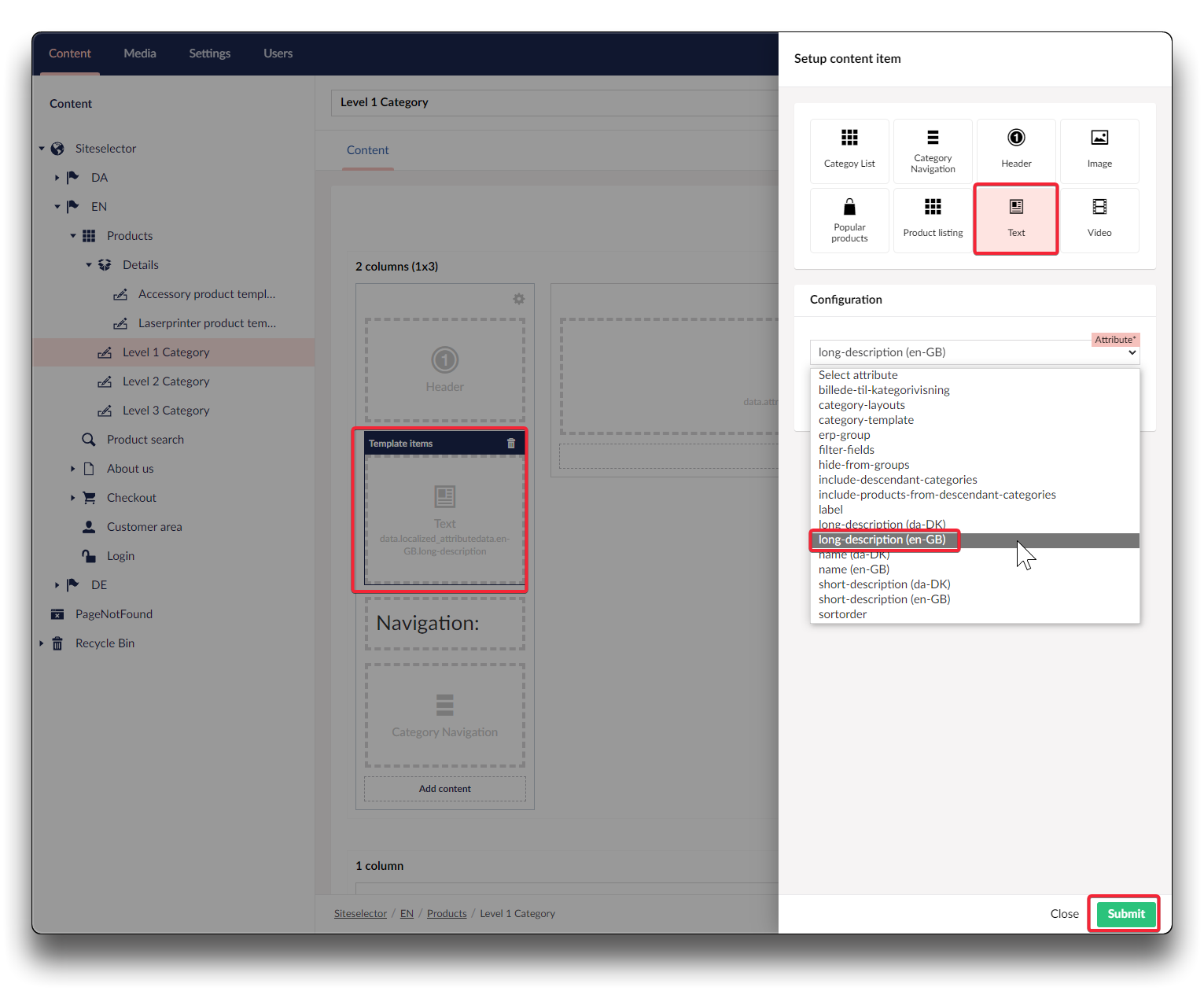 Attach text to the template and choose what text-field in PIM should feed the content. Remember to ensure that all categories affected by this template has content in the chosen PIM-field.
