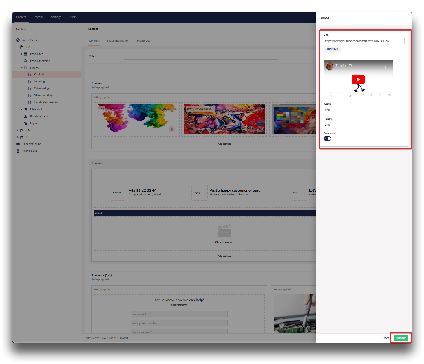 Insert URL and press "Retrieve". Set with and height if default needs to change. Click "Submit"