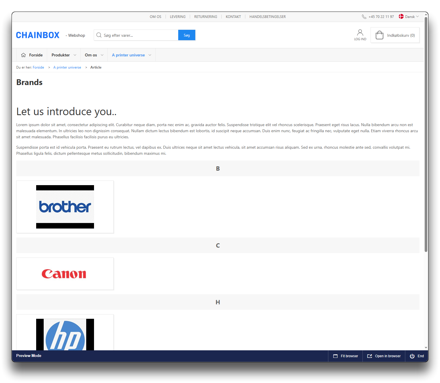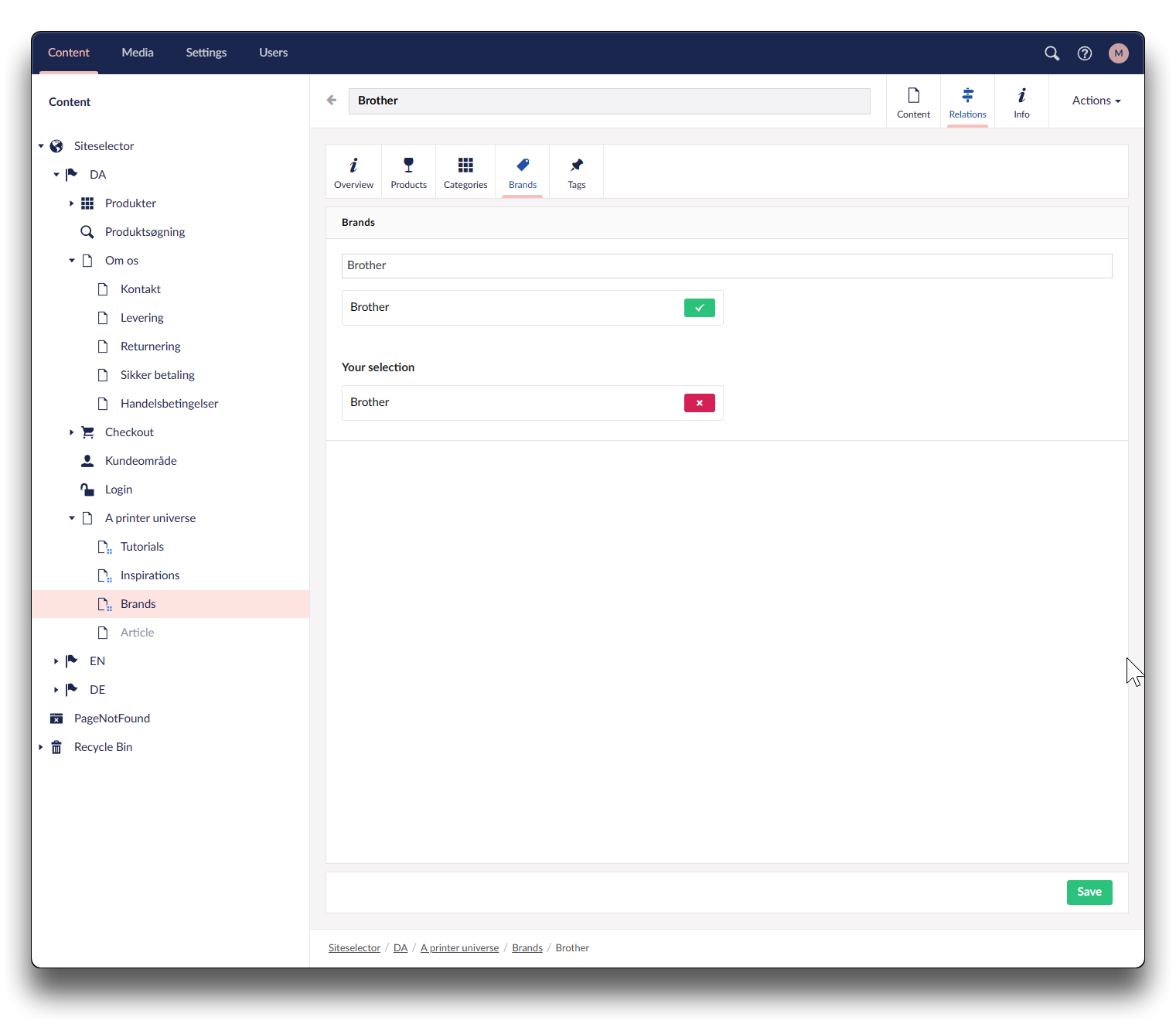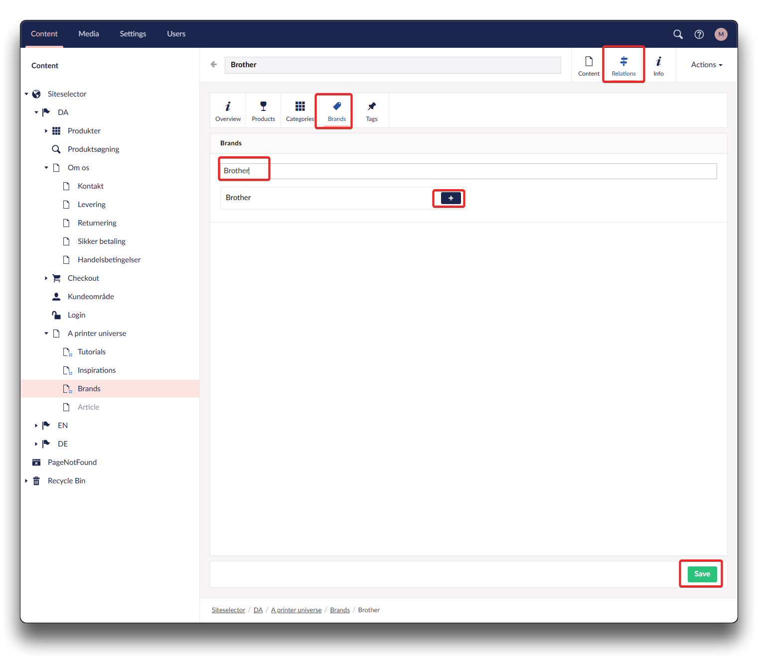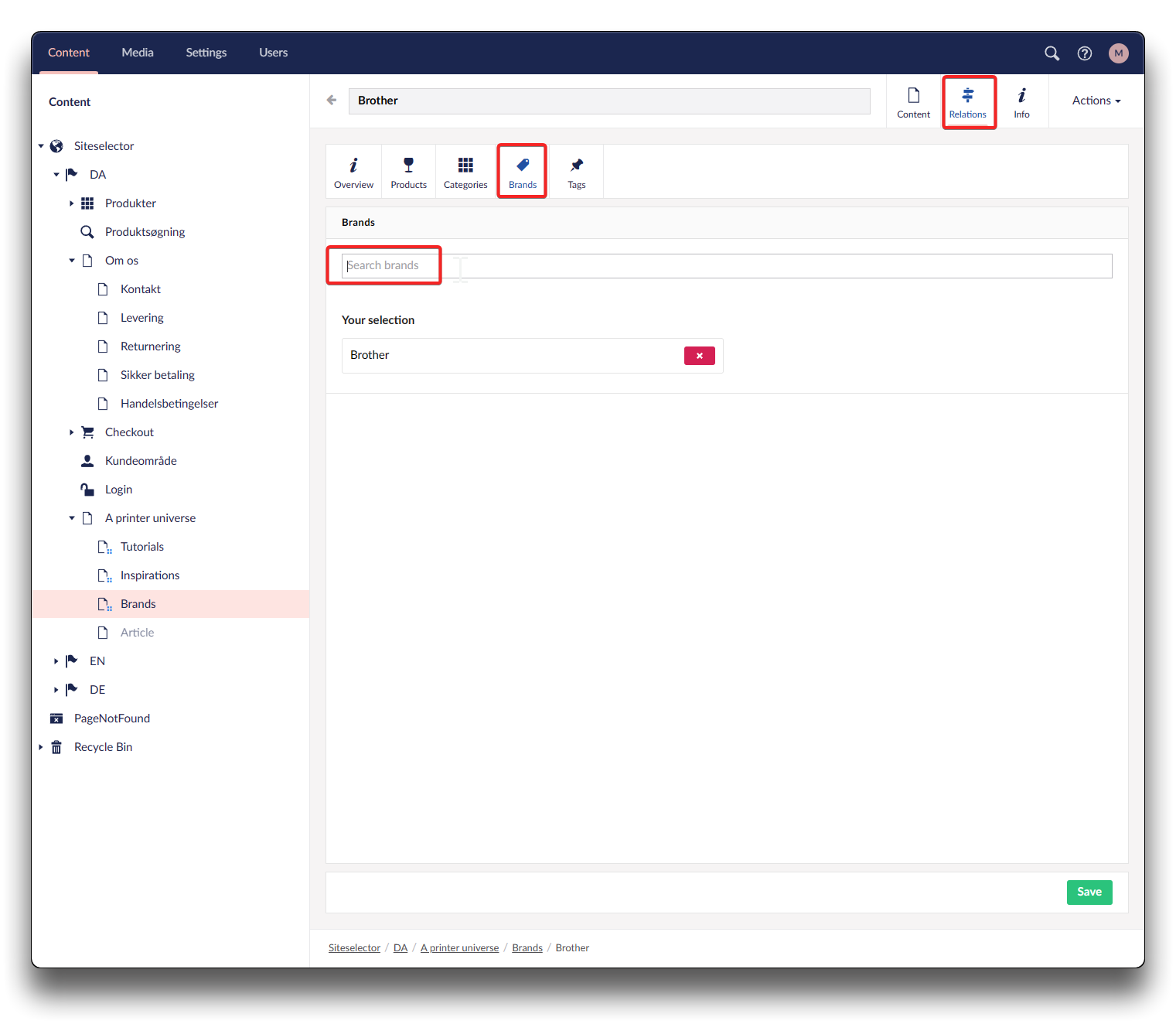 In order for the webshop to produce a Brandlist, a landingpage or child item needs to exist where Relations Brand is defined, this will also be the page you are taken to when clicking on a specific Brand on the BrandList. The Brand ALSO needs to correspond with the field Brand in the Product Information Management (PIM) system.