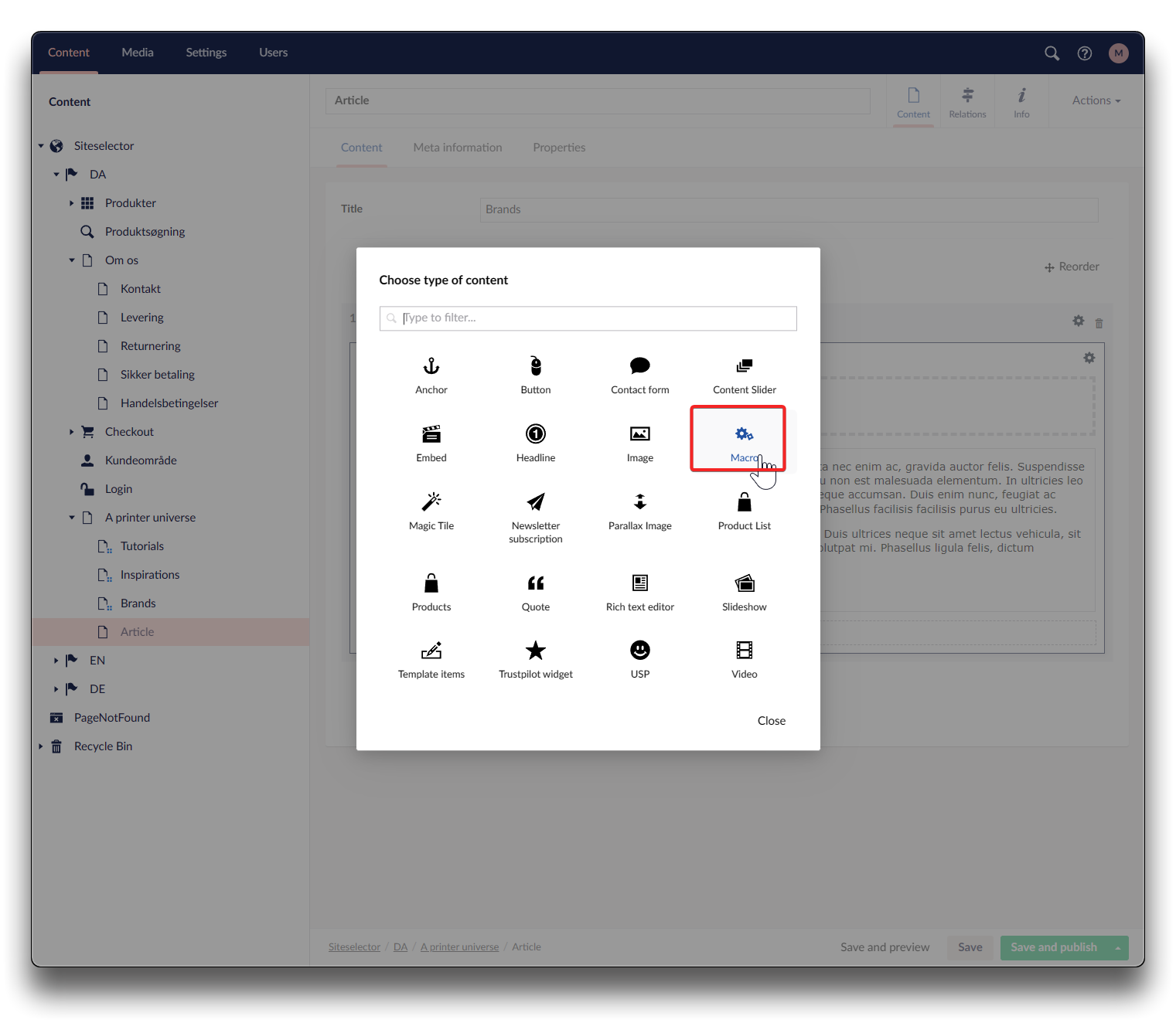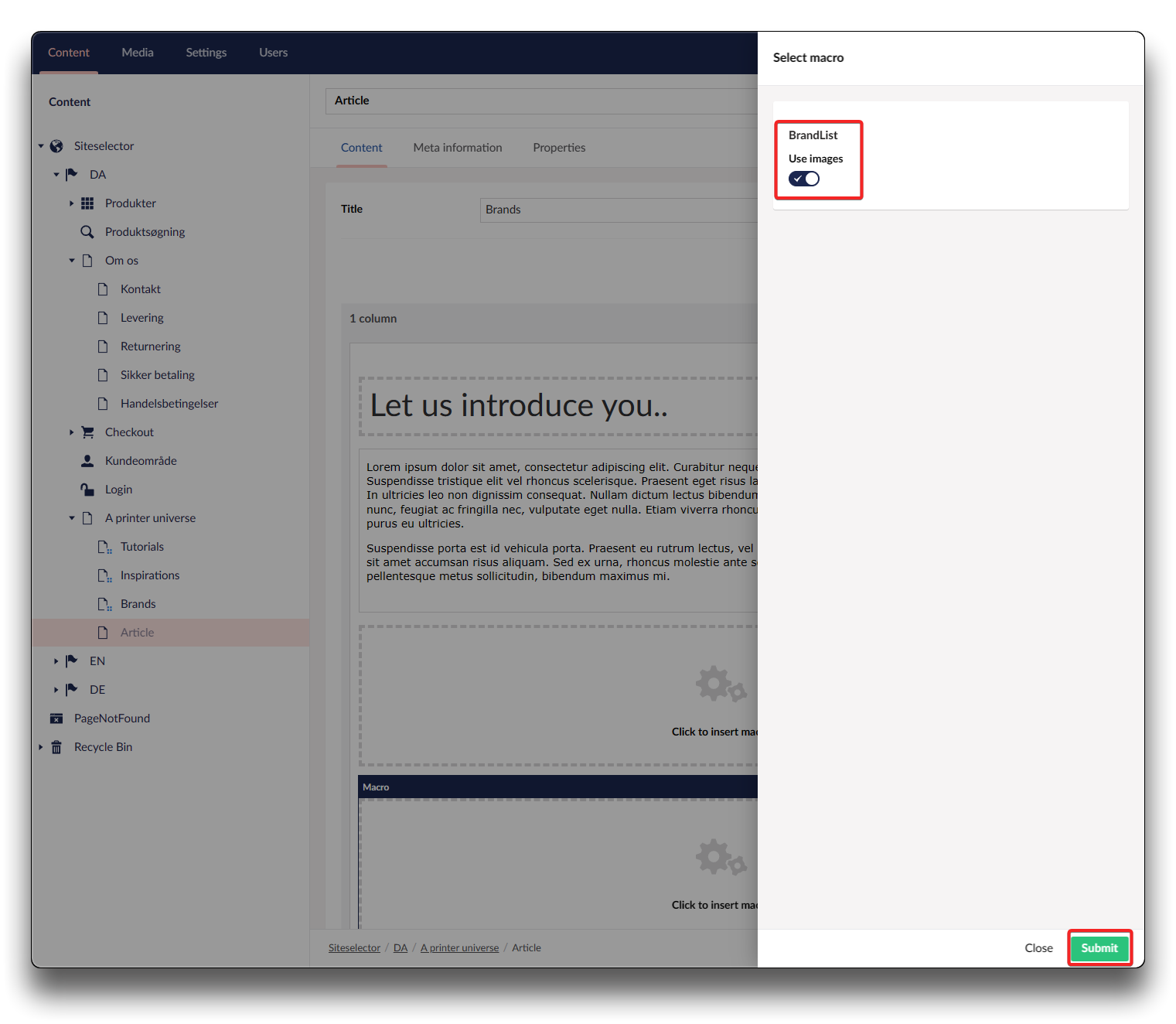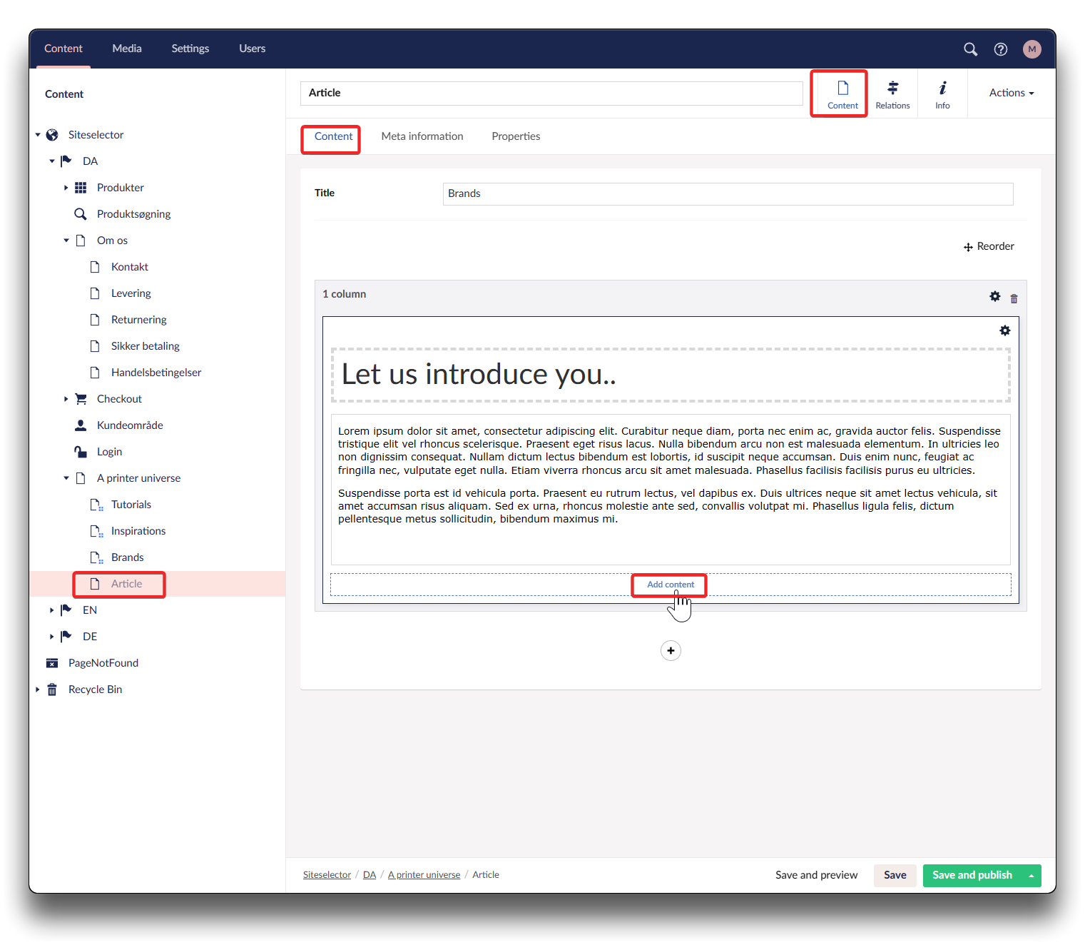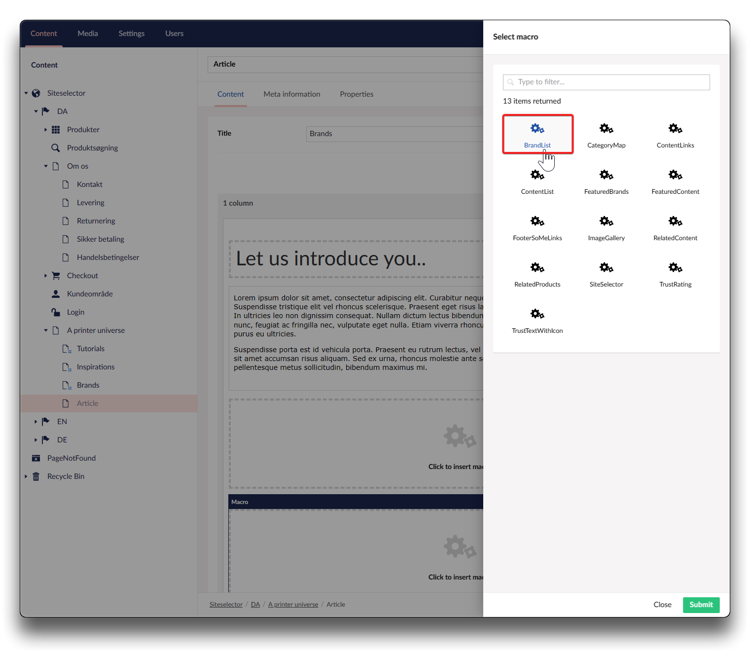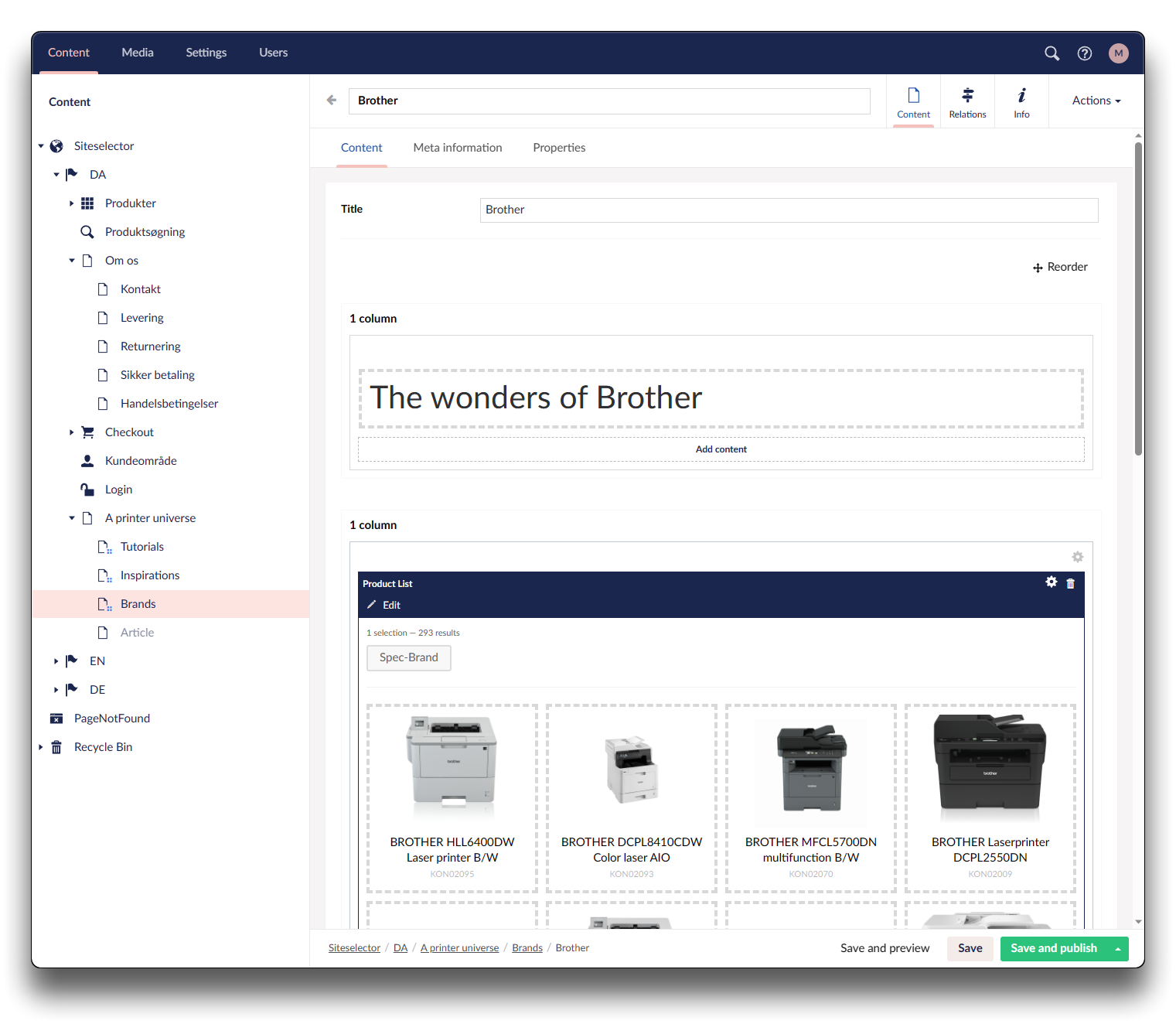 In order for the webshop to produce a Brandlist, a landingpage or child item needs to exist where Relations Brand is defined, this will also be the page you are taken to when clicking on a specific Brand on the BrandList. The Brand ALSO needs to correspond with the field Brand in the Product Information Management (PIM) system.