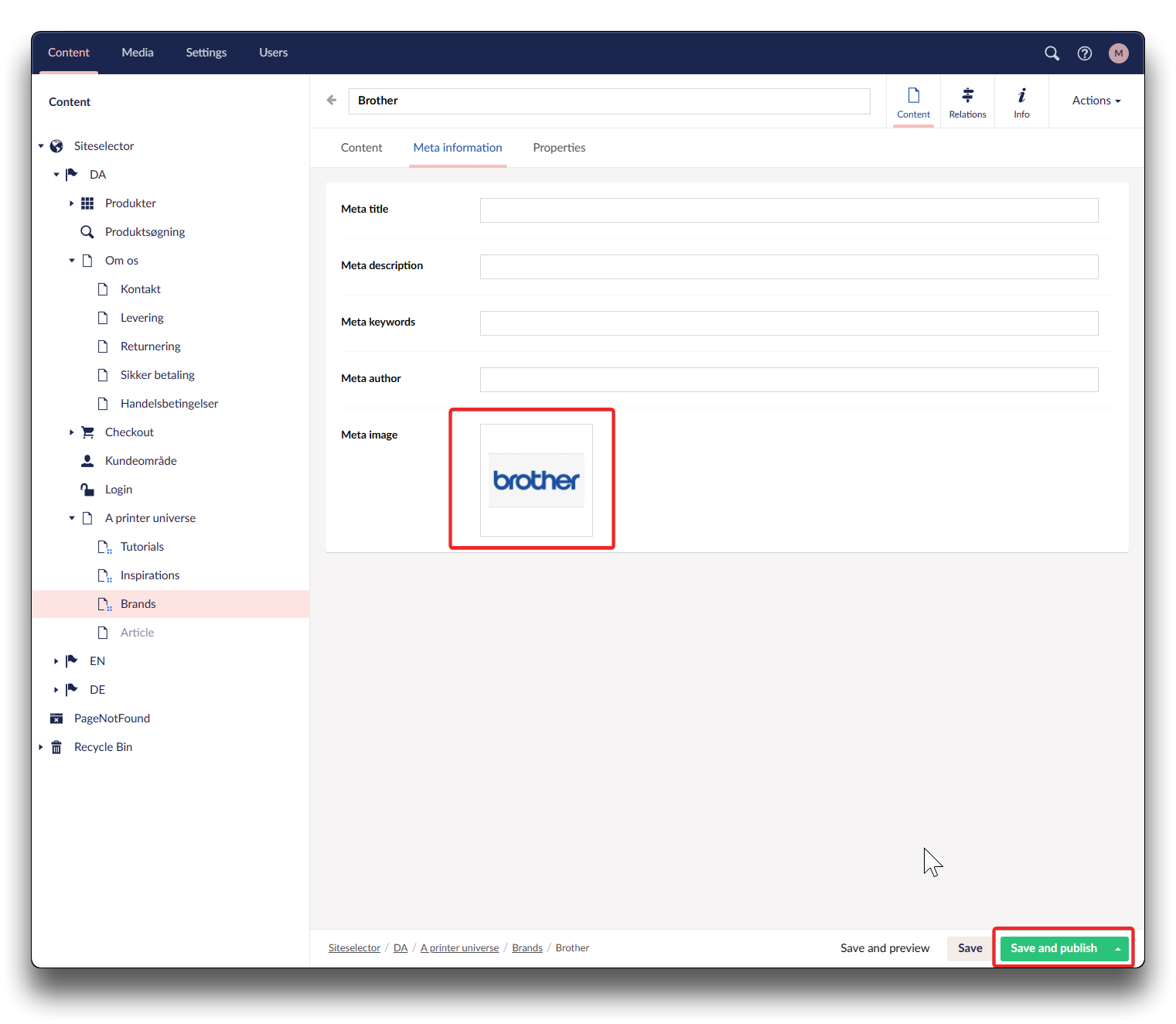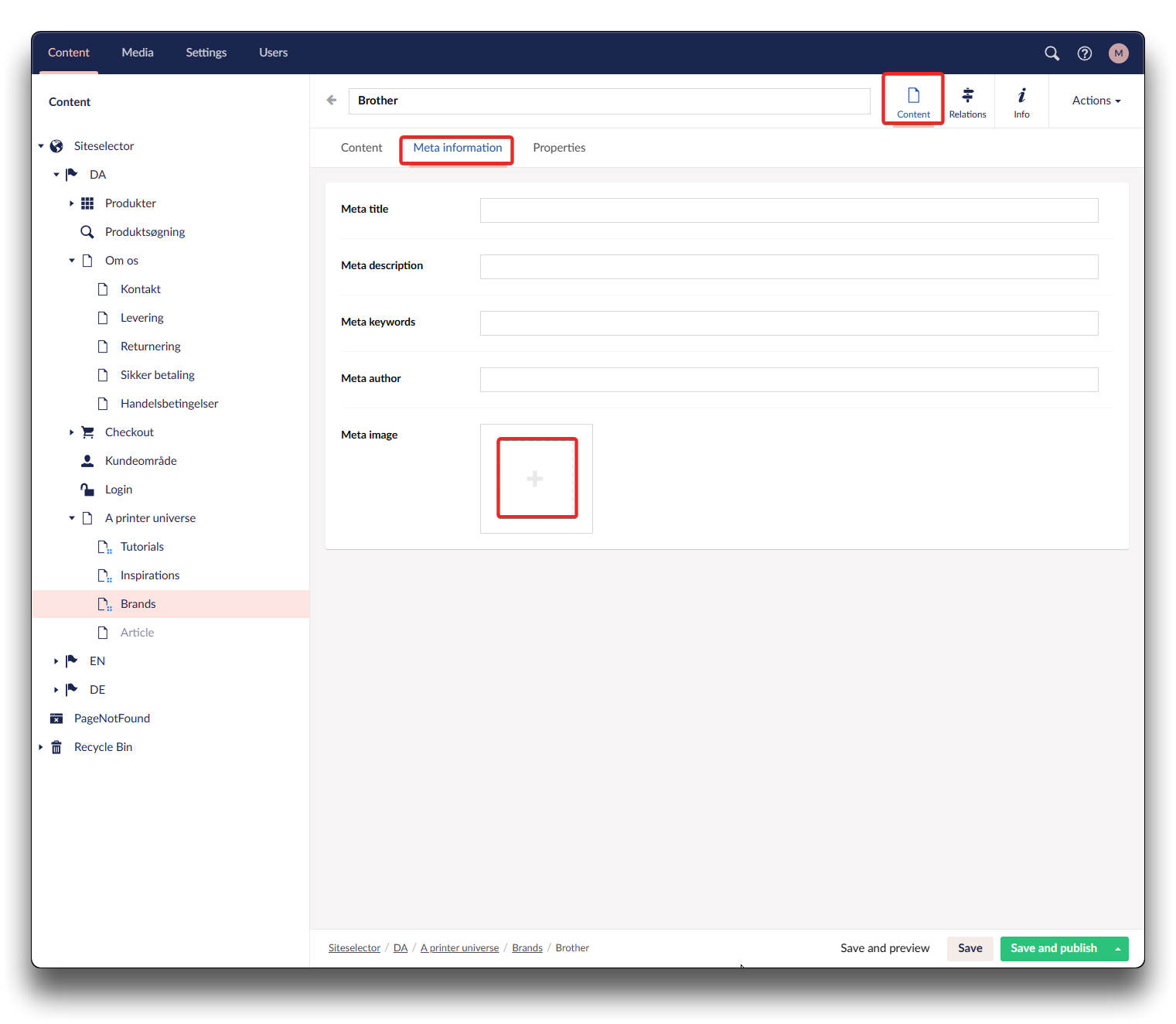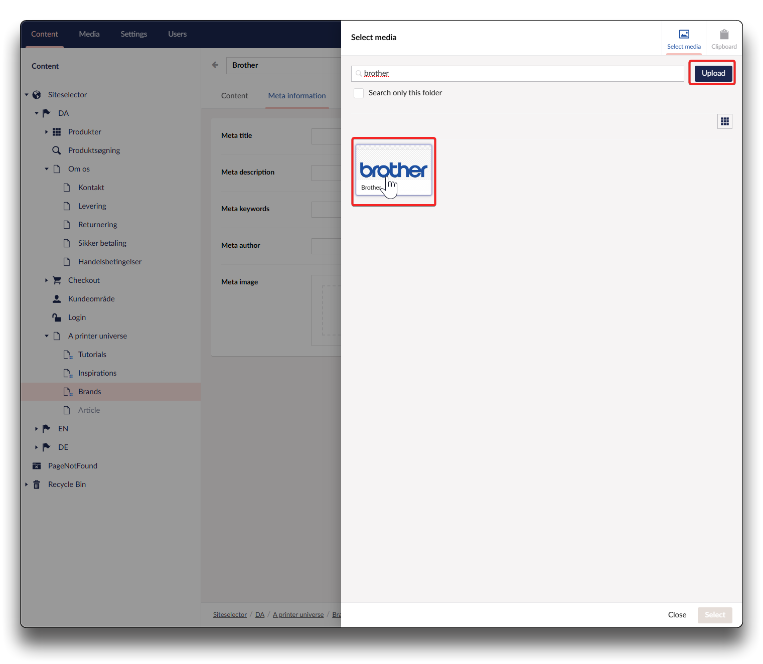 Click back on "Content" and "Meta information" and "Meta Image" to add a Brand logo. Choose the brand logo from your media gallery, or click Upload to browse your computer to upload picture. Select picture.