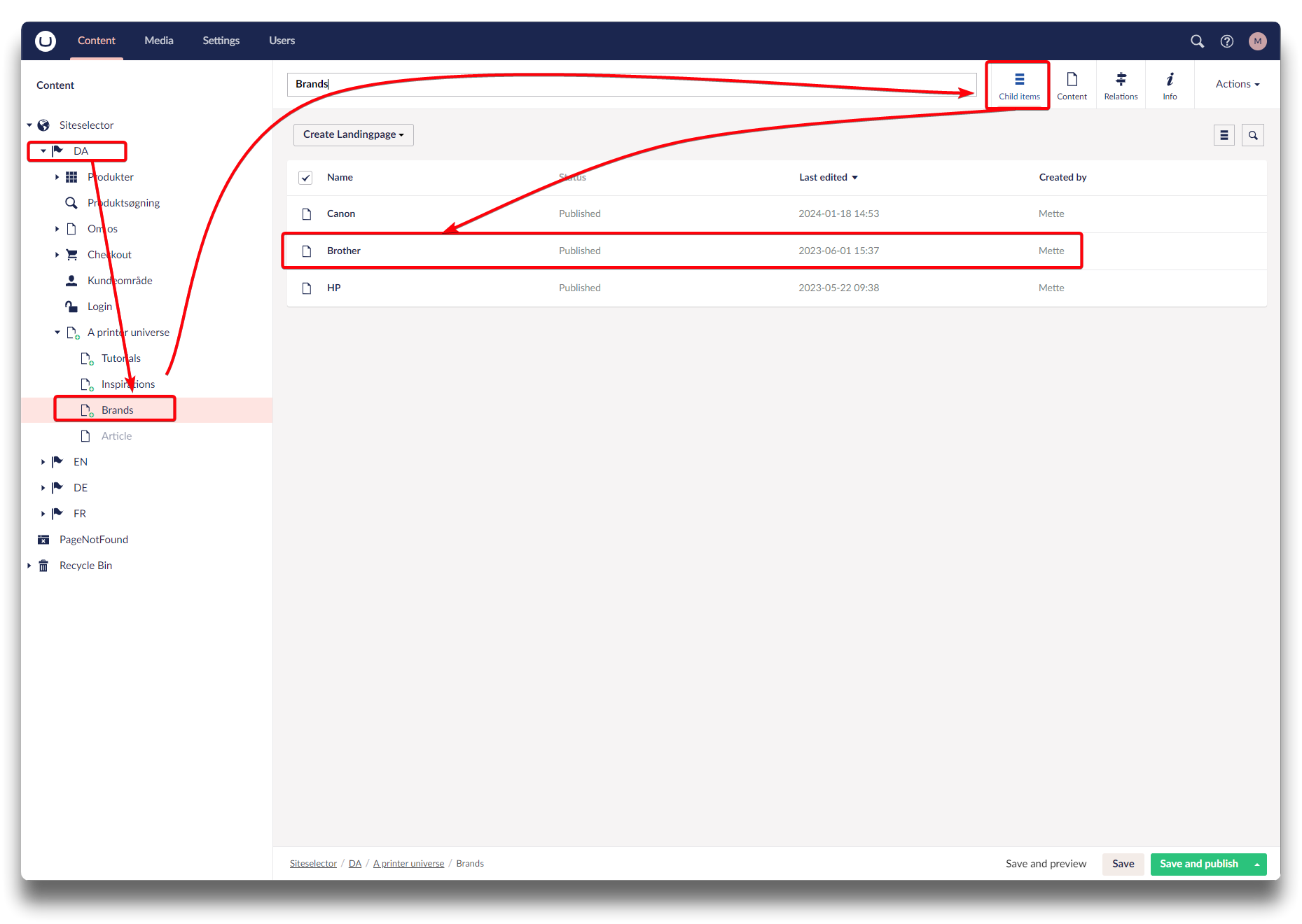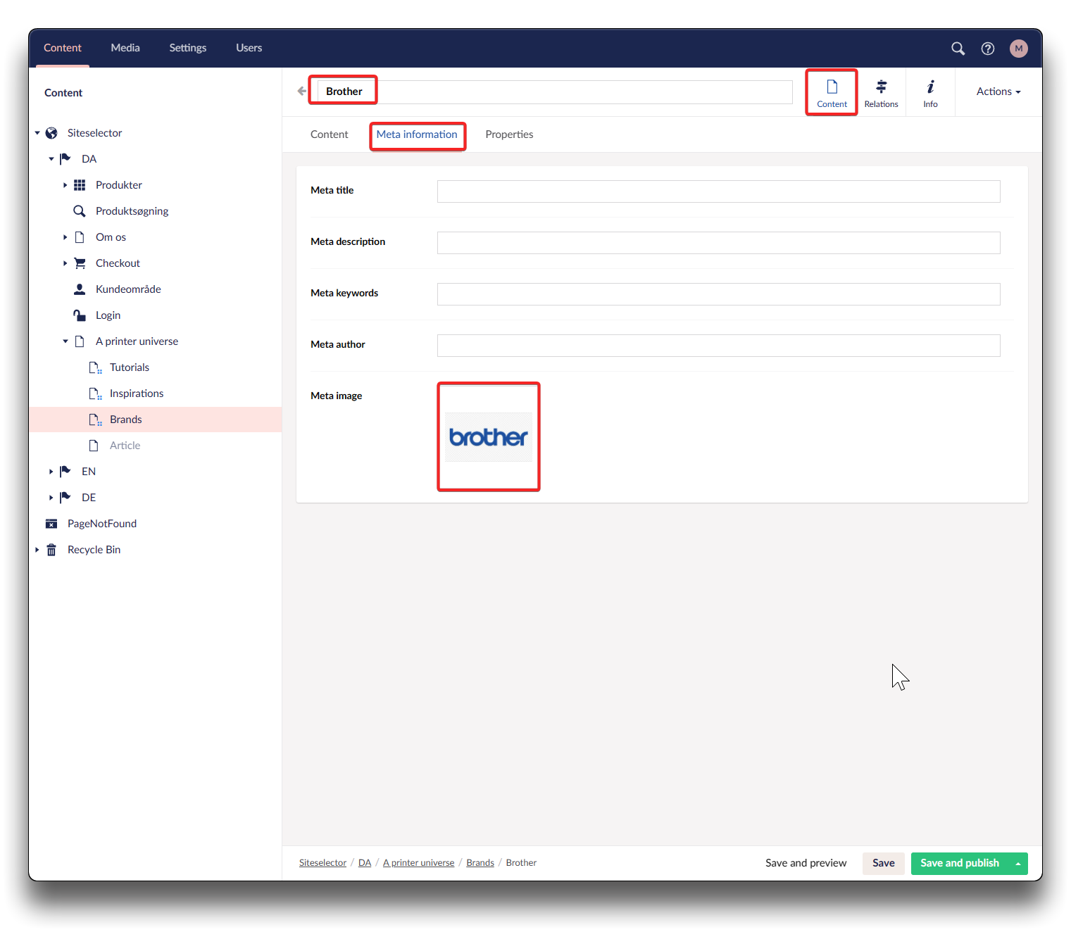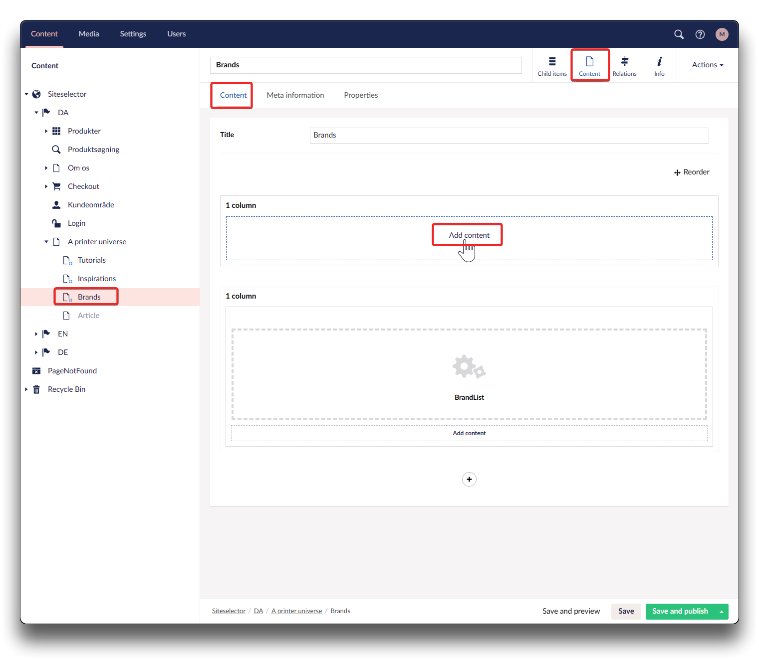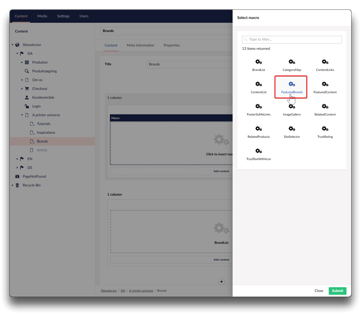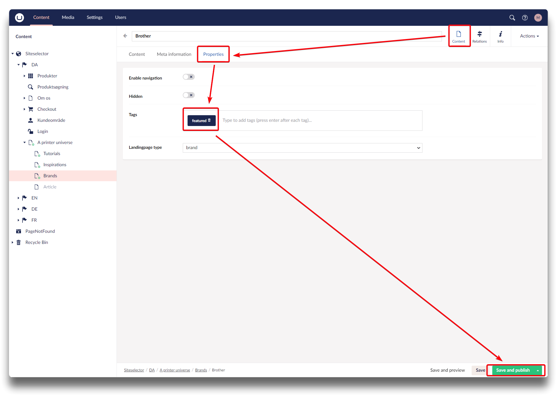 To mark specific Brands as featured, navigate to Umbraco, to your Brand collection, choose the specific brand to feature, go to Properties page and write "Featured" in Tags and click Save and Publish. Repeat the process with other Brands if multiple should be shown as Featured on Brand page.