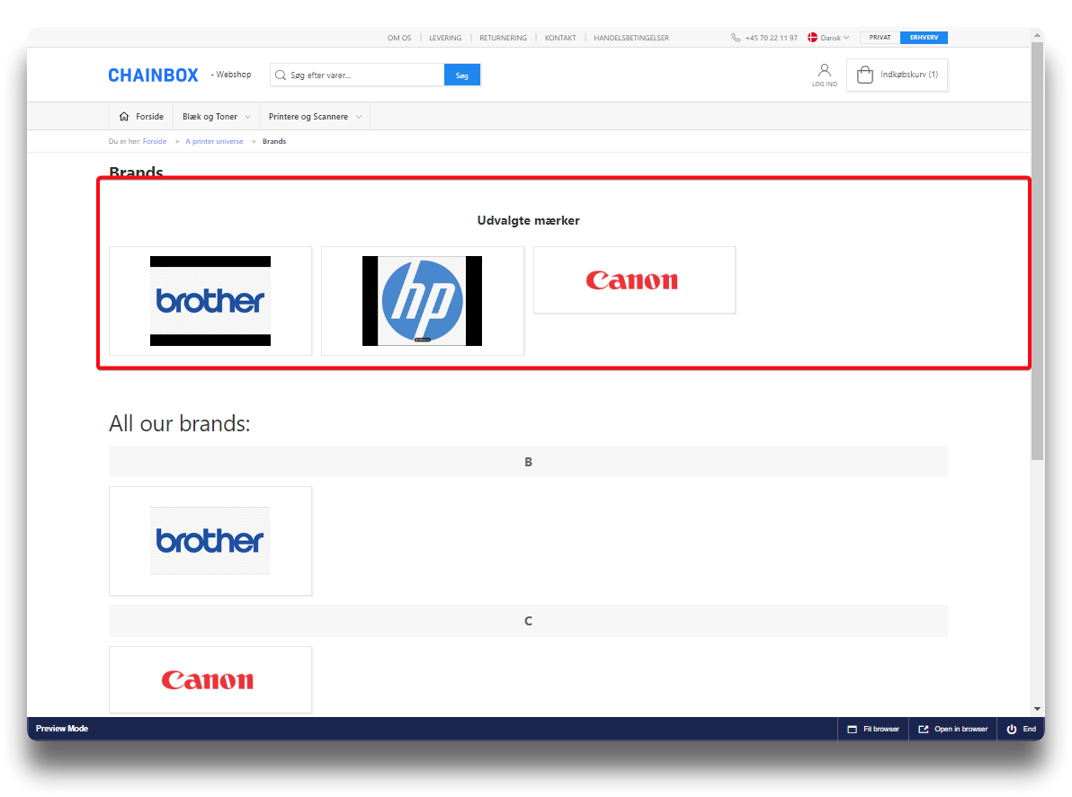 This feature is relevant for a brandpage with a very long brandlist. It gives the option to present a fewer number of brands in a featured position. Same as the brandlist, the featured brands provides navigation to a specific brand-page when clicked.