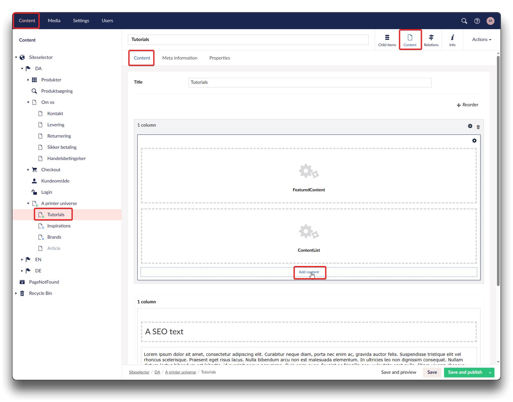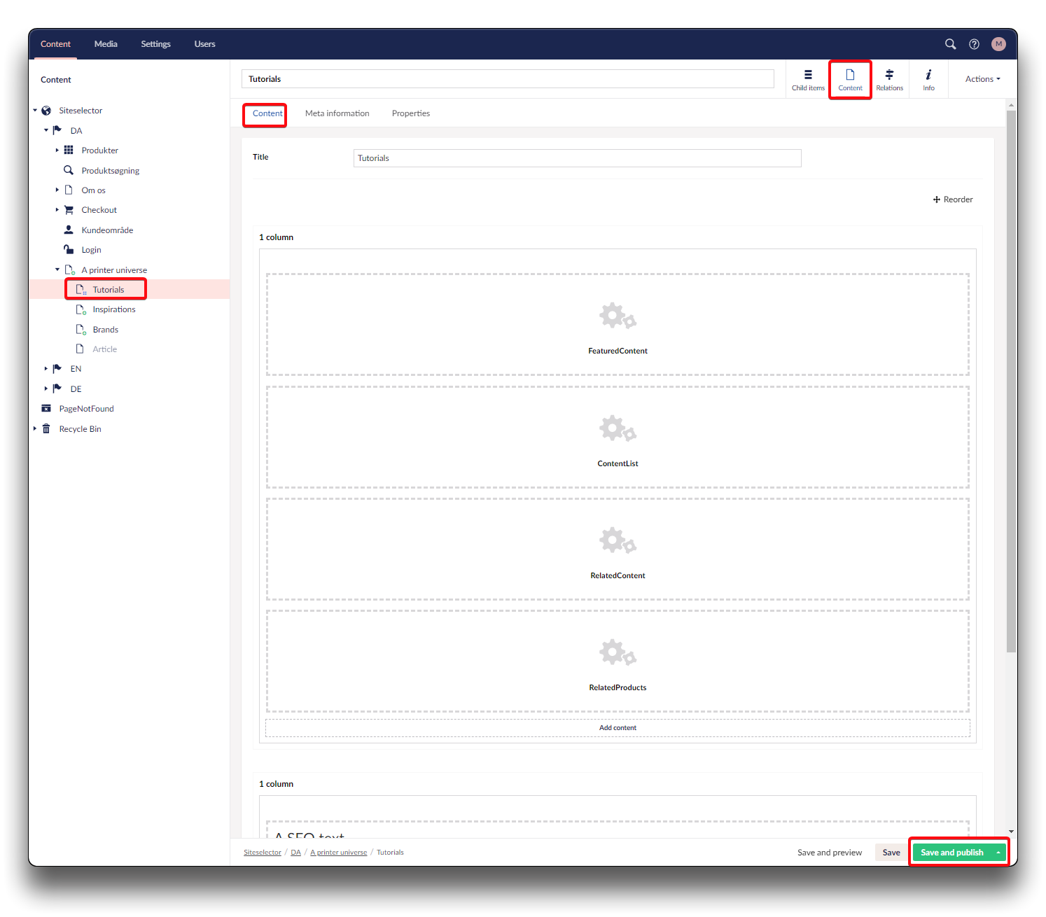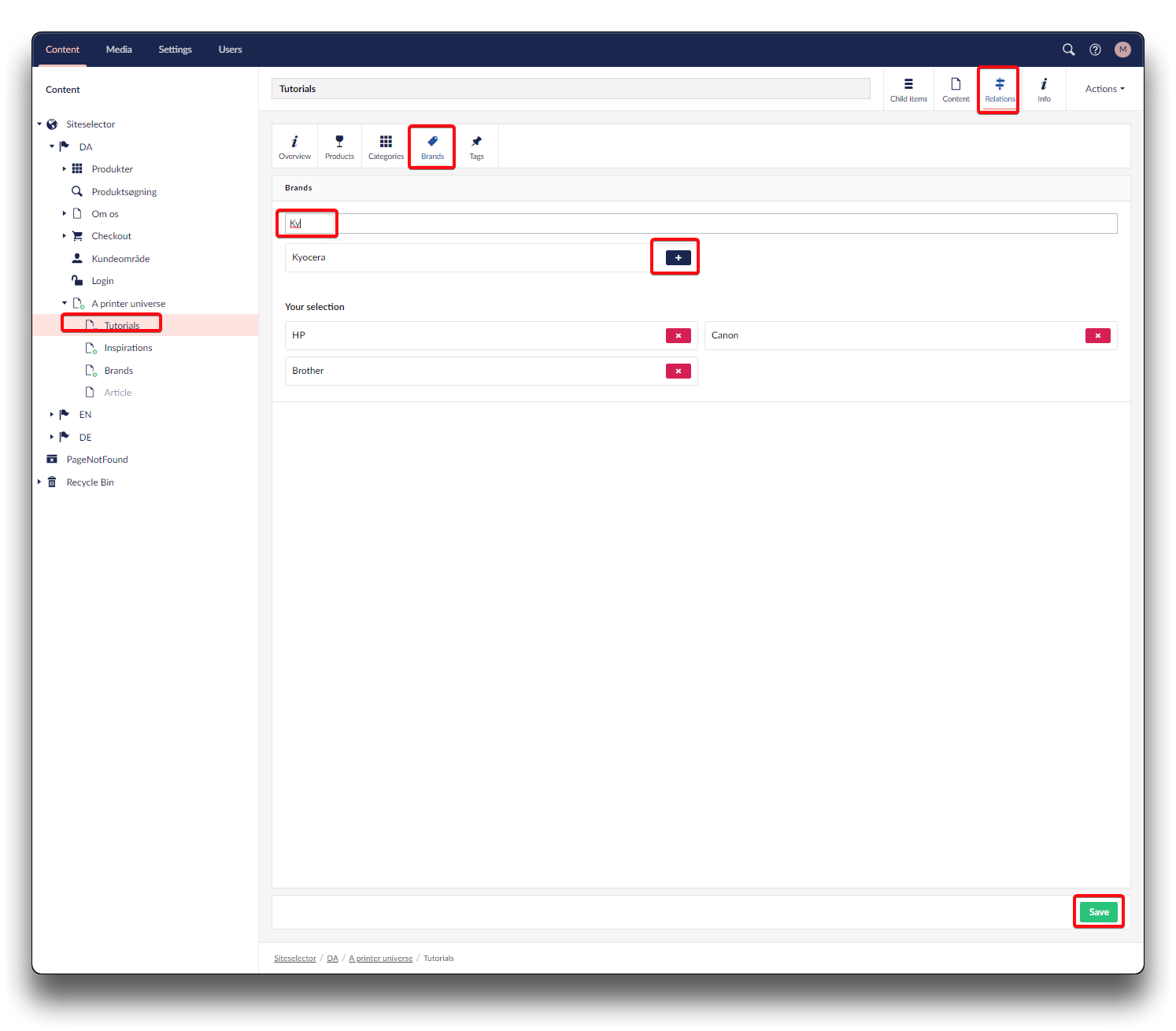 Search brand, click "+" to add brand as related. Click "Save" when done. Return to Content page and click "Save and publish".