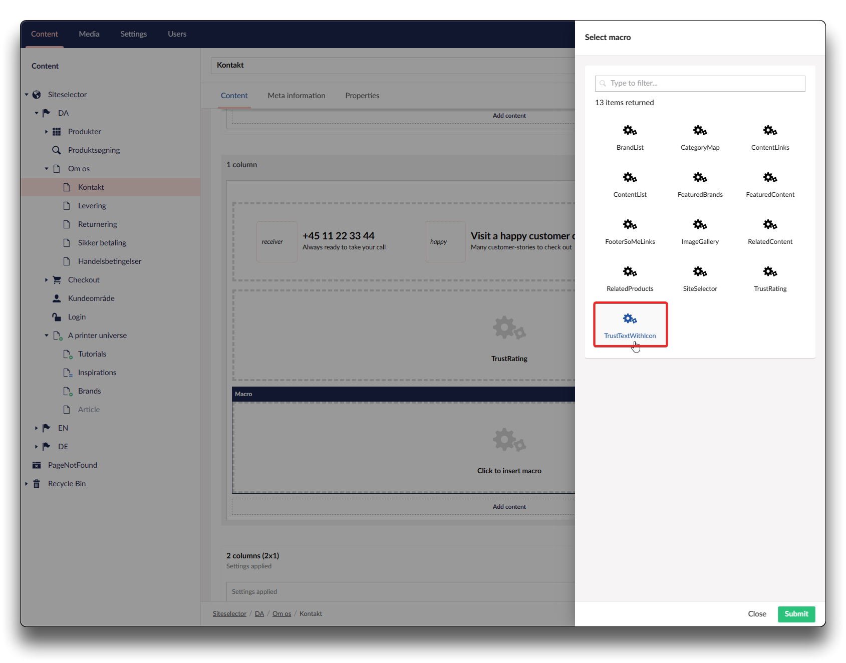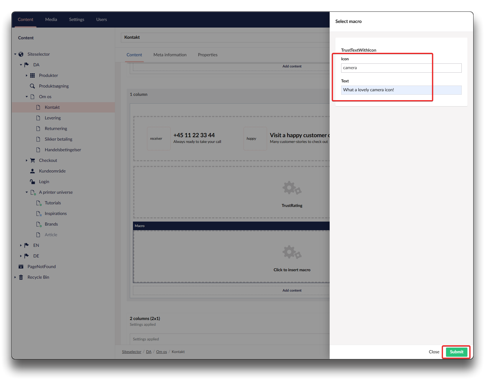 Choose "TrustTextWithIcon", insert your Icon-name and an appropriate text. Click "Submit" and "Save and publish"