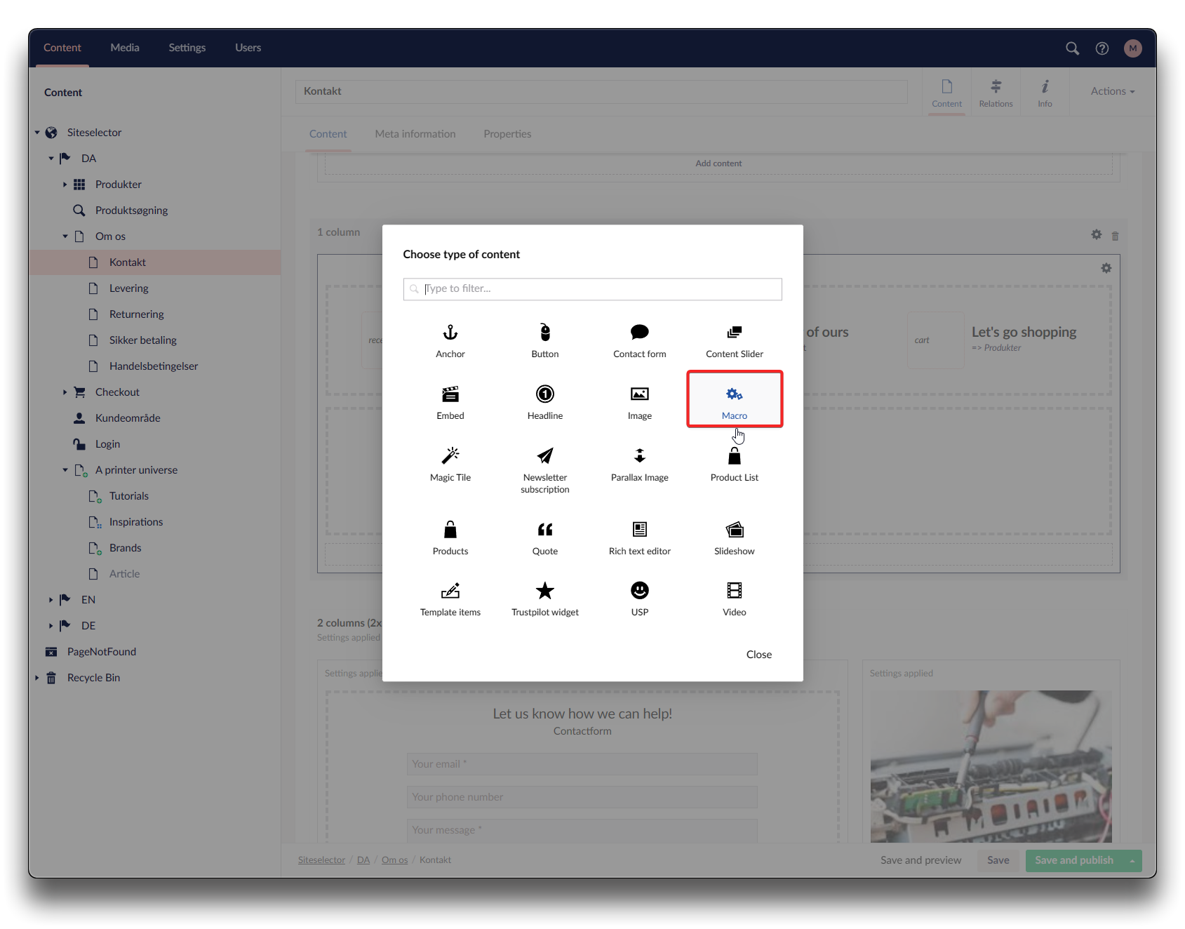 Click "Add content" and choose "Macro"