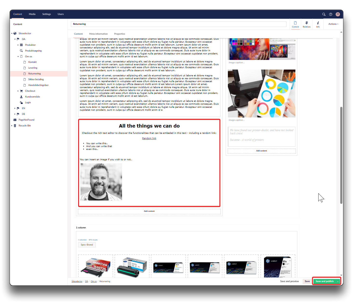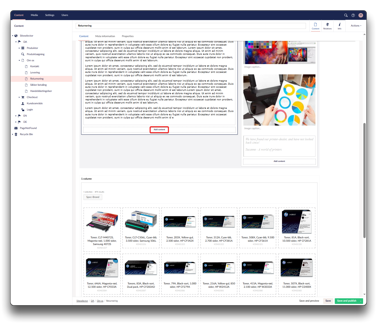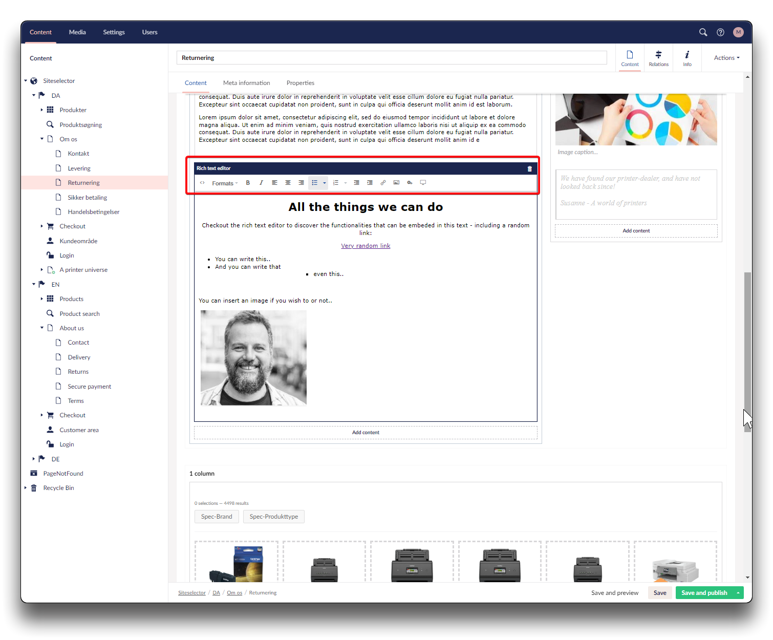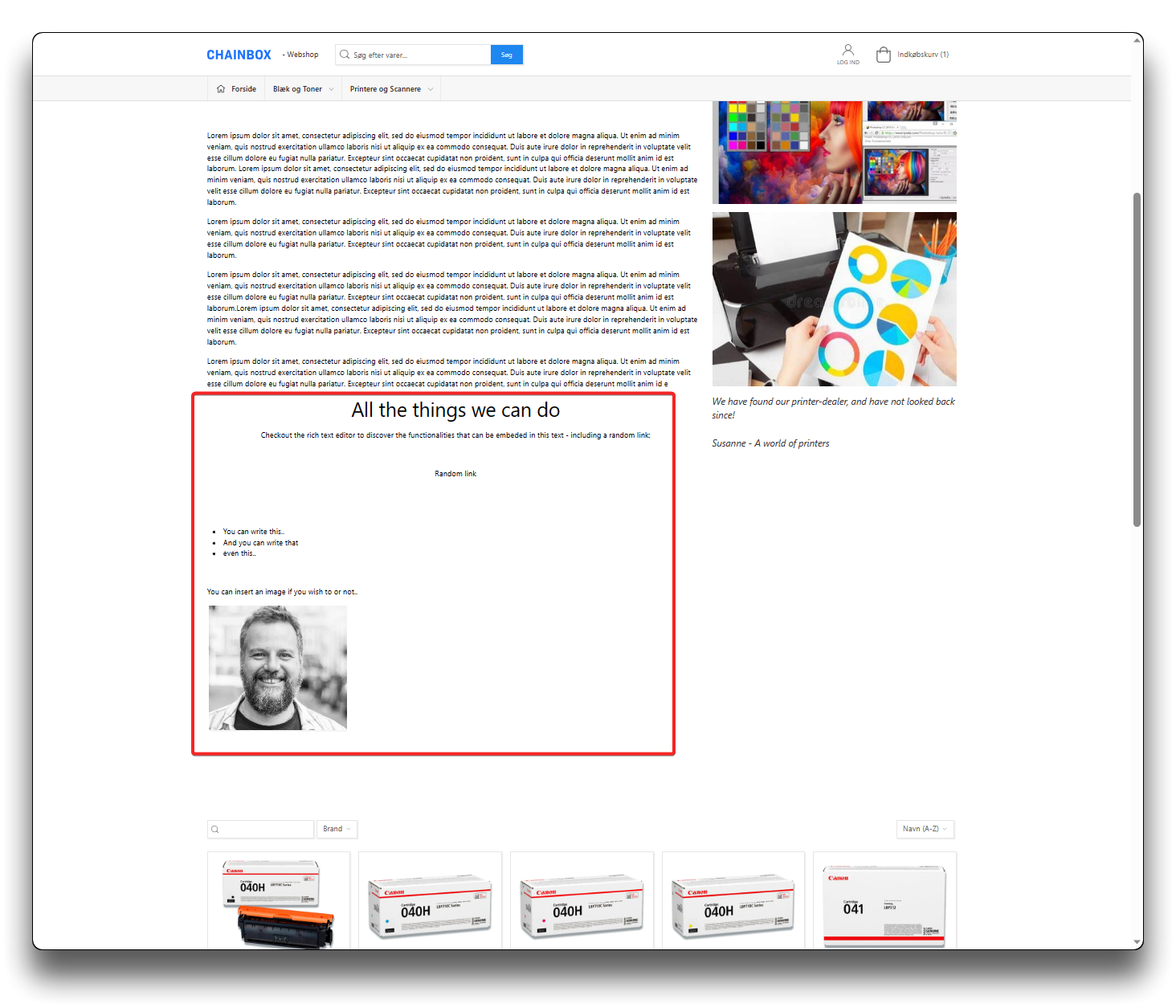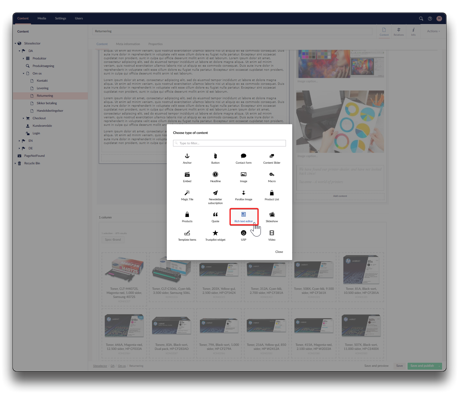 Richtext editor Click "Add content" in your selected column Add richtext editor - step 1 Add richtext editor - step 2 Add your text and elements and click "Save and publish". Add richtext editor - step 3 Result on Webshop Use the top navigation items to be creative, including "View sourcecode" (<>) Rich text editor editing panel Previous Quote Next Content templates