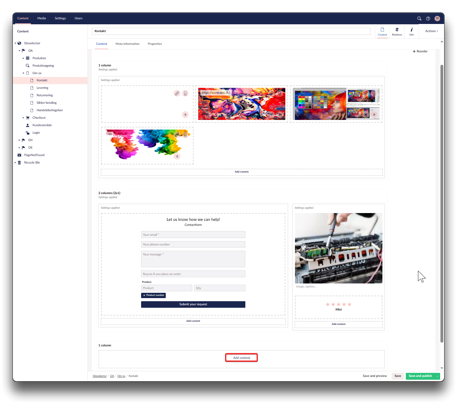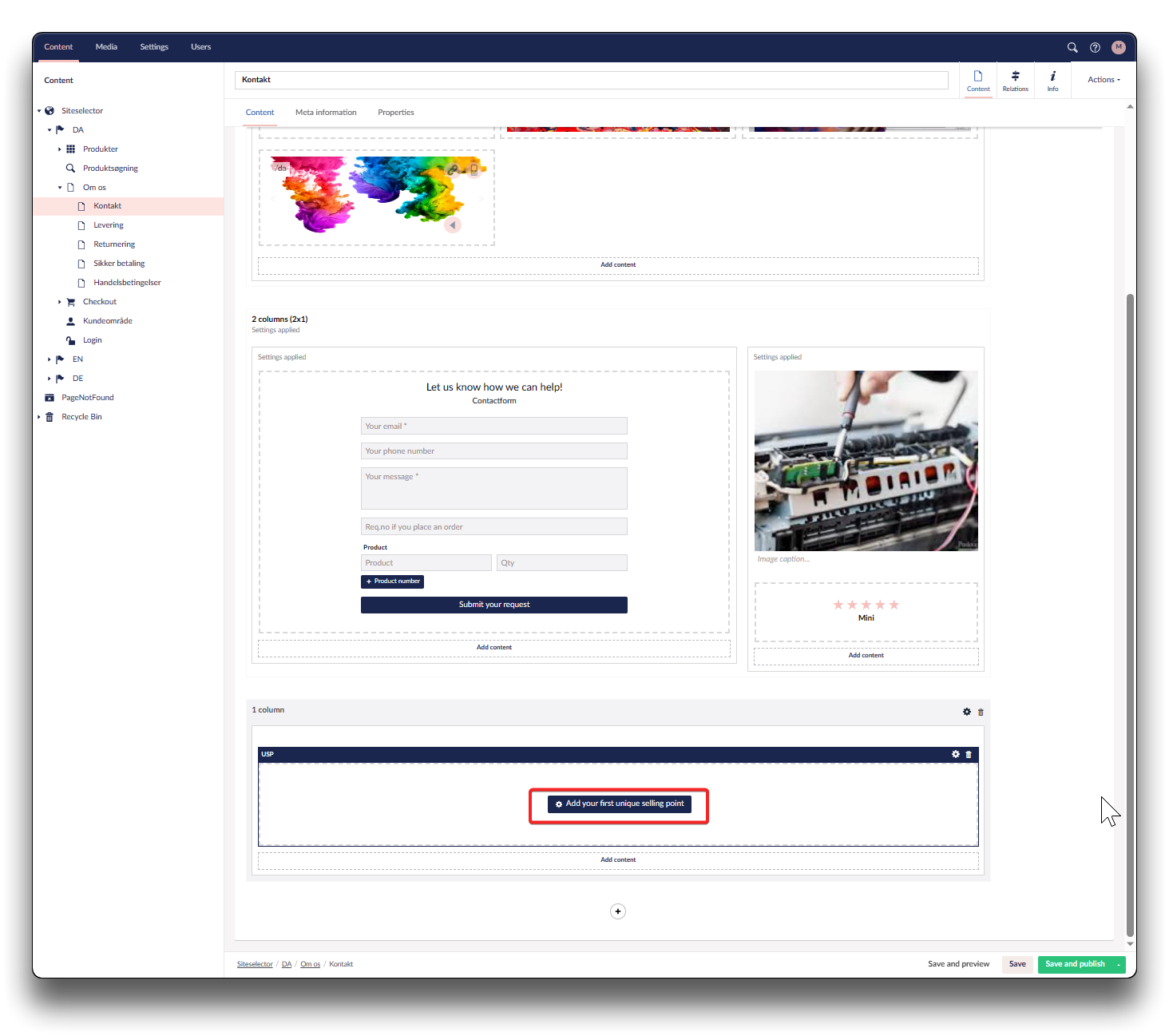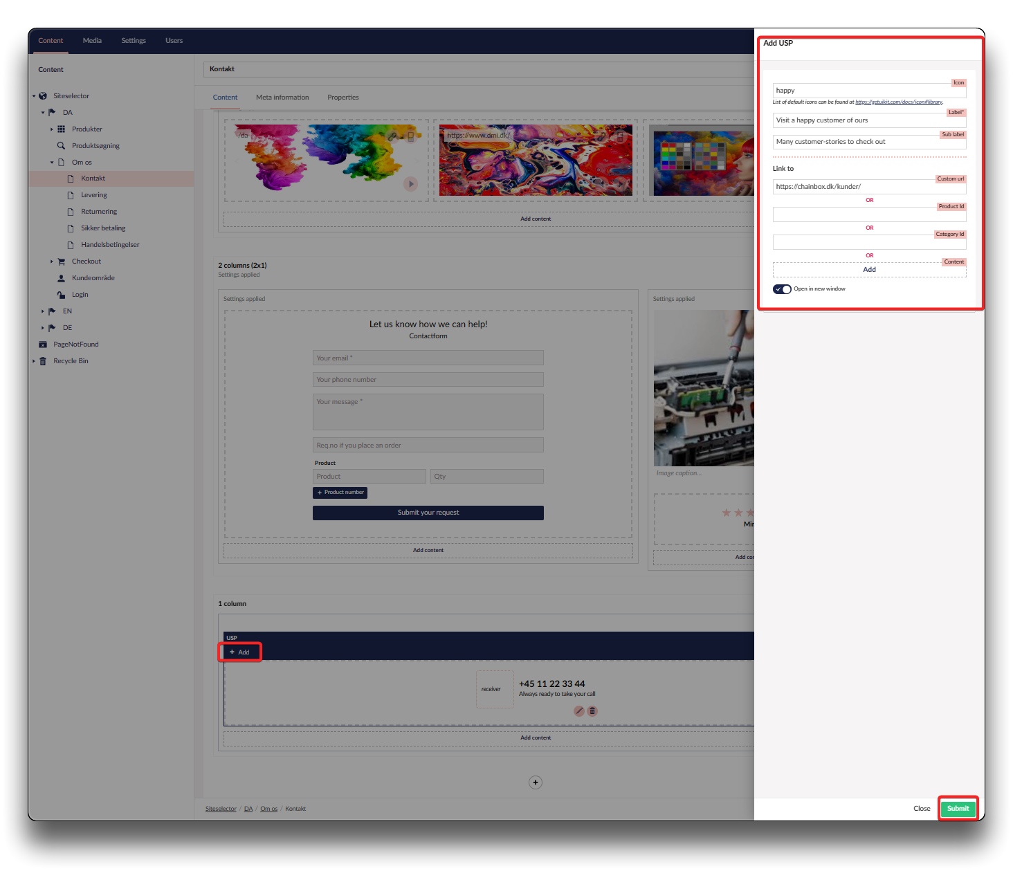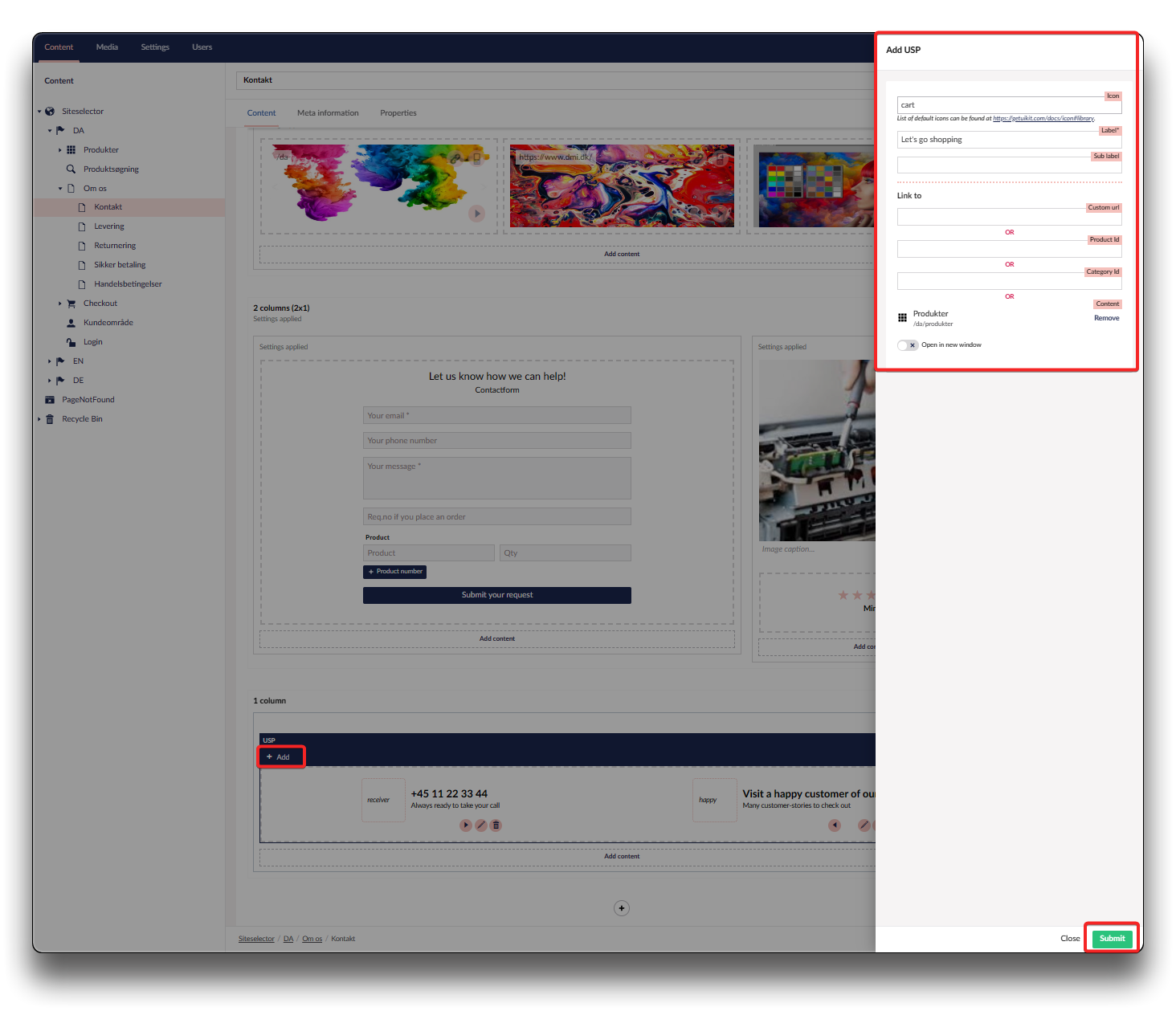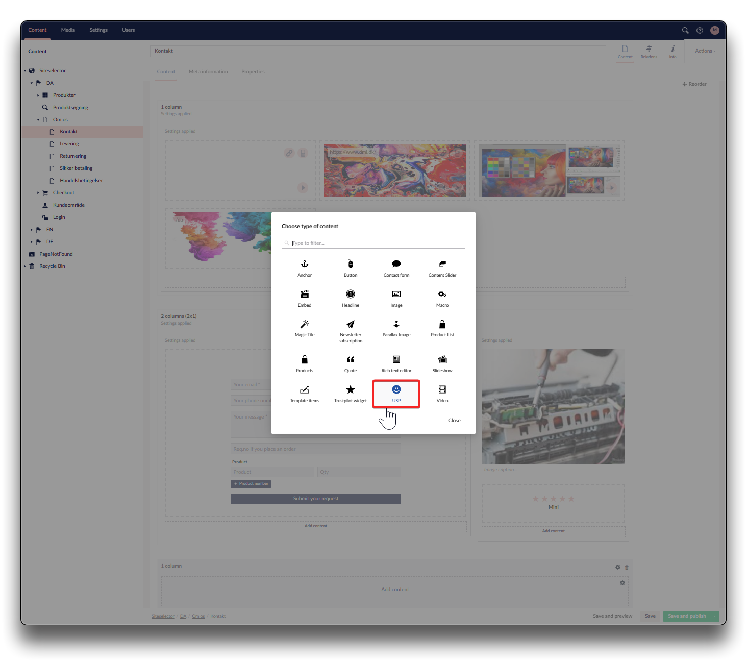 Click "Add content" in your selected column. Choose the "USP" icon.