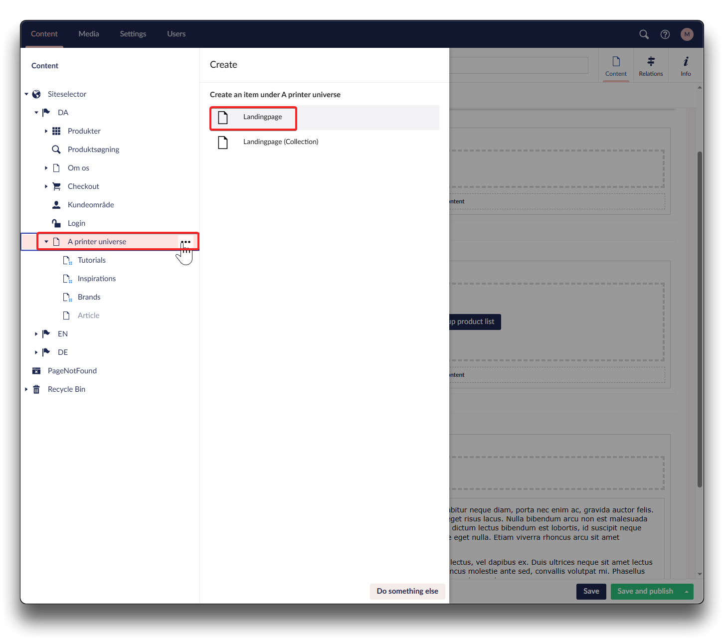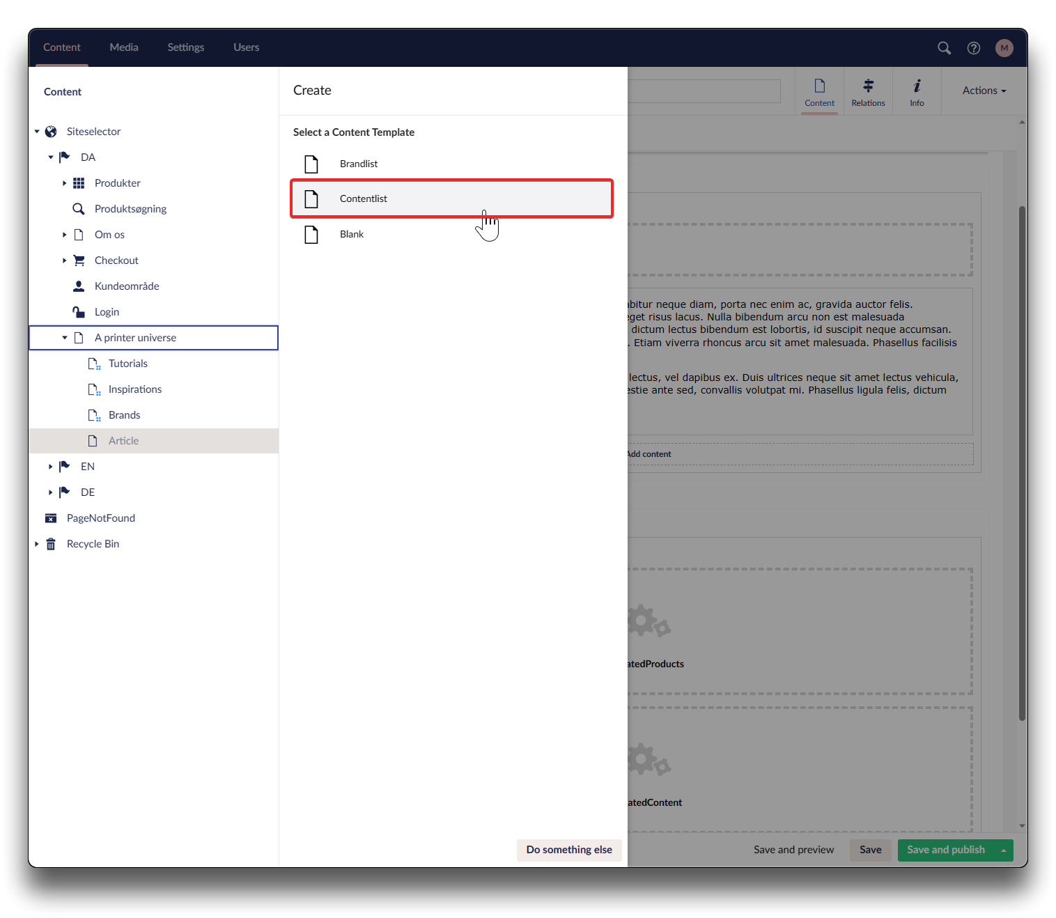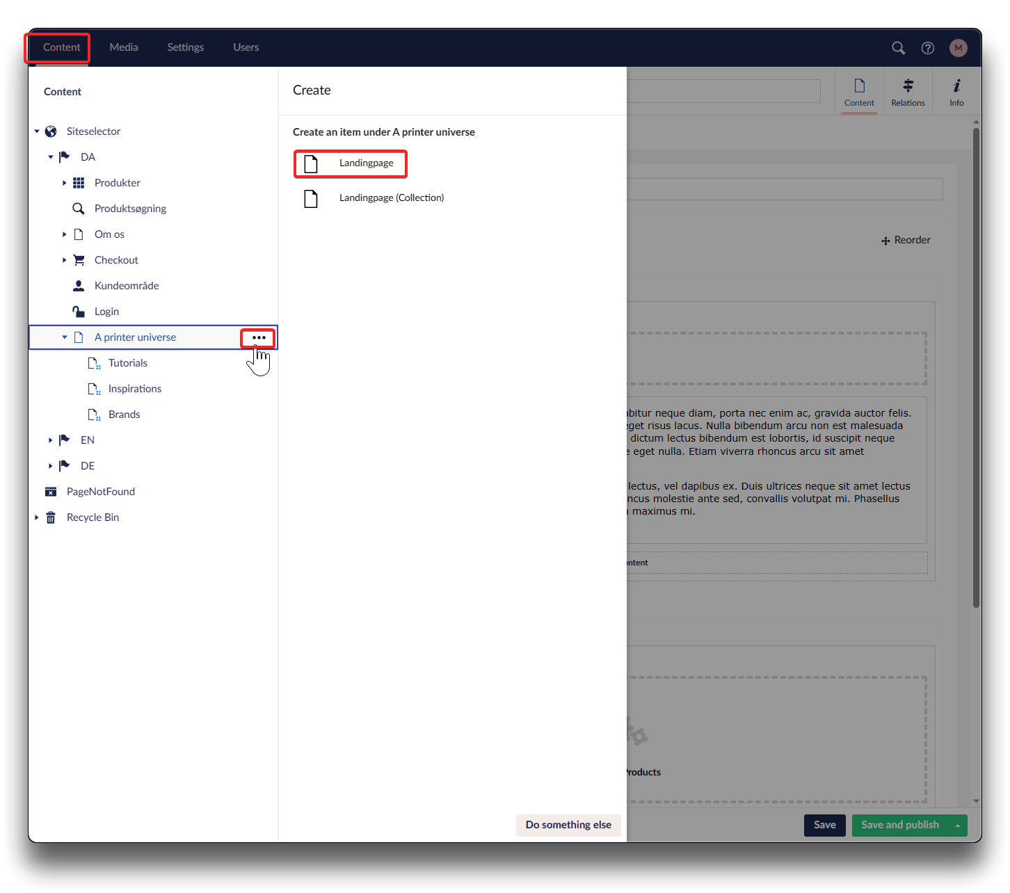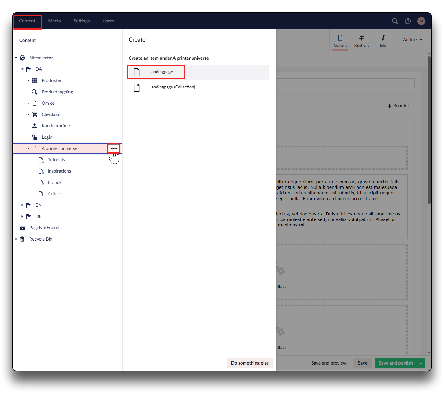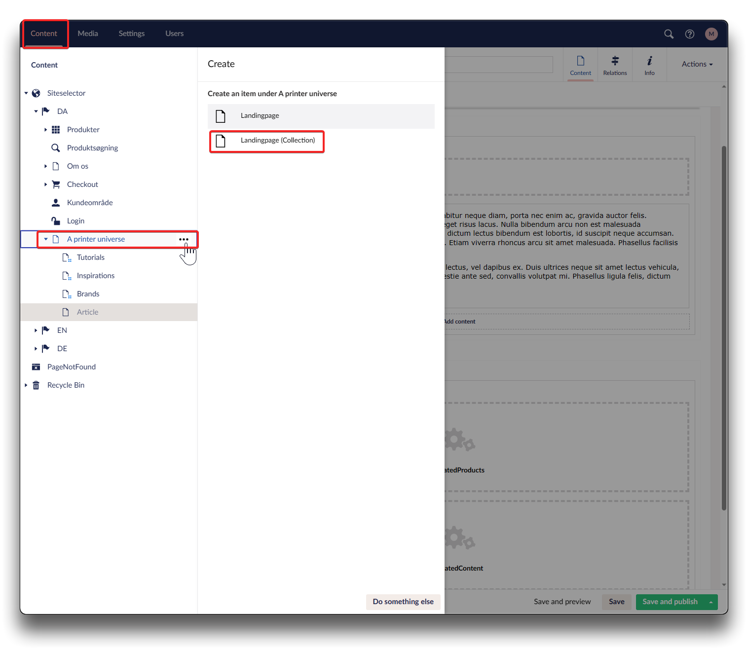 The Contentlist template for Landingpage (Collection) contains three elements, each explained in the below pages: