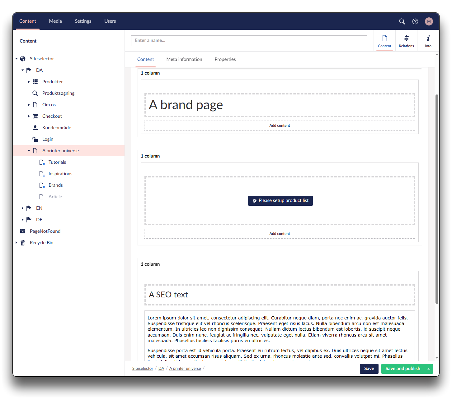 A Brand page consists of three elements (Headline appears twice, also as option to enter SEO text lower on the page). Each explained on the pages below: