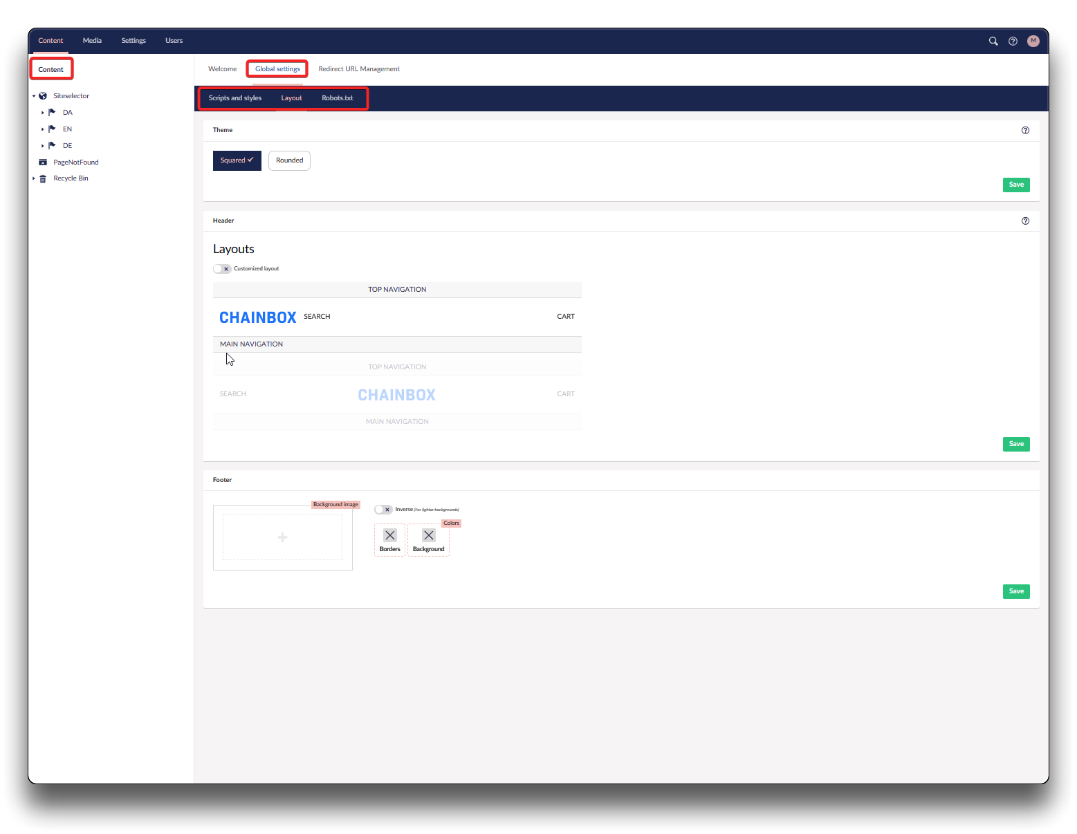 Global settings This section manages the overall layout settings for your webshop across all language nodes under the Site Selector. How to navigate to Global settings Previous Debug Next Layout
