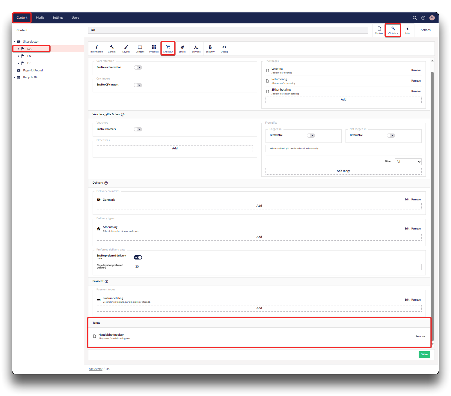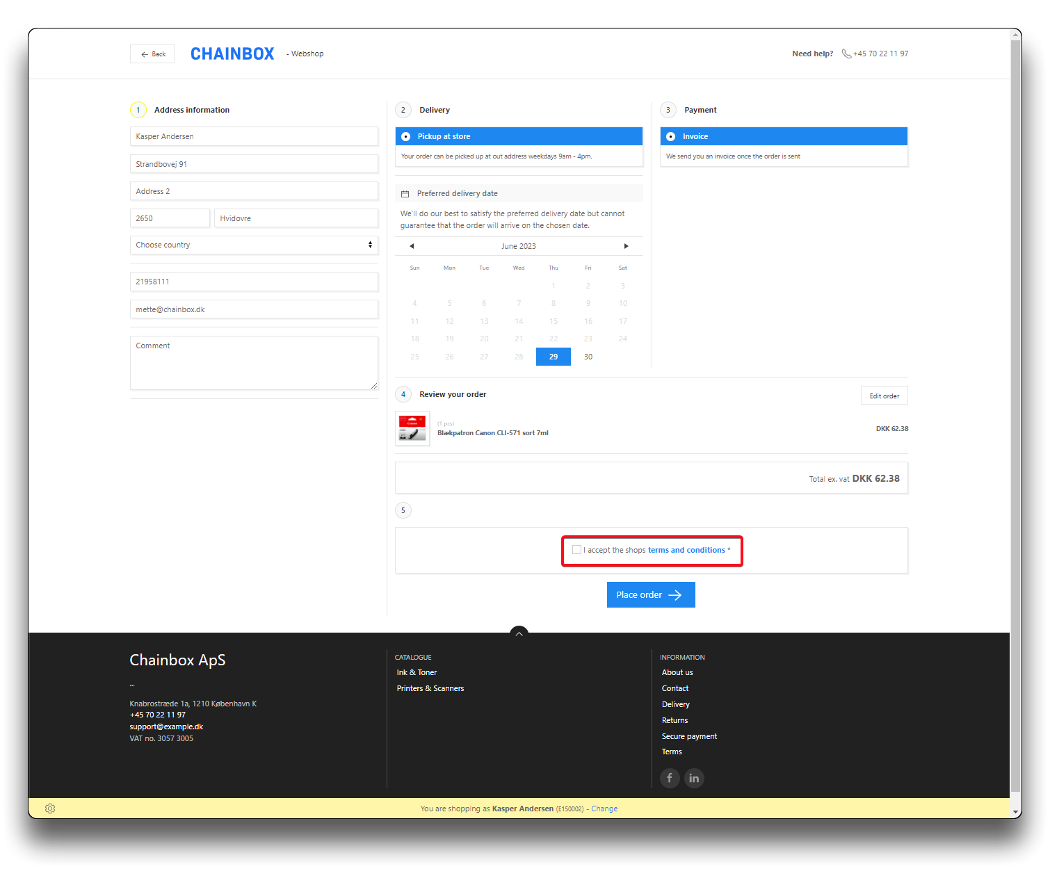 Terms configuration The "Terms" page is linked default to the shipping and billing page, where the customer accepts terms and conditions. How to navigate to terms Acceptance of terms and conditions Previous Paymentmethod setup Next Emails