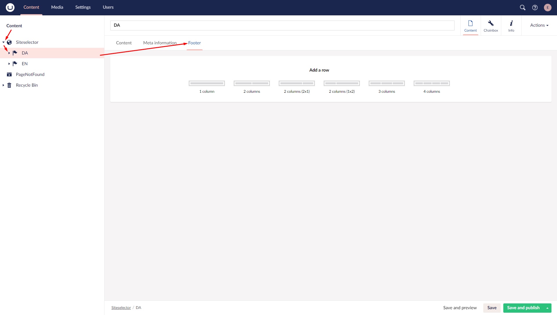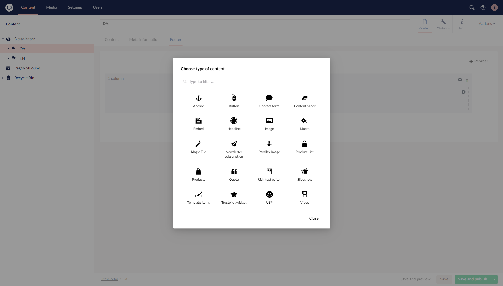 This also means that there are multiple options for designing your website footer, which is built via our "Type of content" selection.