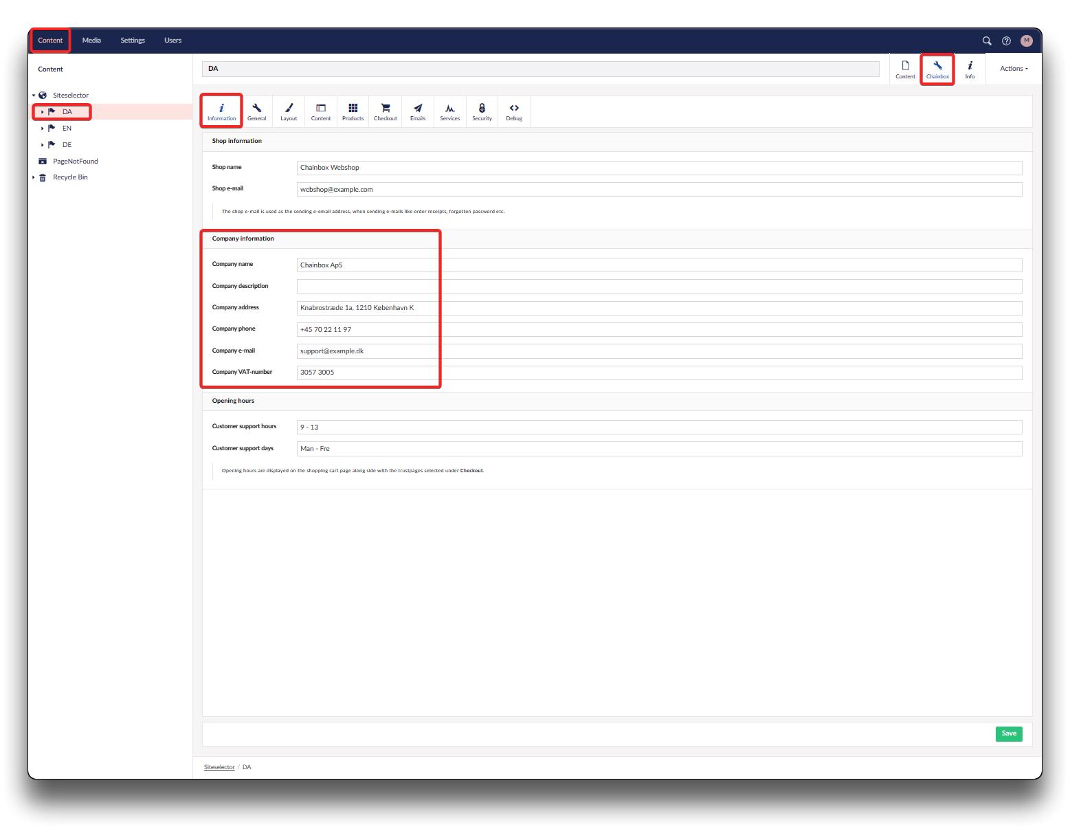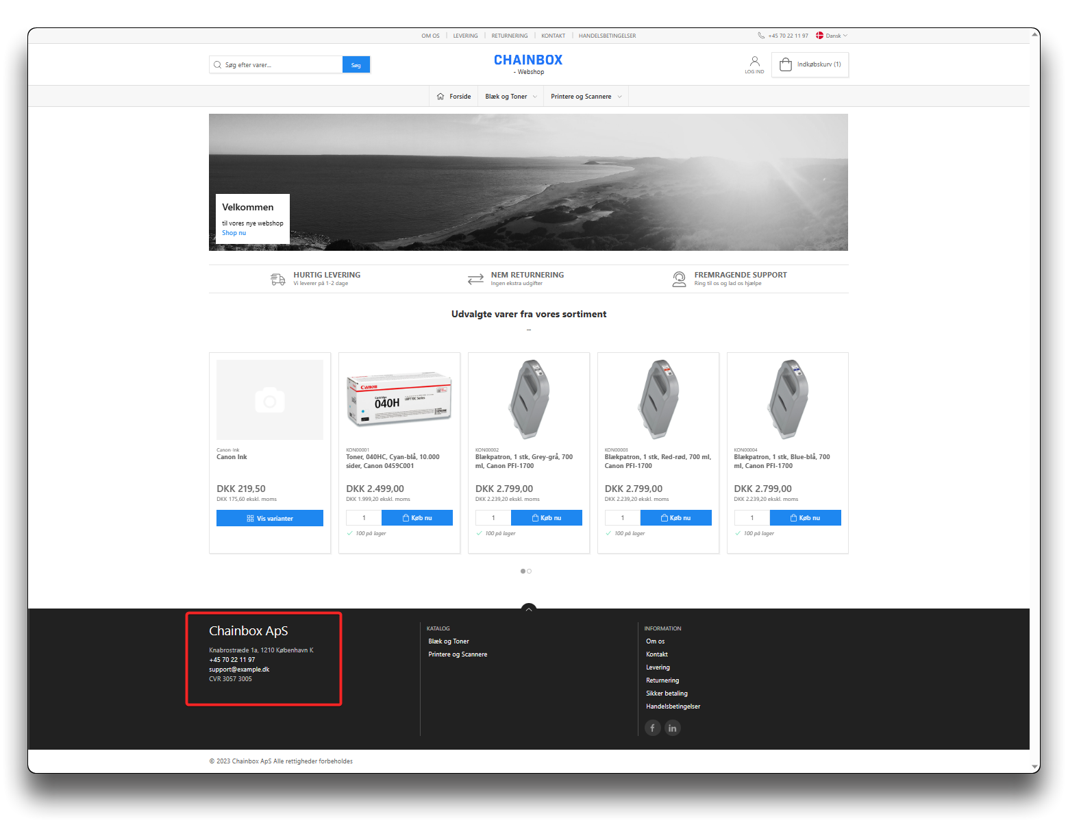 Company information settings The company information you enter here, will be displayed in the footer of your webshop. How to navigate to company information settings Company information displayed on webshop Previous Shop information settings Next Primary layout colors and Favicon