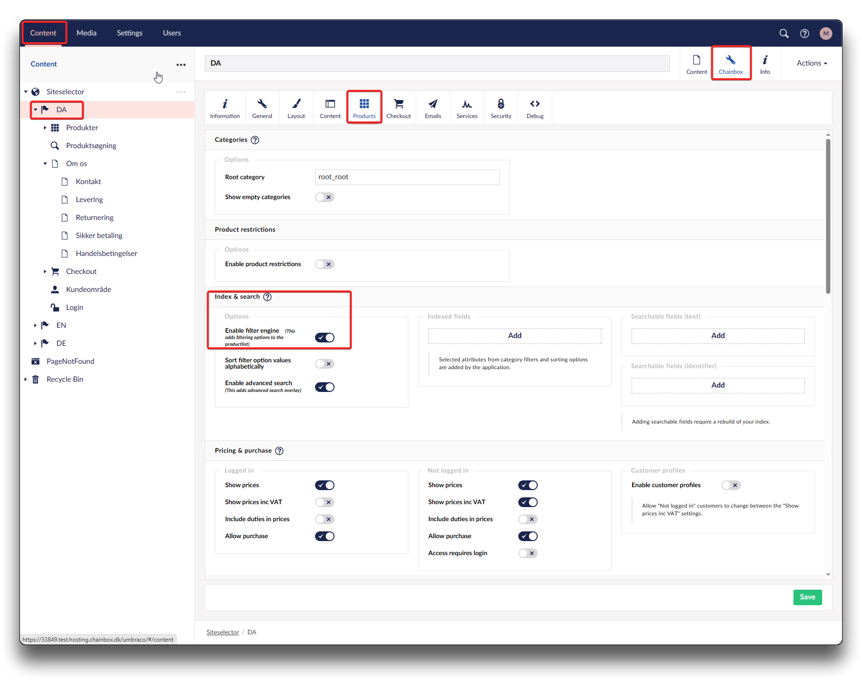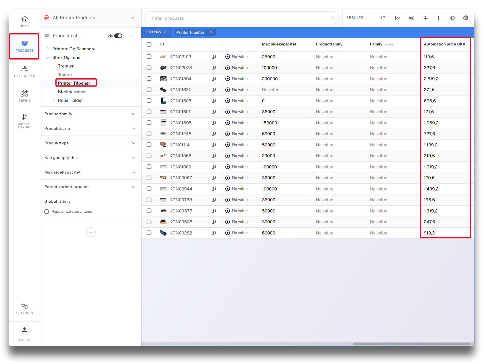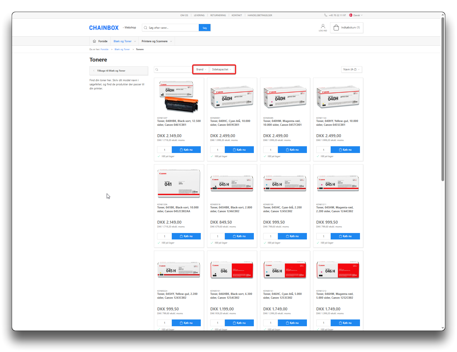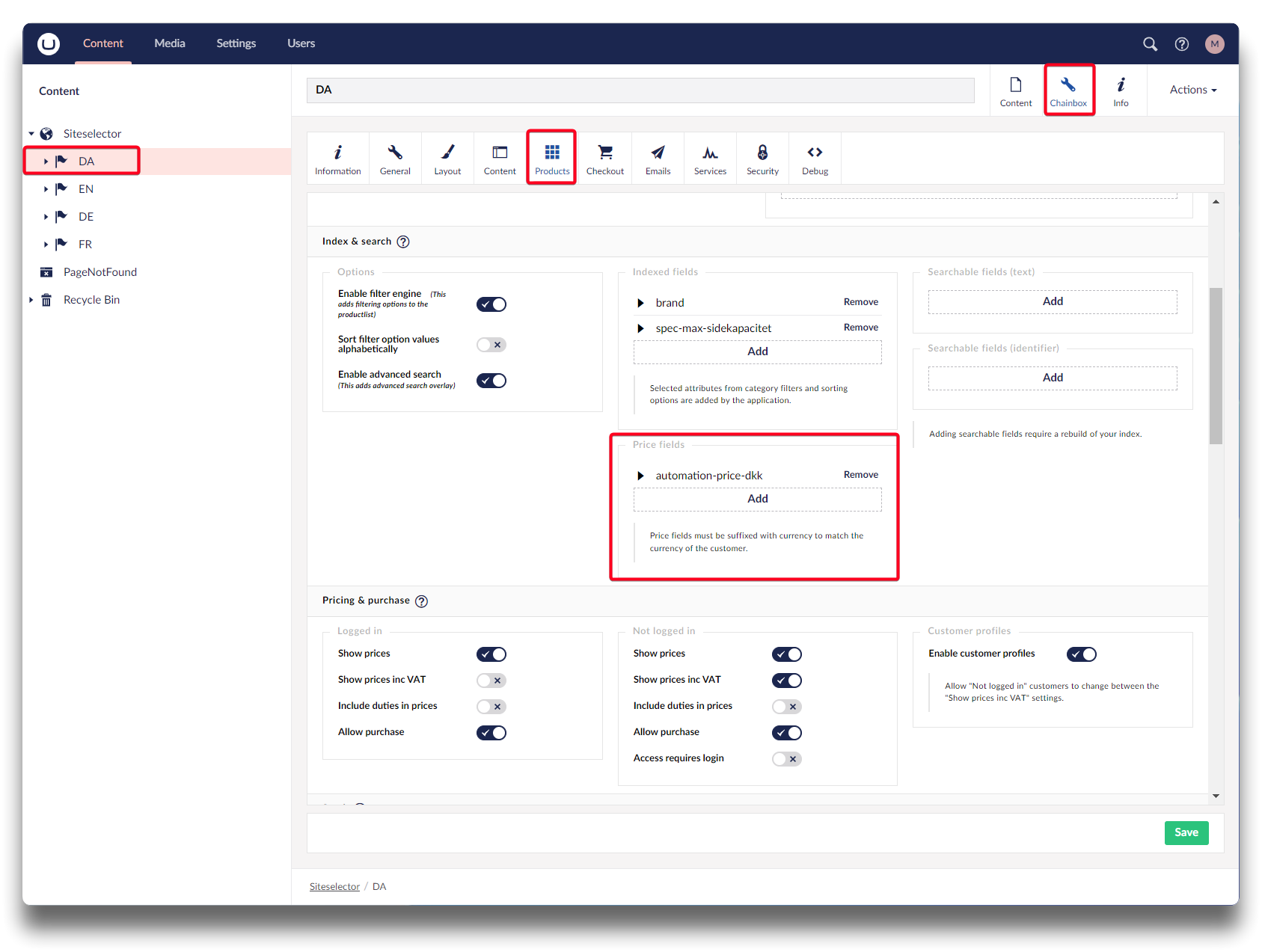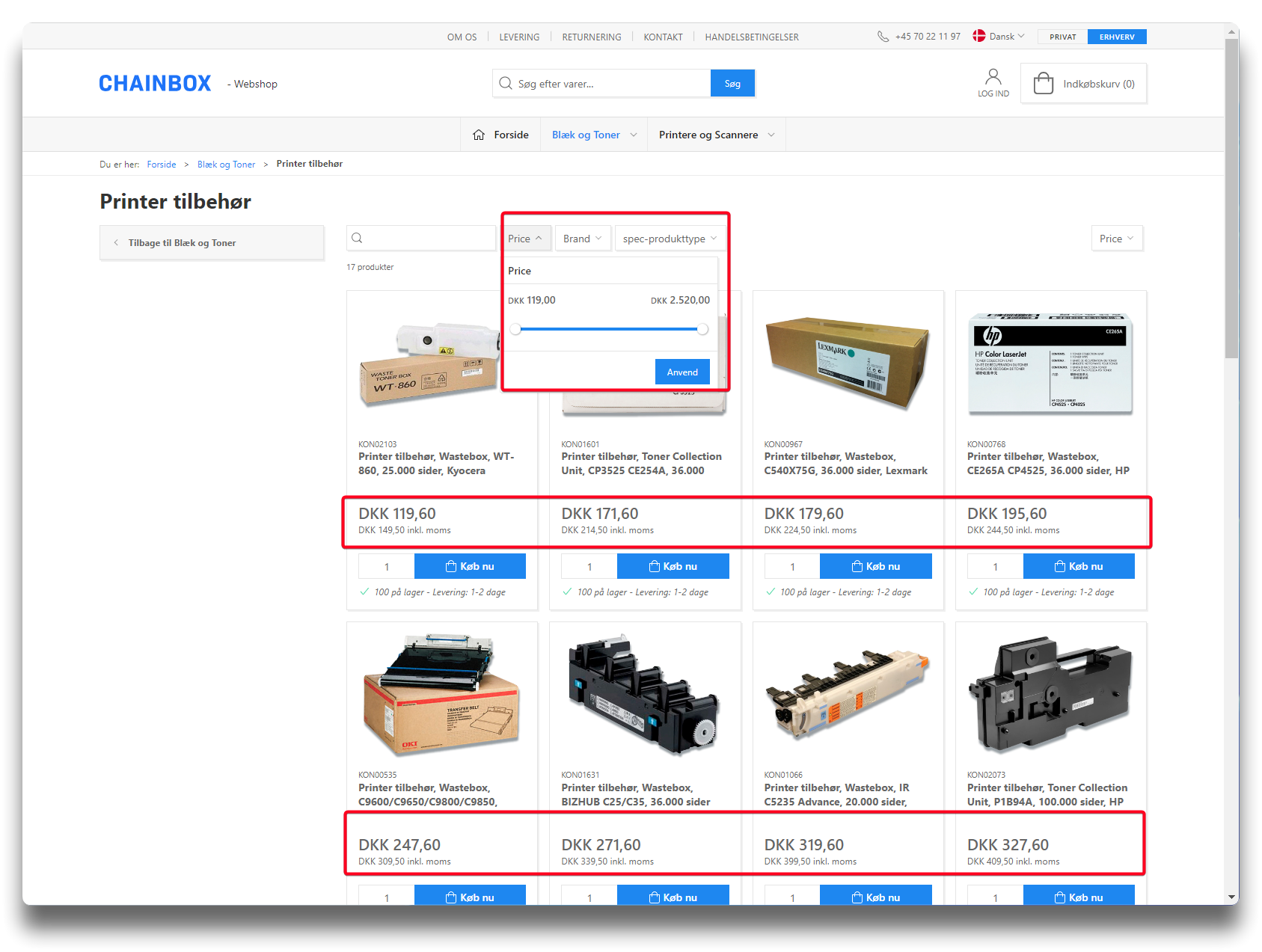 If the price ex.vat needs to be be calculated through the priceengine, another attribute filter field most be created per currency, where the calculated price for the specific customer can be displayed. Chainbox will setup a worker up to contact API for calculations of customer prices, discounts and vat-settings.